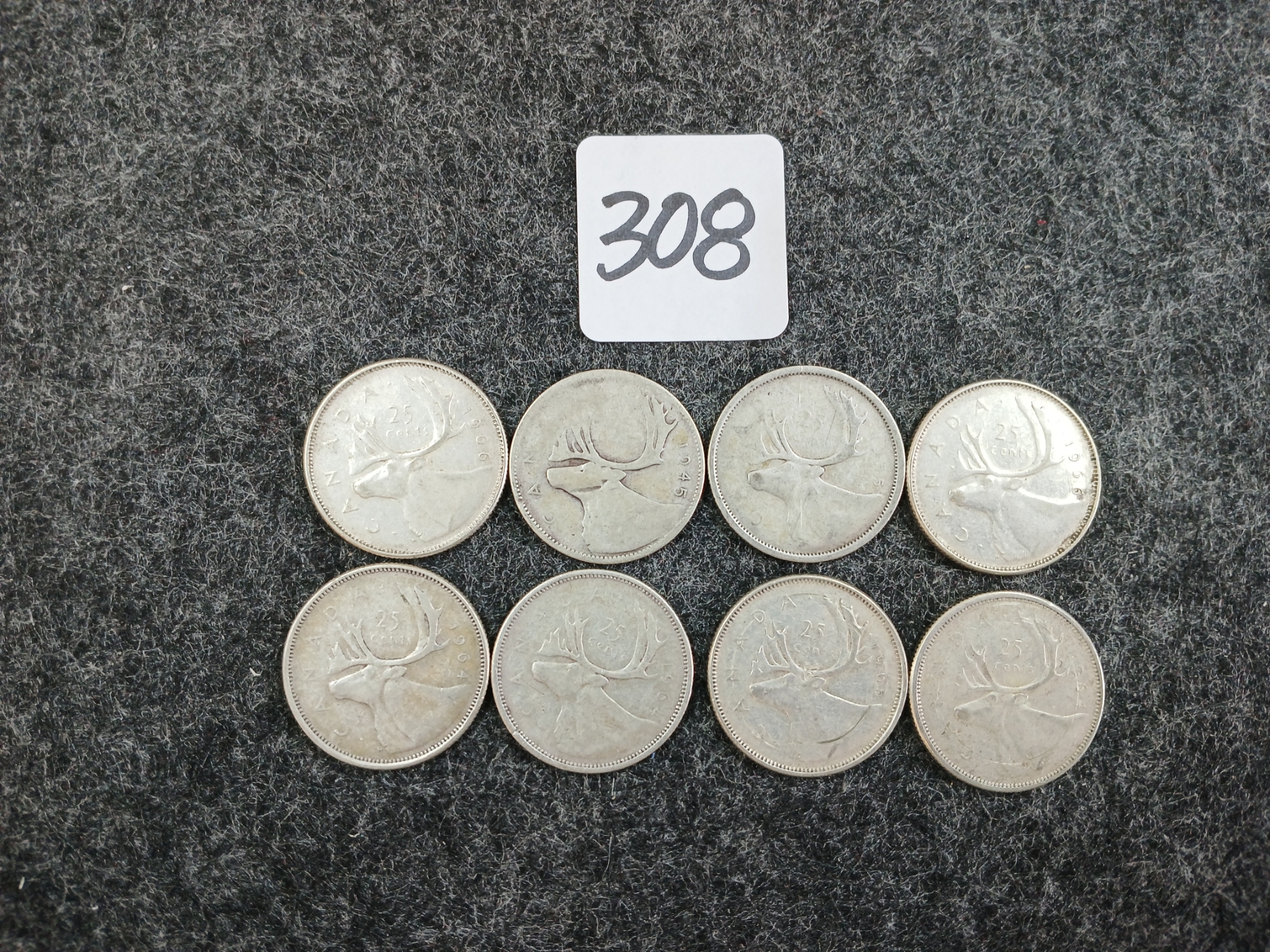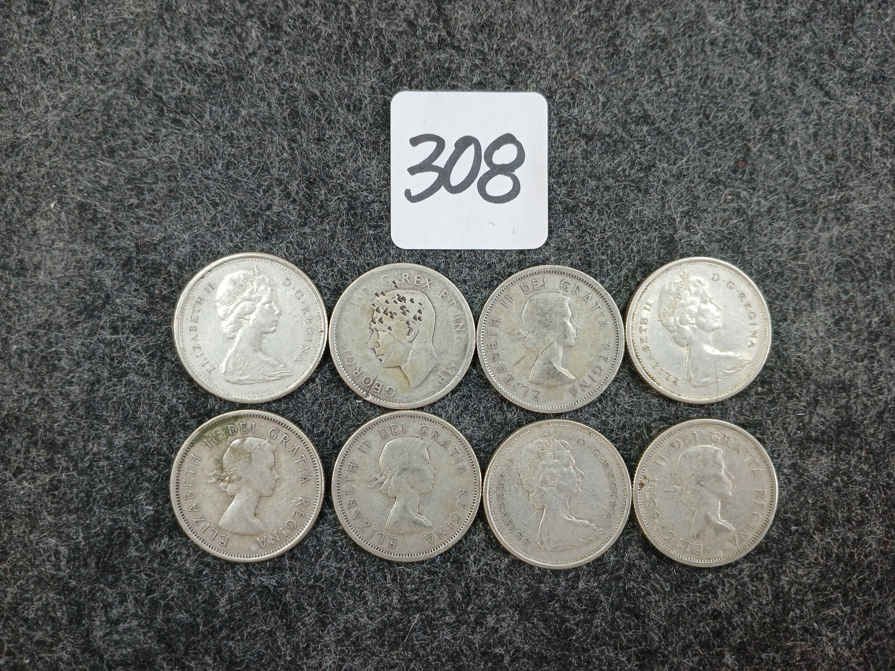 Lot 308 LOT OF 8 - 1945-1966 CDN 25 CENT COINS