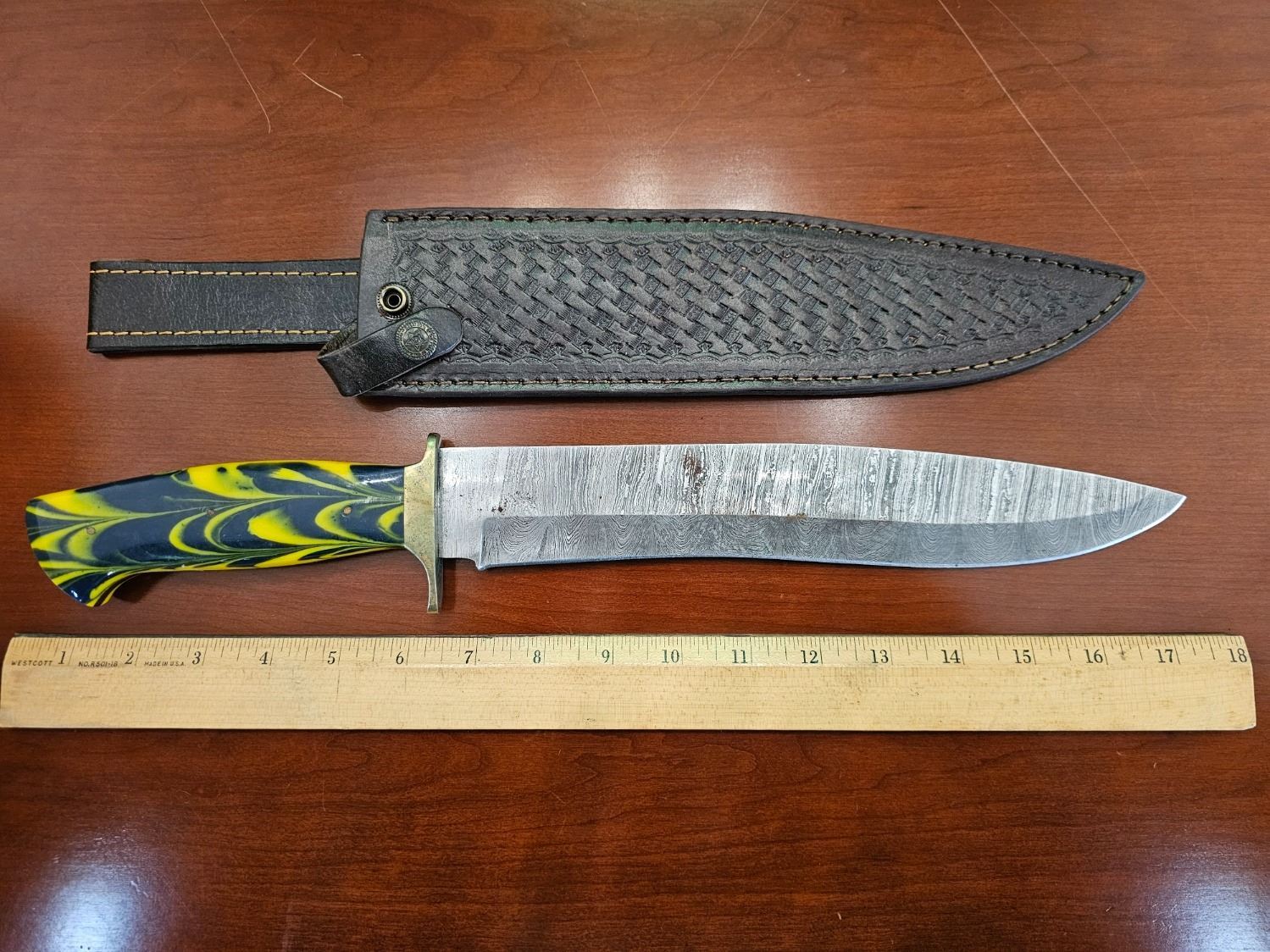 Lot 215 Hand Forged Large Damascus Steel Knife w/ Sheath