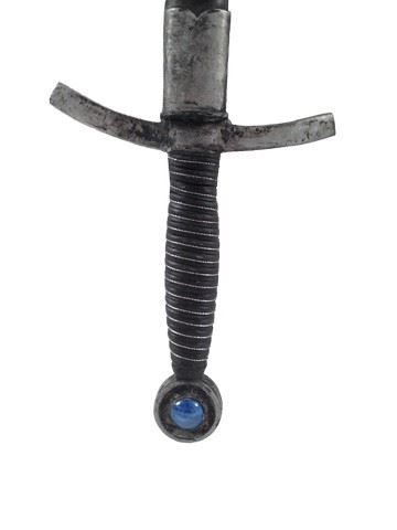 Screen used, production distressed death dealer sword with irremovable sheath. The sword handle has black grip with a silver colored lacing. The bottom of the handle has a round blue gem. Gem is not real. Item may slightly vary from picture. (approx. 19" x 4")