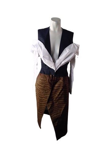 Project Runway All Stars, Season 7, 1: "All Stars Goes Global" - Garment # 705 - Designer: Django. Django designed a 2-piece look with a denim vest and sewn on cotton white sleeves that are off the shoulder and connected in the front of the dress. A brown taffeta skirt that fastens in the front and has a large slit completes this look. His design is based on his hometown of The Netherlands.