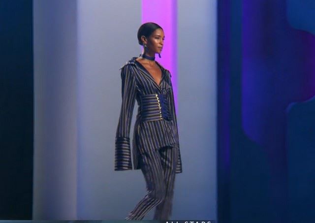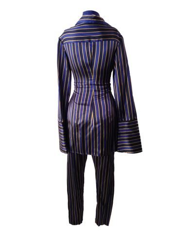 Project Runway All Stars, Season7 , Episode 4: "Corsets of Fashion" - Designer: Sean. This is a 2-piece look created with navy blue, gold and black striped satin top with a laced corset built in. Matching, tailored pants complete the ensemble. The top is shaped like a dress shirt with cuffs that extend past the model's hands.