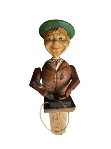 Vintage, hand carved Anri mechanical wine bottle stopper. Made of hand carved and painted wood. This depicts a man who is putting a phone to his ear when the lever in the back is pushed down. Made in Italy by the renowned Anri wood carvers dated to the 1940's-1960s. Designed to fit a standard wine bottle.