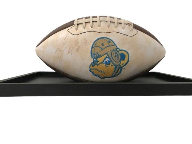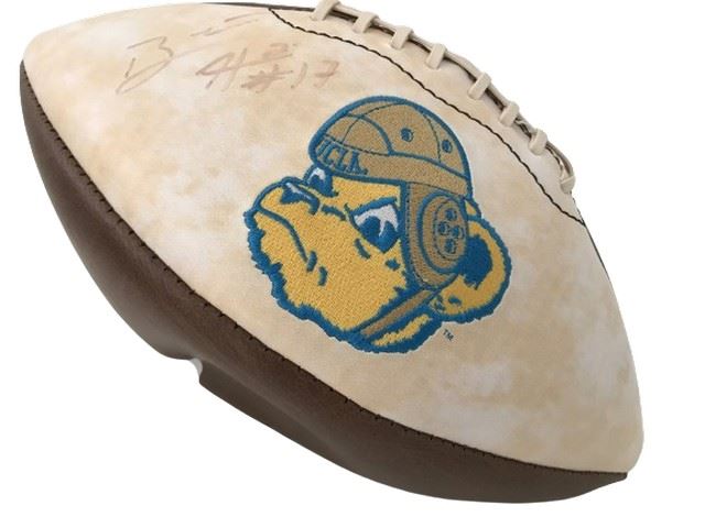 Brett Huntley autographed white and orange UCLA embossed and embroidered football featuring a vintage style, marked 1919 and signed “Brett Huntley #17”.