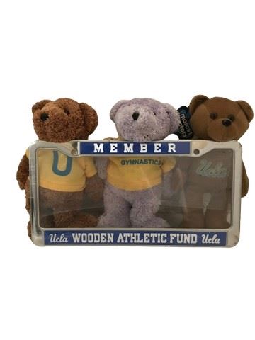 UCLA collection of soft plush with a Wooden Athletic fund member license plate frame. Includes three stuffed bears representing UCLA.