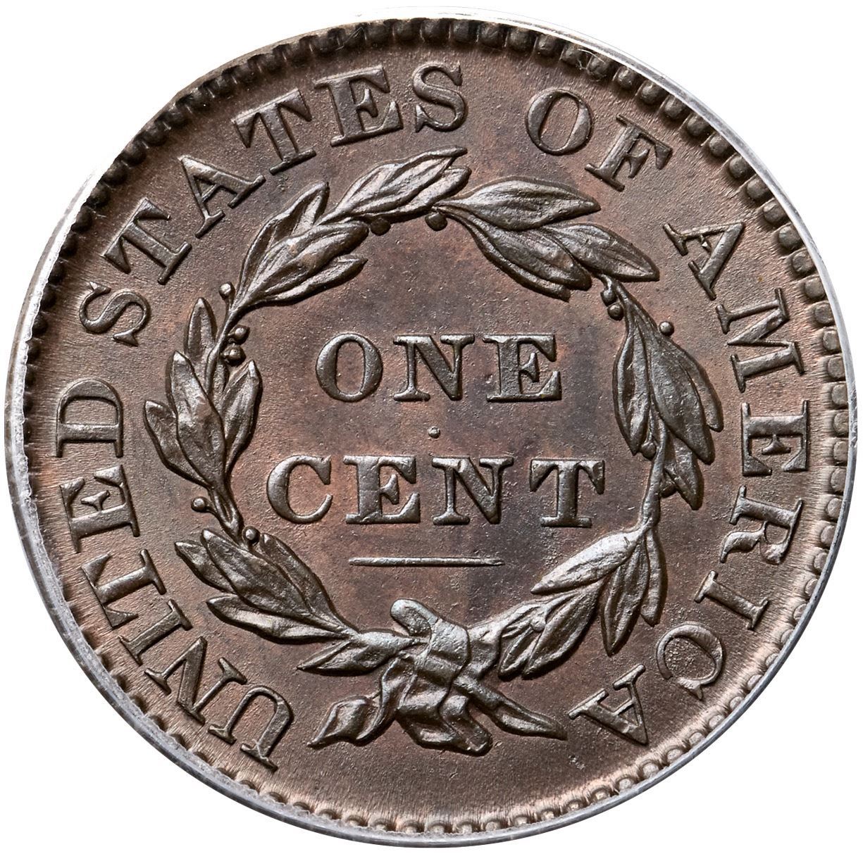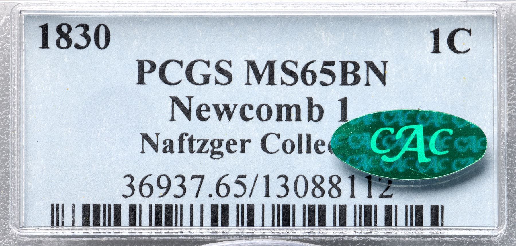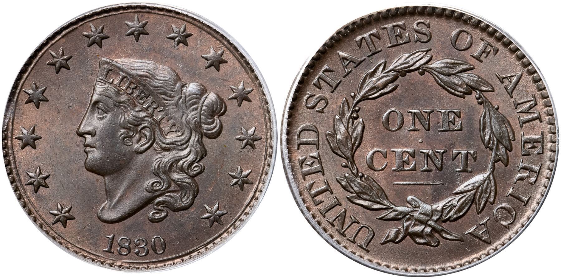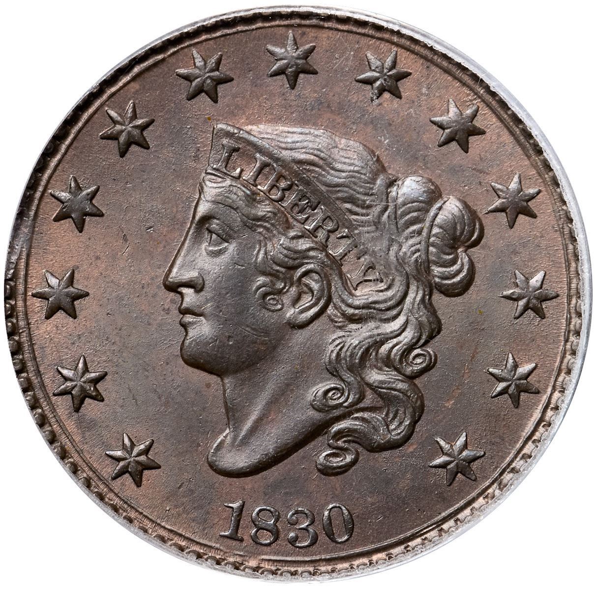 1830 N-1 R1, Large Letters, PCGS graded MS65 Brown, CAC ApprovedLustrous bluish steel and olive with very faded red showing through in protected areas. The only marks are a tiny scrape on the jawline and a microscopic planchet chip in the field midway between the nose and star 4, plus a tiny stain under the second T in STATES. None of these defects is distracting and the eye appeal of this cent is really nice. A minor planchet clip weakens the dentils between stars 3 & 4 and the opposing dentils at TE in UNITED, as struck. Sharply struck MDS, die state b, with a light die crack through star 2. Called MS63 and tied for CC#2 in the Noyes census, his photo #28735. Bland says MS63 and CC#3. Our grade is MS62+, very close to MS63. Comes with a great provenance.Certificate Number: 36937.65/13088112Pedigree: Ex Dr. George P. French, B. Max Mehl 1929 FPL, lot 493-T. James Clarke 10/1954-R. E. "Ted" Naftzger, Jr.-Naftzger Estate, McCawley & Grellman Auctions/Goldbergs 2/1/2009:236-Terry S. Denman Collection