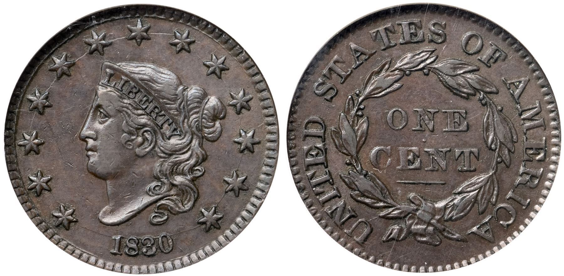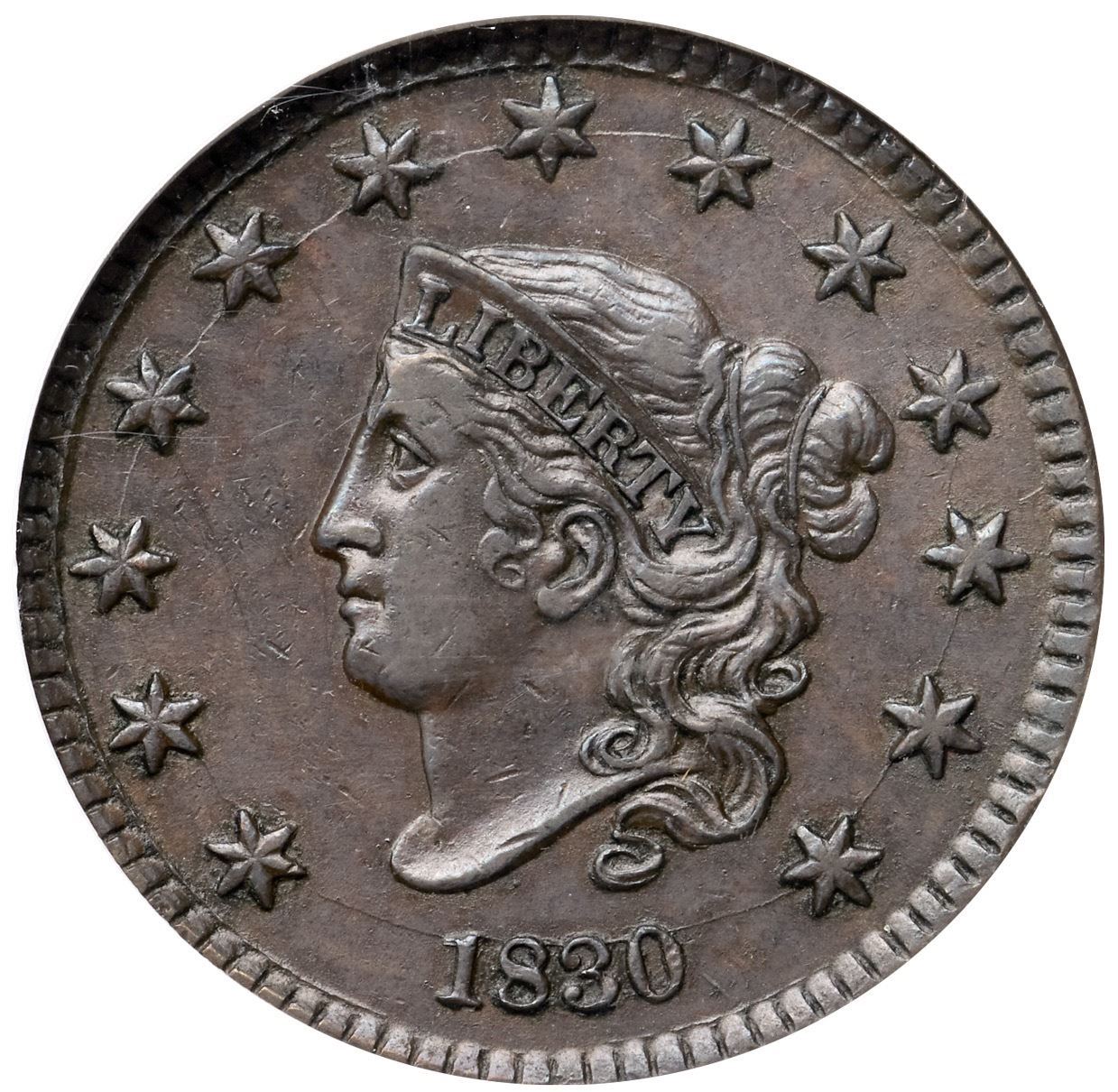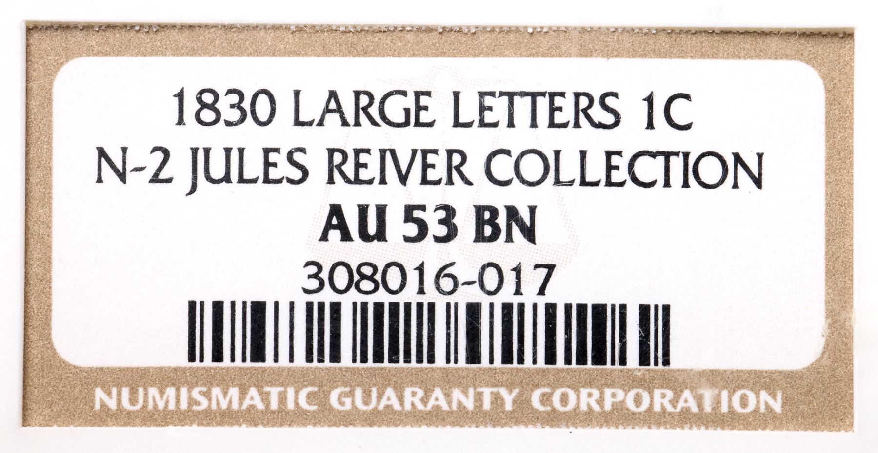 1830 N-2 R2 Large Letters, NGC graded AU53Glossy chocolate brown with underlying frost in protected areas. Sharply struck with trivial marks including a small nick low on the neck and a very light rim bruise at star 12. EDS, die state a, before the additional redial die crack from star 13 to the dentils. The die line from the leaf to the bottom of the U is clear. Our grade is VF35+.Certificate Number: 308016-017Pedigree: Ex Carl Windon-Del Bland 8/15/1972-Jules Reiver, Heritage Auctions 1/24/2006:19922-Terry S. Denman Collection