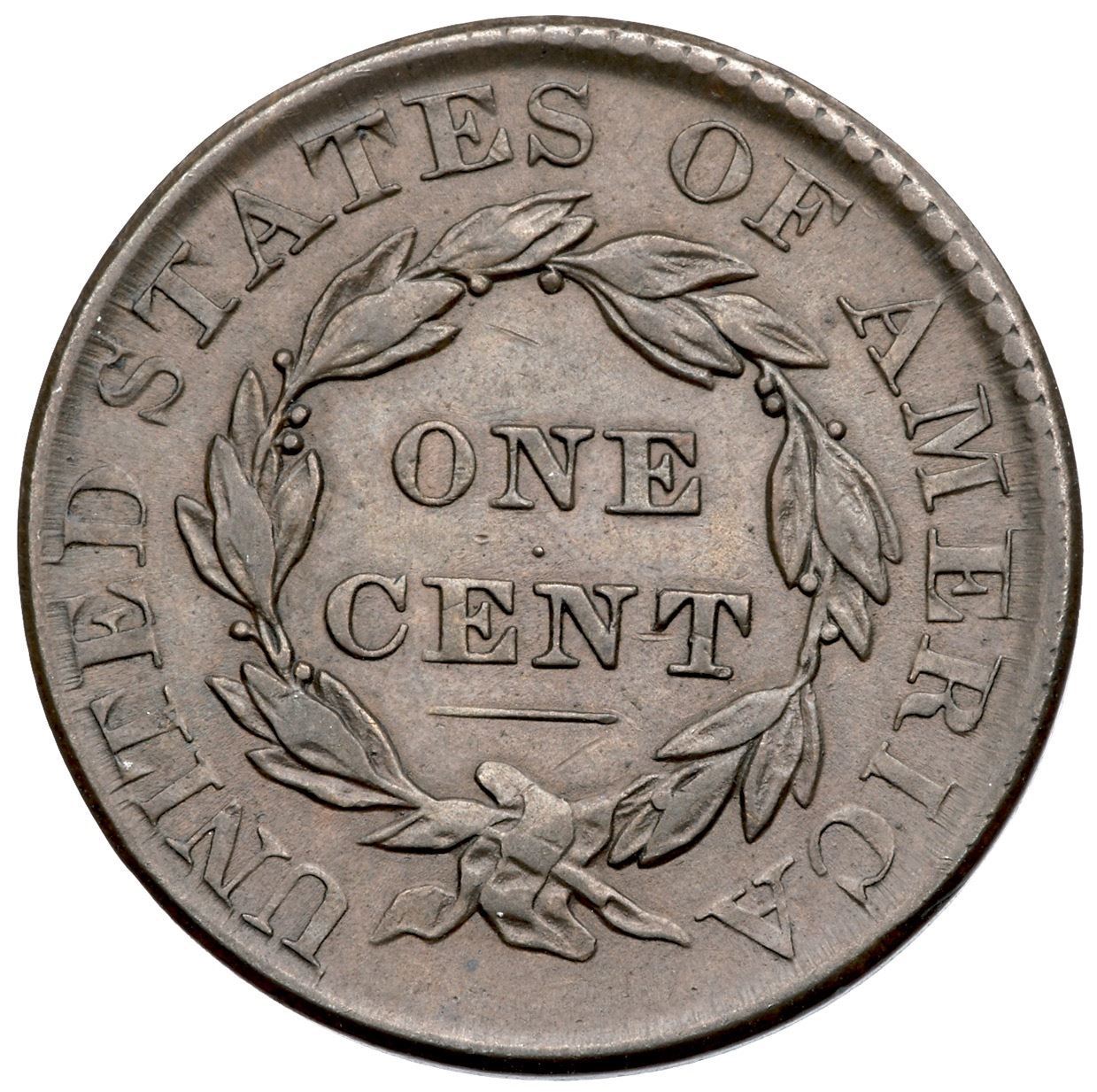 1830 N-7 R3 Large Letters VF35Choice glossy light olive and medium steel brown. The surfaces are smooth and covered with satiny luster, and this cent has great eye appeal. The only mark is a faint hairline scratch in the field from near star 3 to before the forehead, and this mark is not visible to the unaided eye. M-LDS with the tip of the coronet and stars weakly struck, as usual. The die crack from the bust tip to the rim under star 1 is clear. Called VF35 and tied for CC#2 in the Noyes census, his photo #28280. Bland also says VF35 and has it tied for CC#2 among the confirmed examples in his census. A beautiful cent that comes with an outstanding provenance.Certificate Number: Pedigree: Ex Howard R. Newcomb, J. C. Morgenthau & Co. 5/16/1945:618-Floyd T. Starr, Stack's 6/13/1984:238-Jack H. Robinson, Superior 1/29/1989:911-J. R. Frankenfield, McCawley & Grellman Auctions/Superior 2/17/2001:941-Daniel W. Holmes, Jr., McCawley & Grellman Auctions/Goldbergs 5/30/2010:319-Terry S. Denman Collection