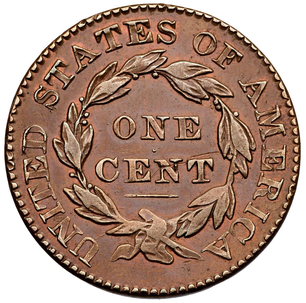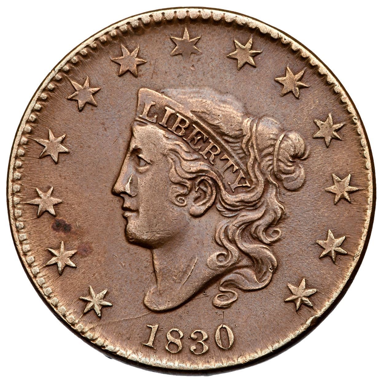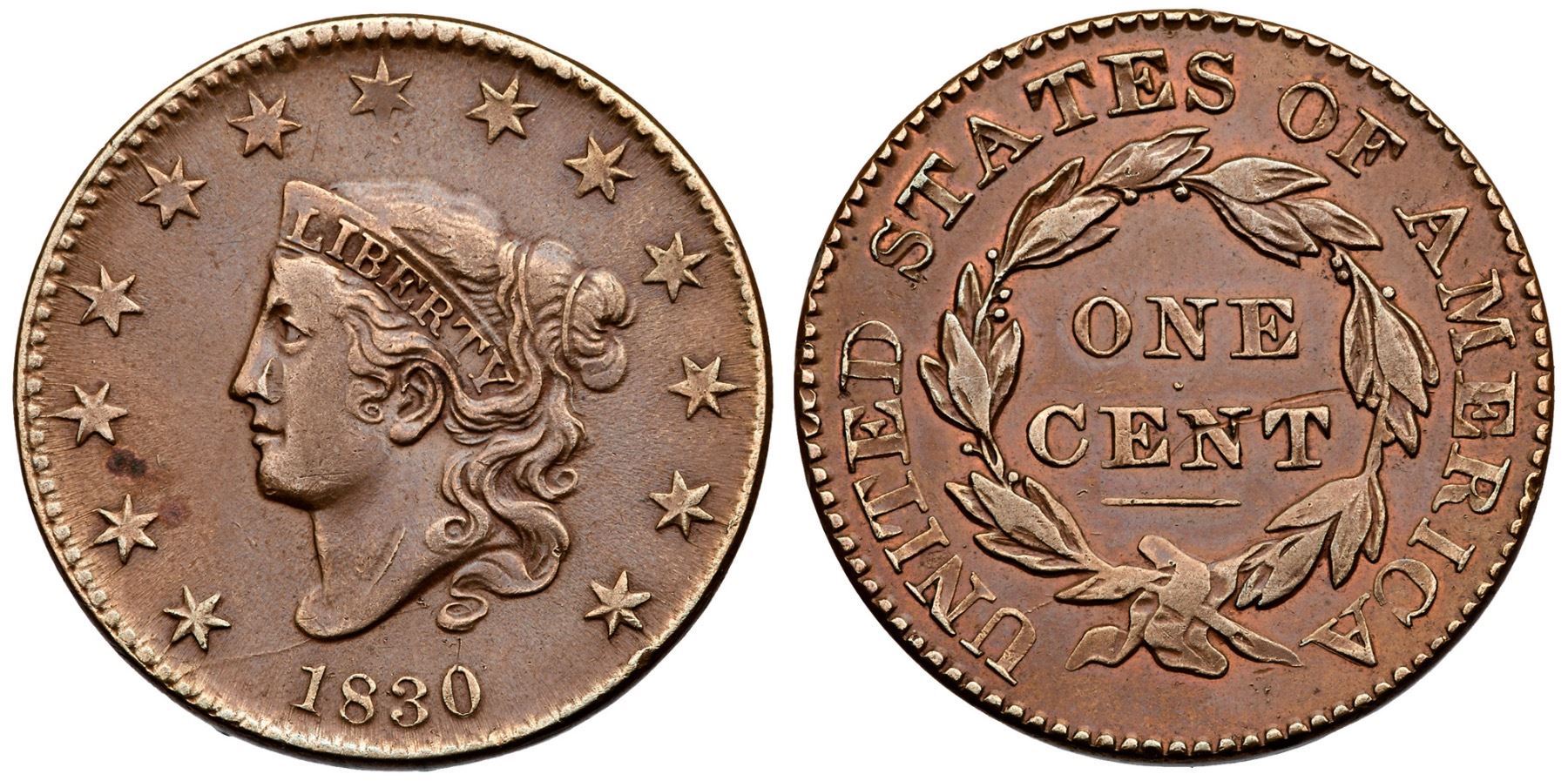 1830 N-9 R6+ Large Letters VF25Sharpness EF40 but there is a dull vertical nick on the nostril, a long diagonal one low on the neck, a dull scratch at NT in CENT, and a small patch of fine verdigris over star 2. Lightly cleaned and retoned glossy light to medium brown. The reverse is lighter with very faded red in the fields and protected areas and steel brown on the devices. This cent would benefit from a proper retoning on the reverse, and the rarity of this variety certainly justifies the effort required to do it right. MDS, the usual die state with a clear die crack from the bust tip to the dentils under star 1. The details at the bottom of the wreath are relatively softly struck, as always on this variety due to axial misalignment of the dies. Called net VF20 and CC#3 in the Bland census. Noyes says EF45 net VF20 and CC#4. Called "The Bus Stop Coin" after the bus stop located on Hollywood Boulevard in front of the old Bowers & Ruddy retail location. At the time of its discovery by Denis Loring in 1973 this piece was the finest of only 5 known of the variety. The current count is about 20, but most of those are in low grade.Certificate Number: Pedigree: Ex Bowers & Ruddy OTC 5/1973-Denis W. Loring 11/1974-R. E. "Ted" Naftzger, Jr.-Naftzger Estate, McCawley & Grellman Auctions/Goldbergs 2/1/2009:245-Chris McCawley-Terry S. Denman Collection