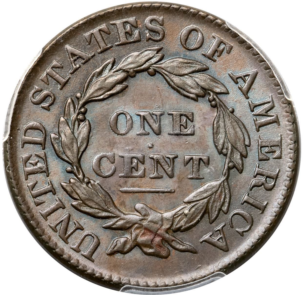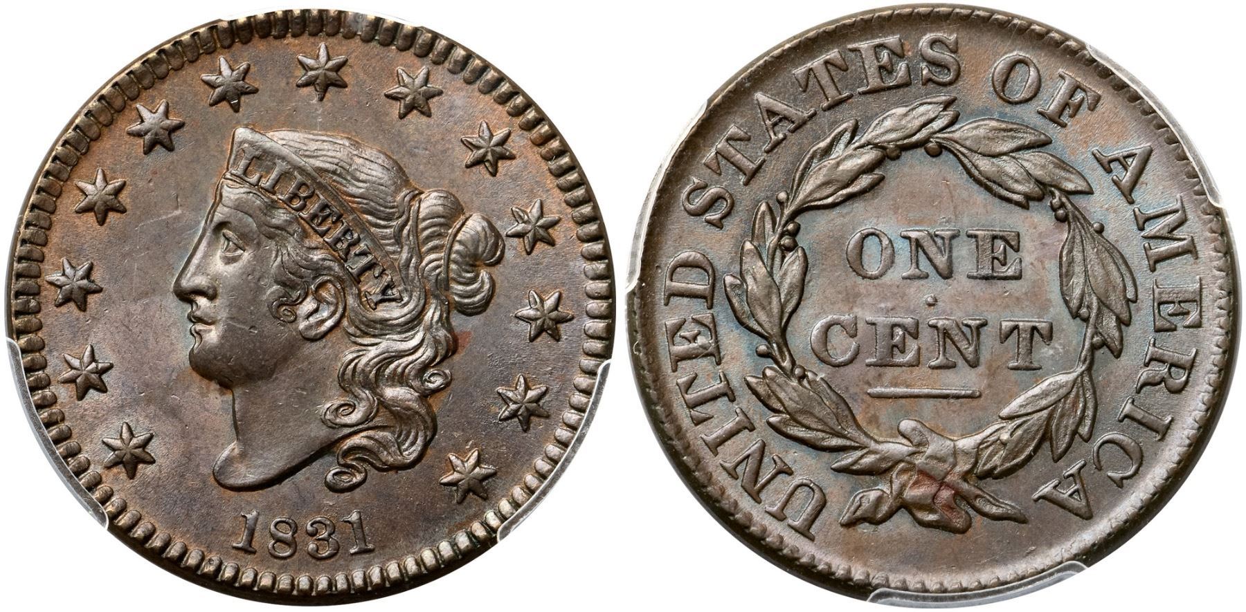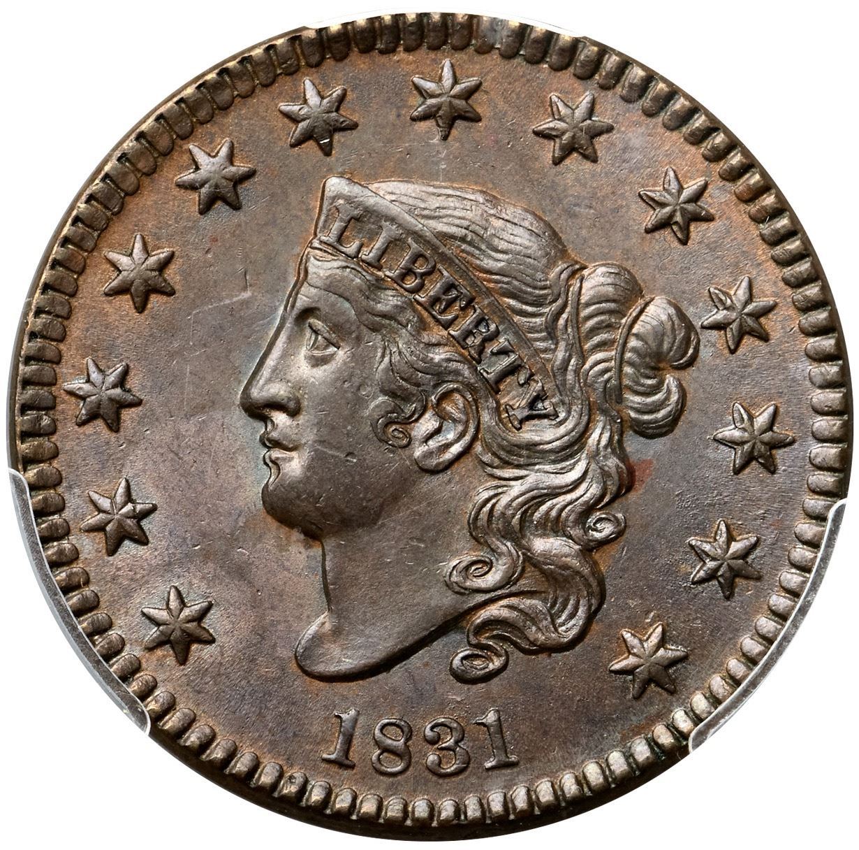 1831 N-6 R1 Large Letters, PCGS Graded MS64 BrownFrosty light olive and bluish steel brown with lighter golden tan in protected areas on the obverse. Attractive with minor marks including a couple dull nicks right of the mouth, a small one in the field off the brow, and a small splash of reddish brown at the main curl. None of the marks is distracting and the reverse is choice. MDS, die state a. The fields on the obverse are covered with fine flowlines but there is no crumbling in the dentils over the R in AMERICA. Struck with a clear double profile on the forehead, lips, and chin with additional doubling on stars 7-12. Our grade is MS60.Certificate Number: Pedigree: Ex Chris McCawley 8/6/2014-Terry S. Denman Collection