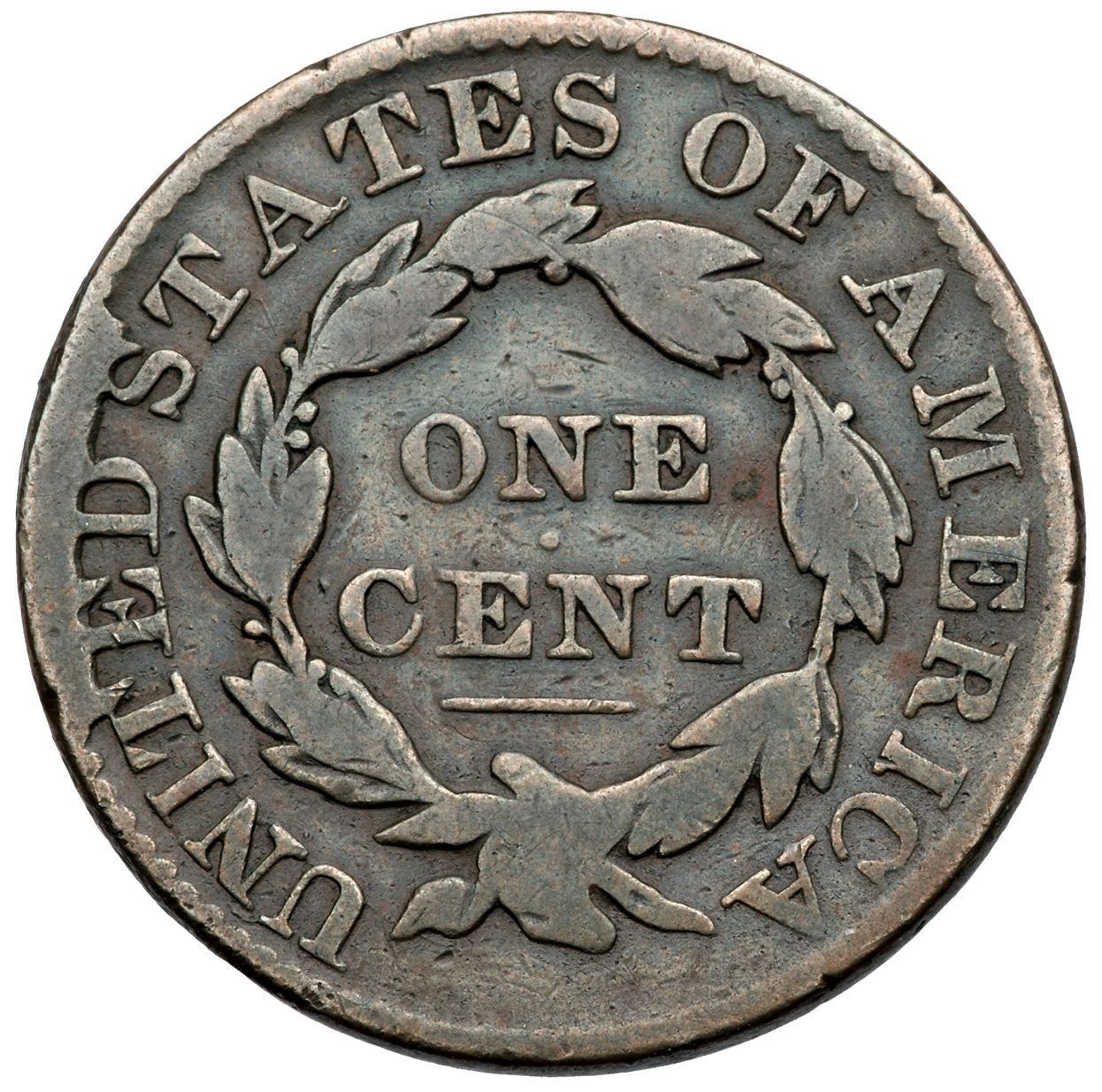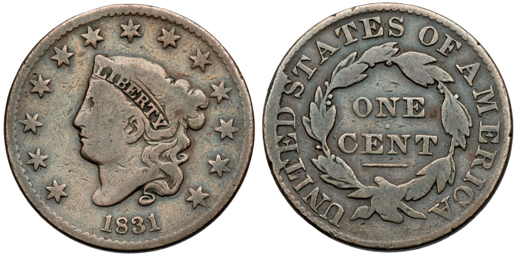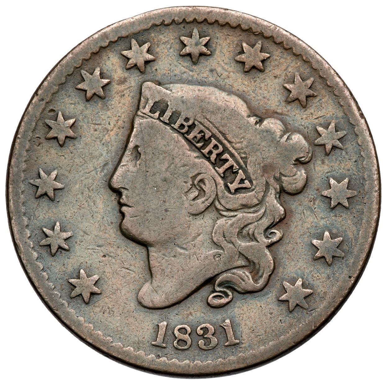 1831 N-8 R3 Large Letters VG7Glossy light greenish olive, possibly lightly cleaned long ago. Smooth with trivial contact marks, just worn. Rare terminal die state, state h, with a cud break connecting TED-S to the rim. Struck with the reverse rotated 30 degrees CCW relative to the normal head-to-foot die orientationCertificate Number: Pedigree: Ex Jack H. Robinson, Superior 1/29/1989:944-Chris McCawley 4/17/1998-Dennis Mendelson, Superior 9/22/1998:1518-Terry S. Denman Collection