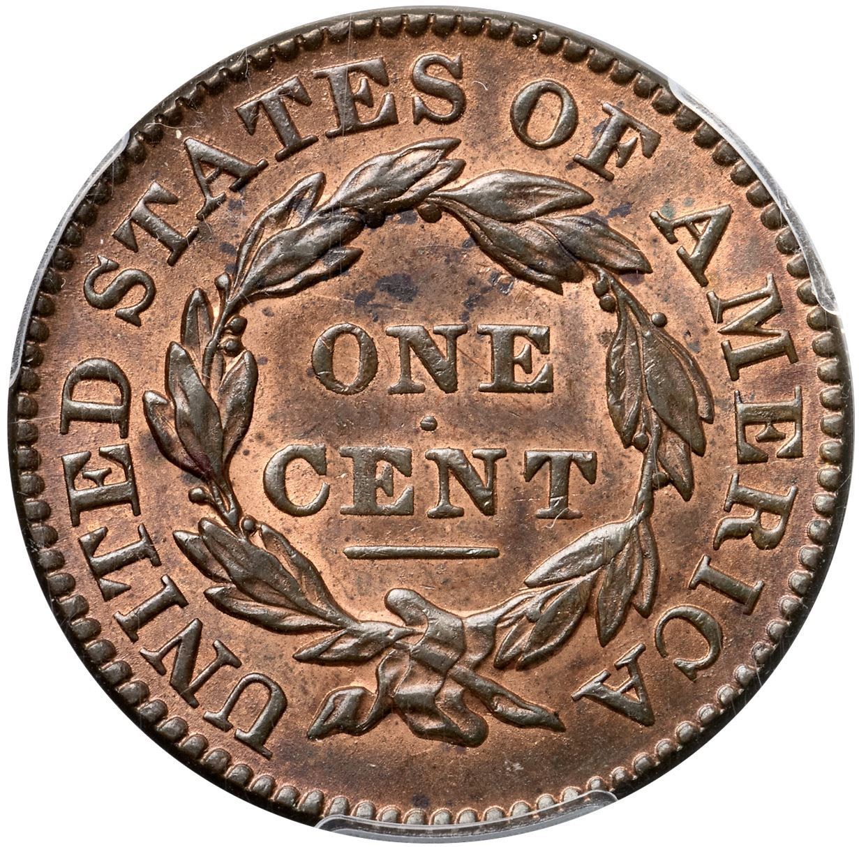 1831 N-9 R2 Large Letters, PCGS graded MS64+ Red & BrownFrosty medium brown and light chocolate with mint red covering 10% of the obverse while nearly half the reverse shows mint color. The surfaces are lustrous and the eye appeal is quite nice, but there are a few marks. The notable marks are a diagonal nick under the right corner of the eye, a spot of darker toning (not carbon) over the left side of the N in ONE, and a short trail of dull ticks near the leaf above that E. E-MDS, die state b. The obverse is cracked through the date and stars, as always, and there is an additional very fine crack from the left point of star 5 to the dentils. Nicely struck with radial lines in all the stars. A very nice cent. Graded MS63 and tied for CC#1 with one other examples in the Noyes census, his photo #27081. Our grade is MS62. Comes with an important provenance.Certificate Number: 36983.64+/83245082Pedigree: Ex Howard R. Newcomb, J. C. Morgenthau & Co., 5/16/1945:630-Floyd T. Starr, Stack's 6/13/1984:253 (as MS63)-John J. Nicholas, Jr., Superior 2/2/1992:564-Chris McCawley 9/1999-Manuel Ahumada Collection, McCawley & Grellman Auctions/Goldbergs 6/4/2017:120-Terry S. Denman Collection
