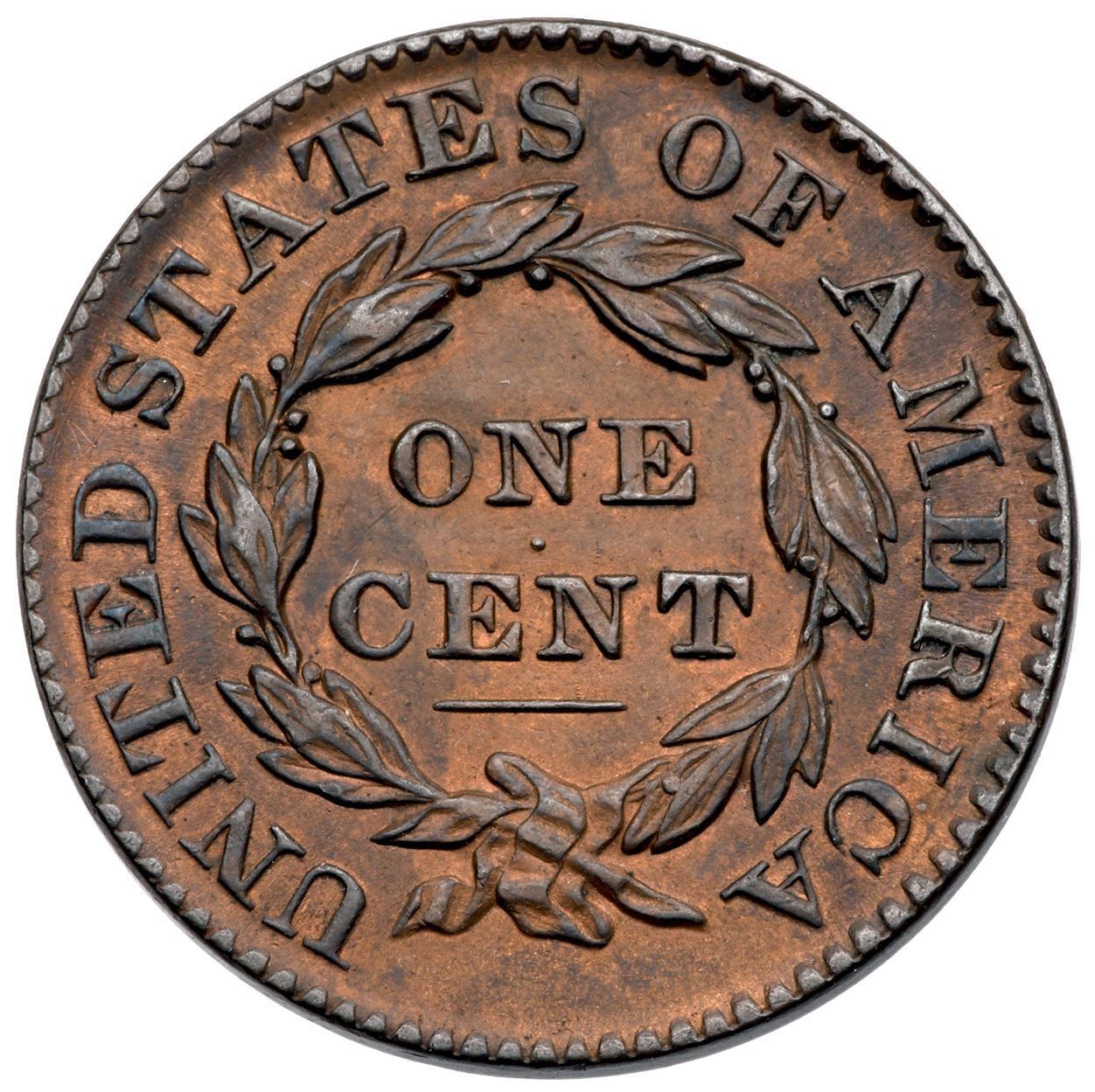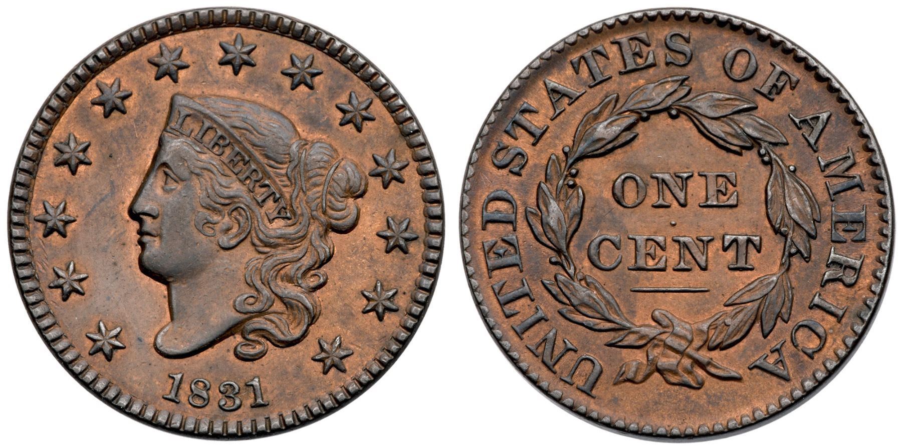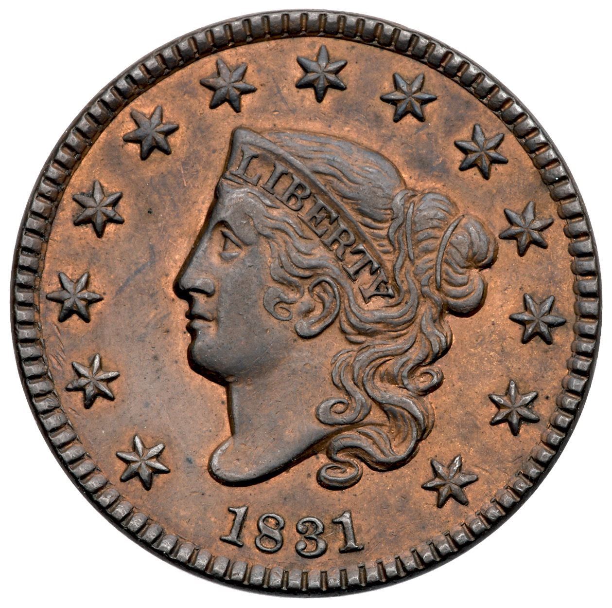 1831 N-10 R3 Large Letters EF45At least 5 points sharper but lightly cleaned and retoned dark steel on the devices with very faded red in protected areas. No marks, just light friction on the highpoints. Sharply struck EDS, die state a, with sharp dentils around the obverse and no rim cud at stars 8-9. The obverse fields are smooth showing no trace of die flowlines. Sharp and attractive; reported to have been removed from a PCGS holder graded AU58.Certificate Number: Pedigree: Ex Thomas D. Reynolds (stolen in Nebraska following the 2000 EAC Sale; returned to Tom by Stack's 11/2011 after finding it in a consignment sent by a dealer in Russia)-Terry S. Denman Collection