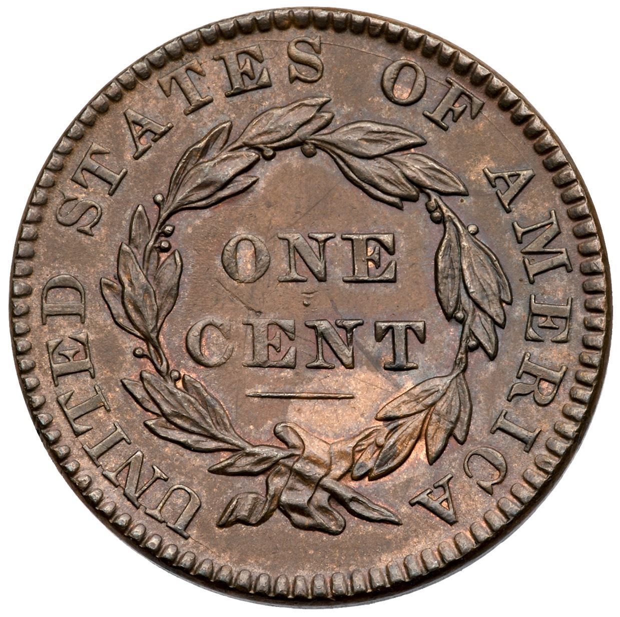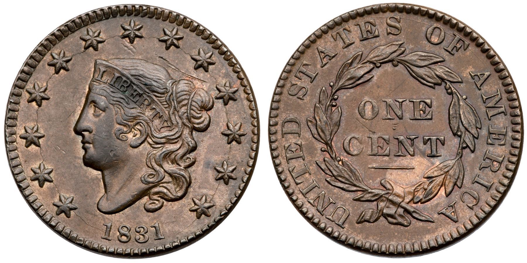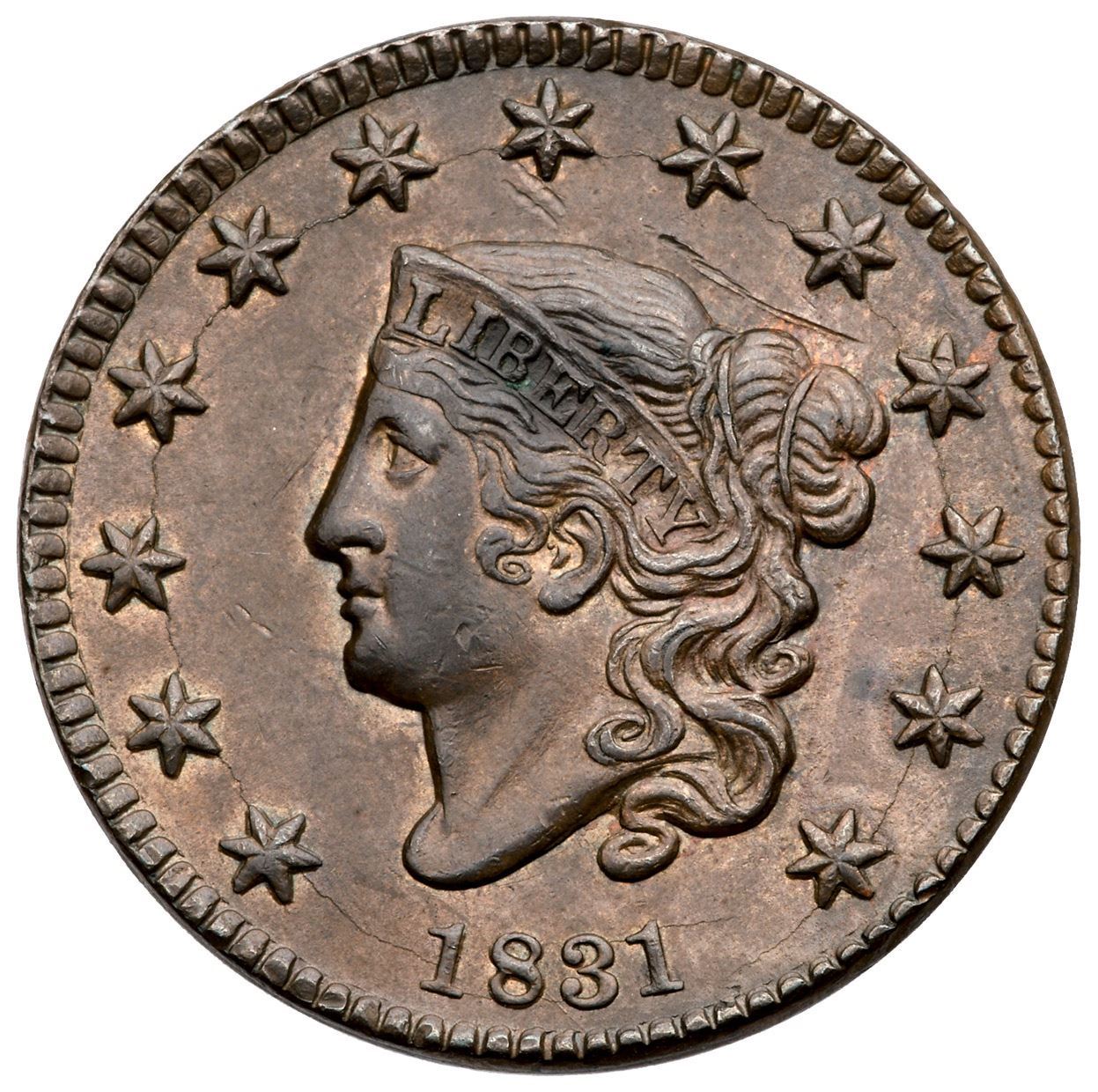 1831 N-11 R2 Medium Letters EF40Sharpness at least AU50 but there is a rather strong scratch in the field close above the head, two dull nicks under star 7, and a splash of dark olive toning at BE in LIBERTY. Otherwise a nice glossy steel brown and chocolate with frosty golden tan in protected areas, an area of lighter tan under NT in CENT, and traces of very faded mint red on the reverse. EDS, die state a. The obverse die cracks are light and the fine die line from the dentils to the right bottom of the 8 clear.Certificate Number: Pedigree: Ex Norm Pullen (via Dr. Robert J. Shalowitz) 9/15/1989-Daniel W. Holmes, Jr., McCawley & Grellman Auctions/Goldbergs 5/30/2010:354-Terry S. Denman Collection