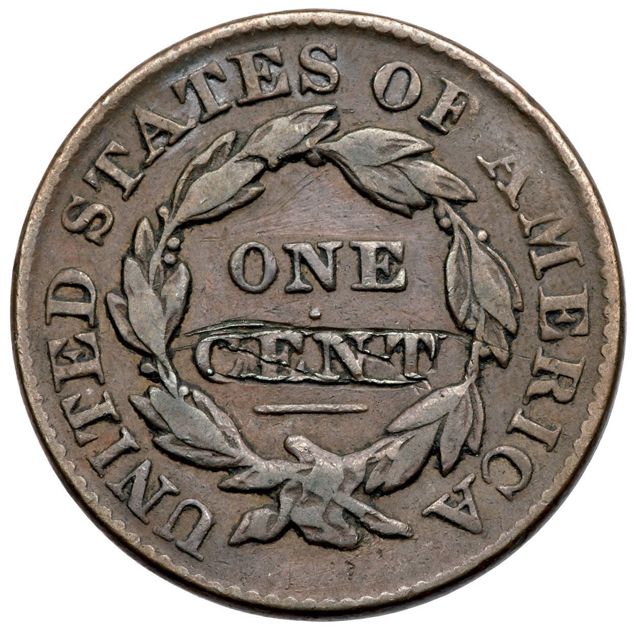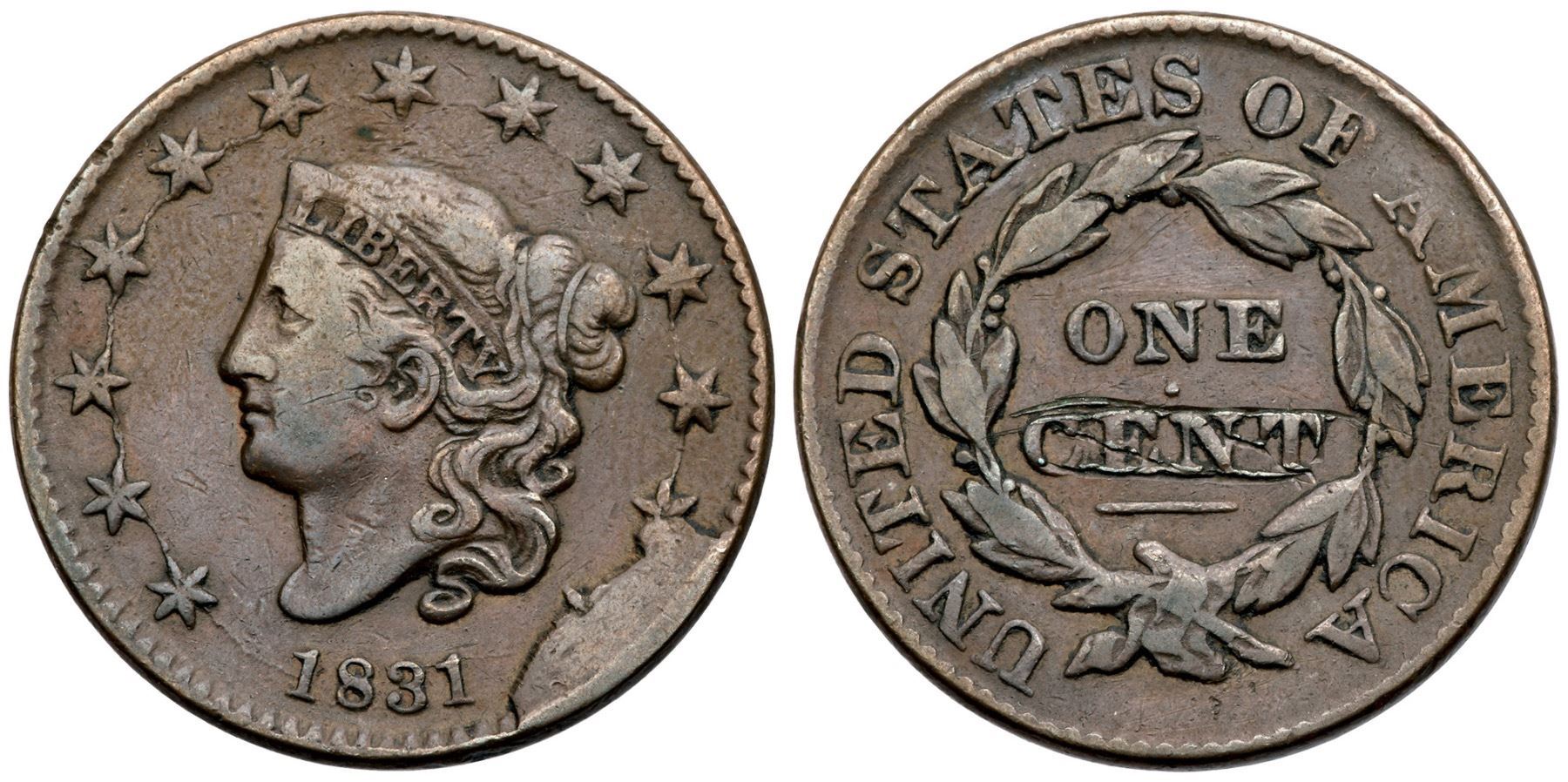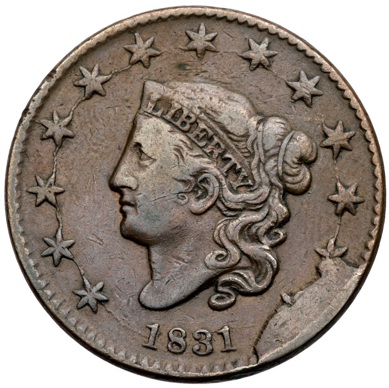 1831 N-12/4 R4 (as a die state) F12Sharpness VF20 with some sharp scratches along the top and bottom edges of CENT. Otherwise smooth and attractive with glossy medium brown and light chocolate toning. Rare terminal die state, state j, with the "Harpooned Whale" cud covering the lower left point of star 12 in addition to the other two points of that star and the 5 points of star 13. An attractive example of this rare die state, in the lower part of the condition census for the terminal state. (The earlier version of the "Harpooned Whale" that has the lower left point of star 12 uncovered is the more common of the two versions.)Certificate Number: Pedigree: Ex 1992 EAC Sale, lot 247-Daniel W. Holmes, Jr., McCawley & Grellman Auctions/Goldbergs 5/30/2010:366-Terry S. Denman Collection