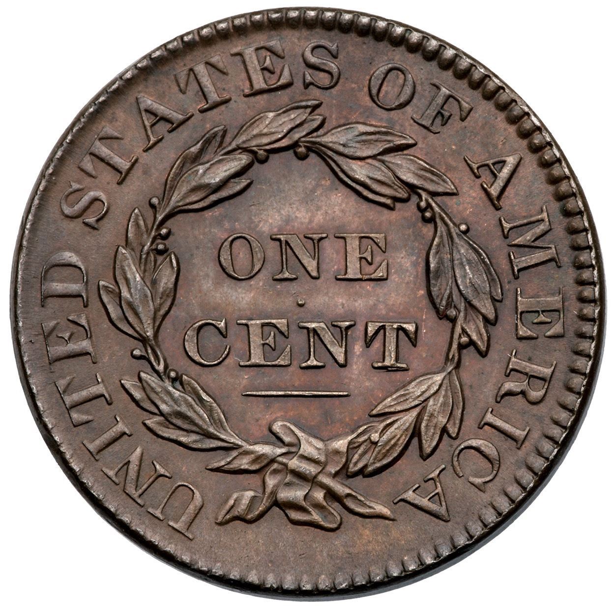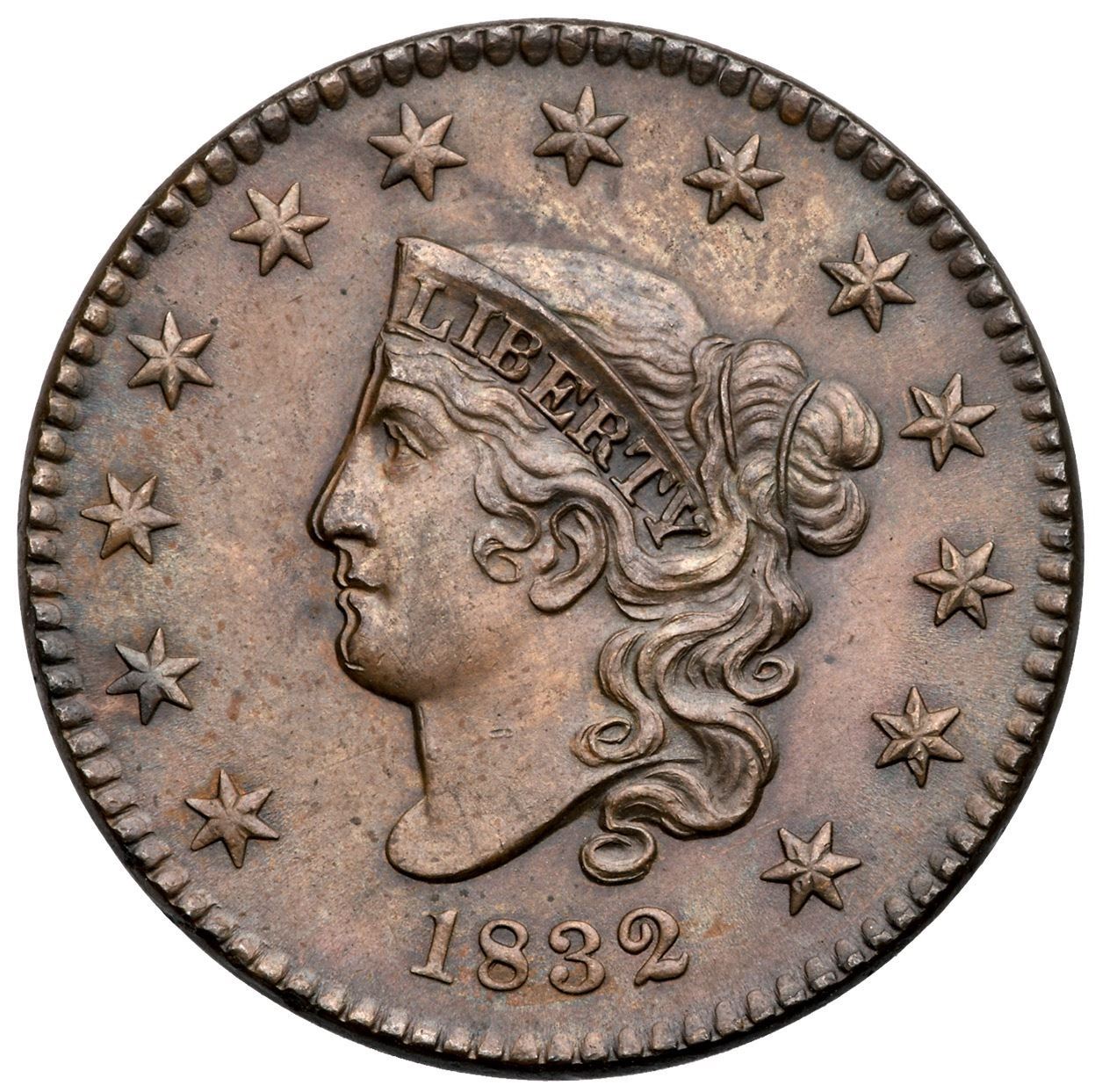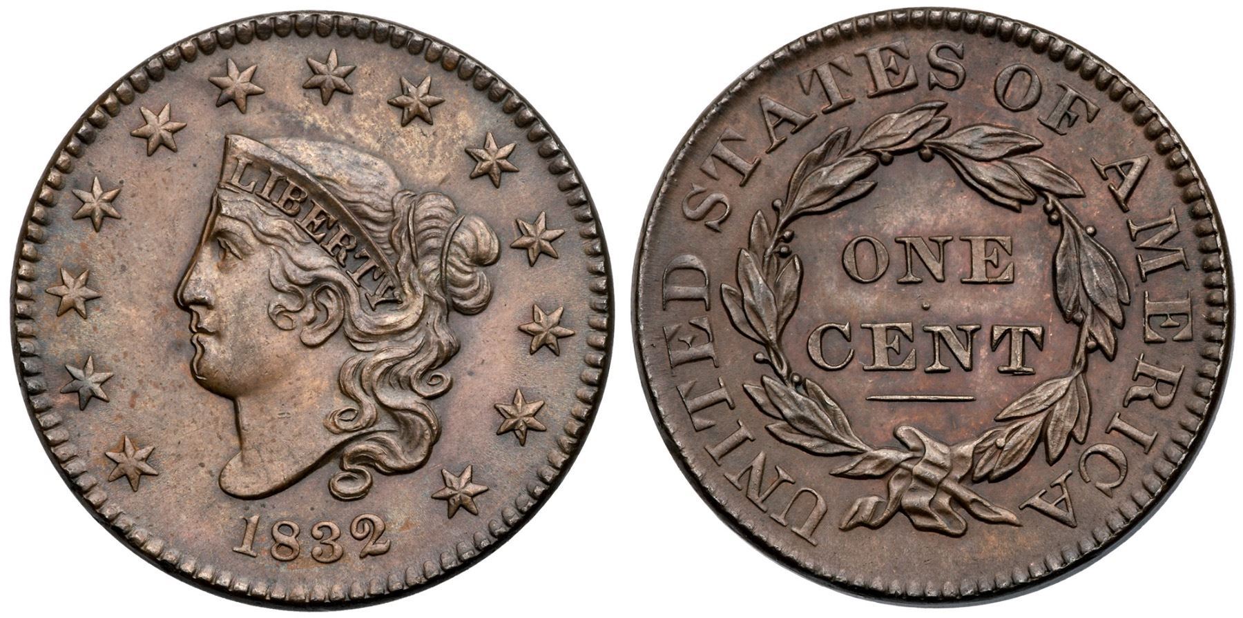 1832 N-3 R1 Large Letters MS60Frosty light olive and steel brown with hints of underlying very faded red on the reverse, possibly from an old cleaning. The surfaces are satiny and the strike is very sharp. The only mark is a tiny tick in the middle of the neck. E-MDS, die state a. There is a strong double profile from the forelock down to the chin with weaker doubling on the front edge of the coronet and upper half of the neck. A triple profile shows on the lower half of the nose and on the lower lip, all caused by machine doubling or "die bounce". A sharp, attractive cent.Certificate Number: Pedigree: Ex Dr. James O. Sloss 9/1958-R. E. "Ted" Naftzger, Jr.-Naftzger Estate, McCawley & Grellman Auctions/Goldbergs 2/1/2009:278-Terry S. Denman Collection