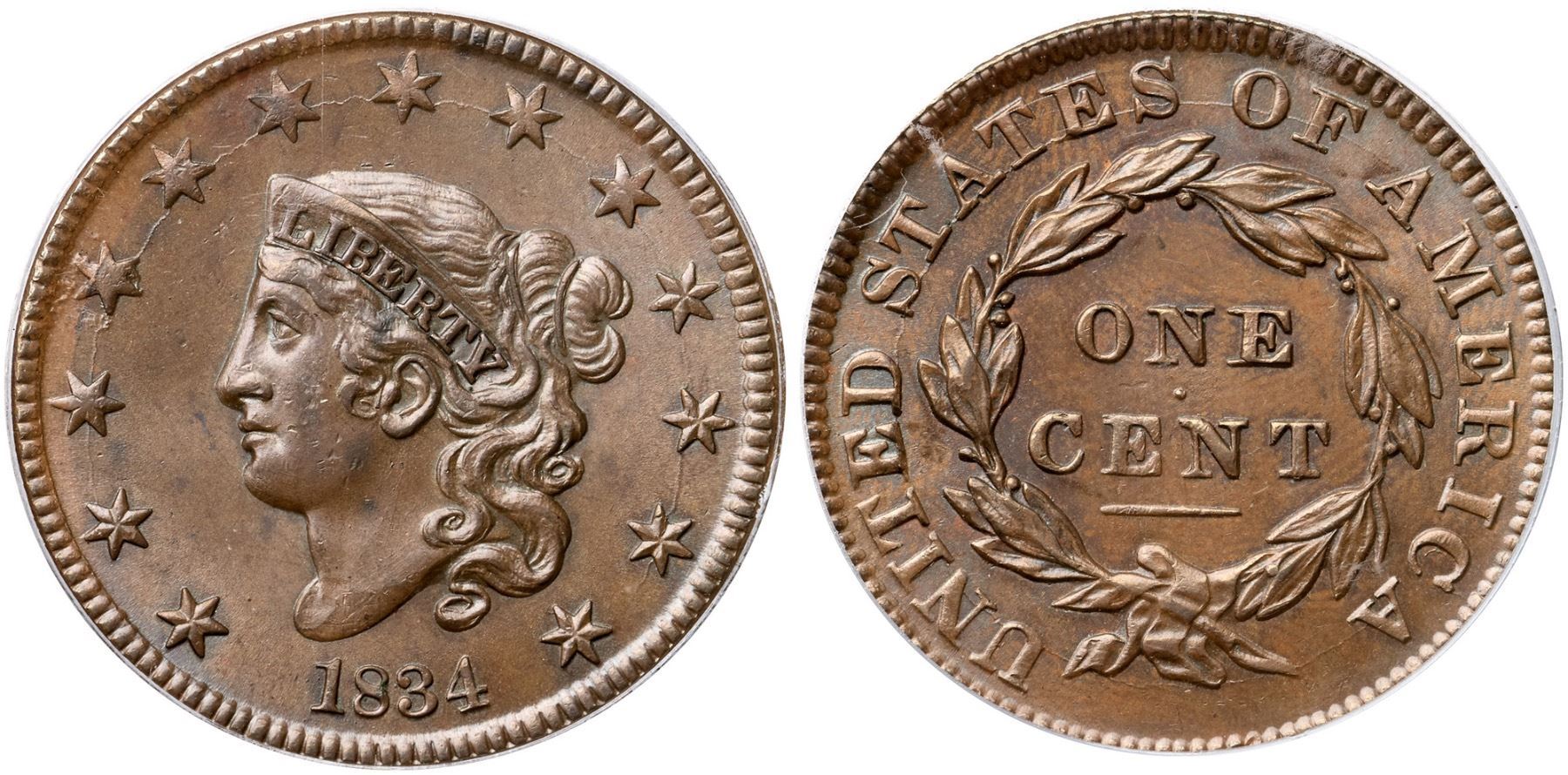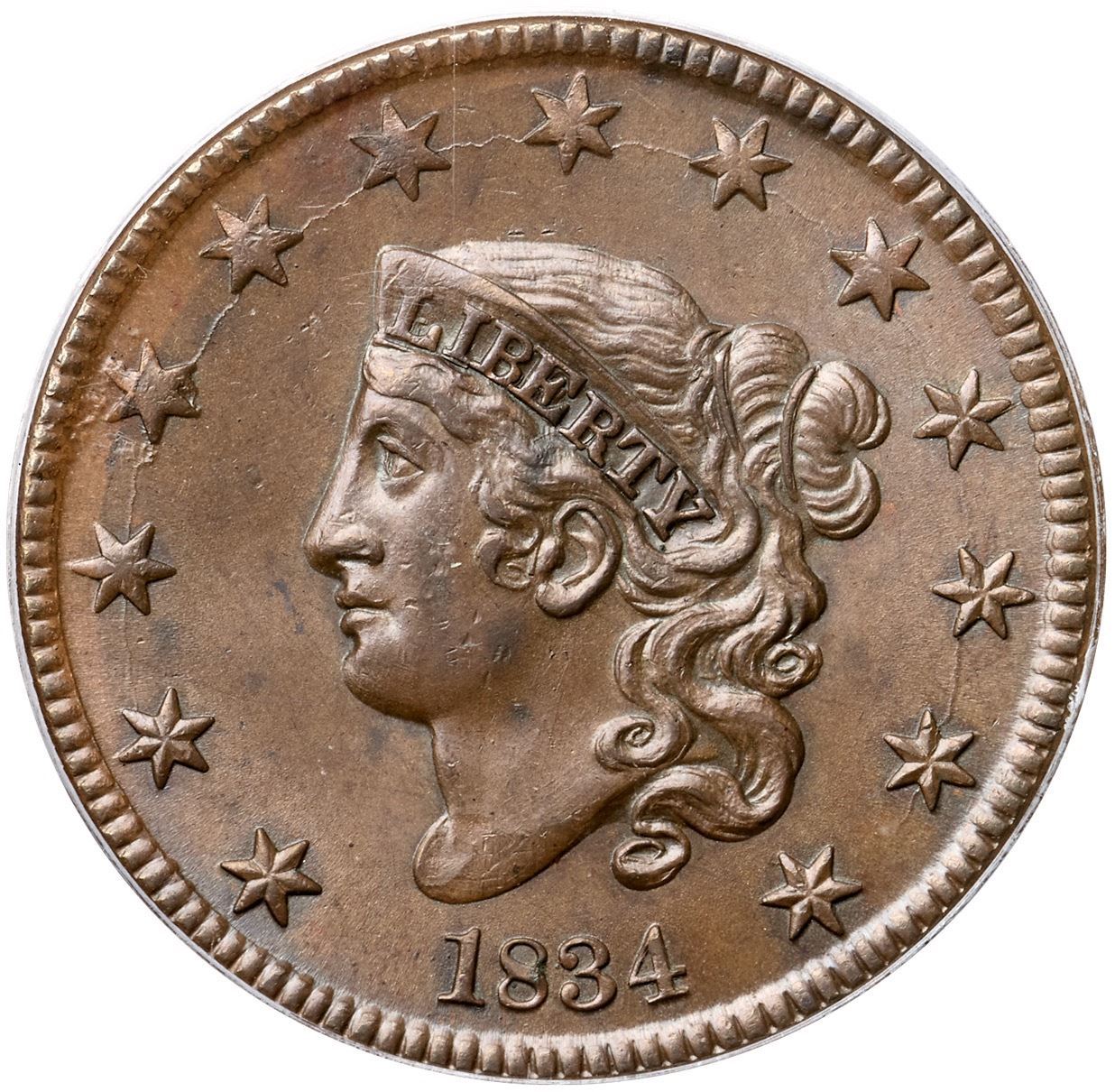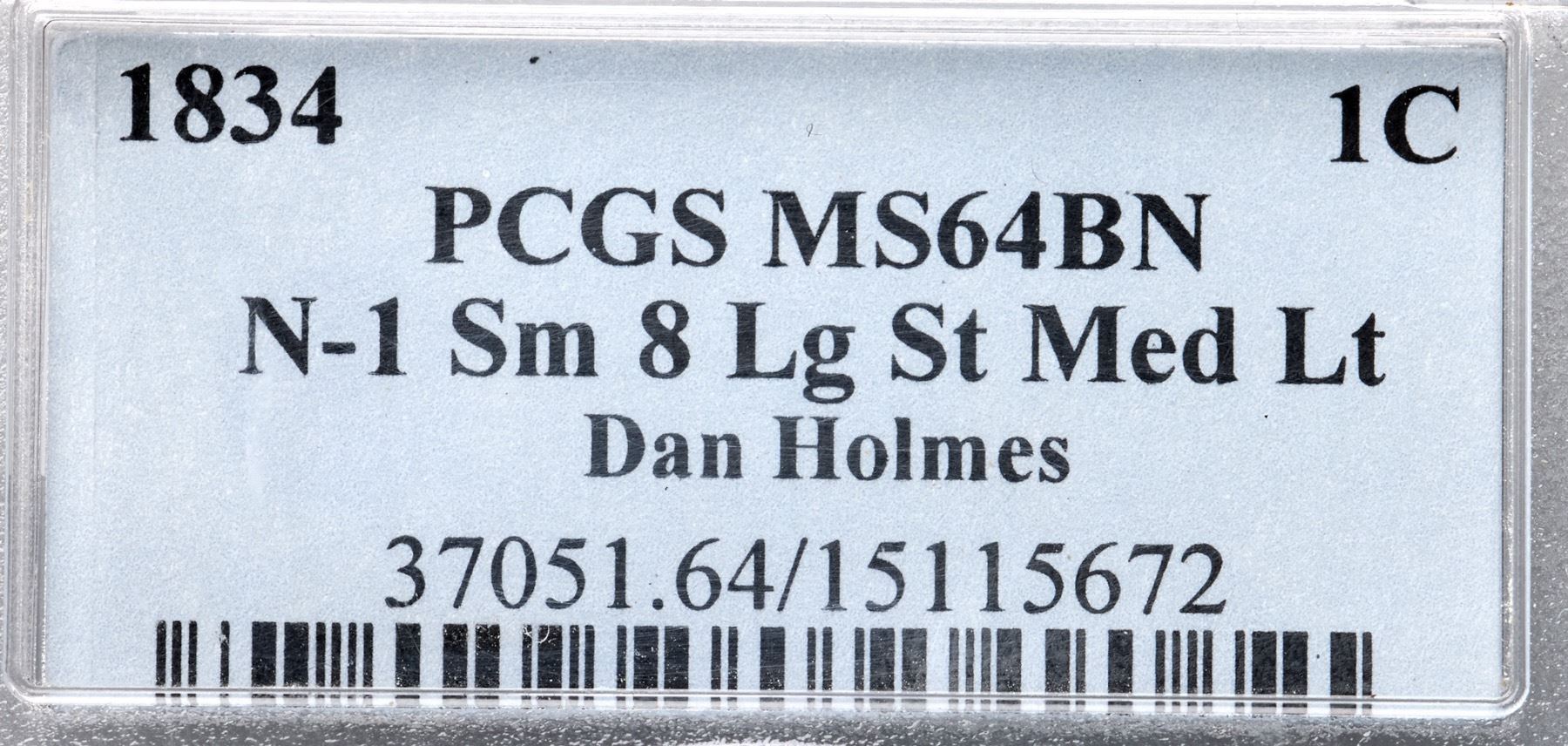 1834 N-1 R1 Small 8, Large Stars, Medium Letters, PCGS graded MS64 BrownLustrous medium steel brown with delicate overtones of bluish steel in protected areas. The surfaces are satiny and the eye appeal of this cent is excellent. A speck of darker olive toning high on the neck, a few microscopic chips on the cheek, and a small rim nick under the wreath stem are the notable marks. MDS, die state c. Both dies are cracked, as always, and the fields are satiny from microscopic die flowlines. Crumbling shows around star 4, strongest between the right points, and the repunching inside the lower half of the C in AMERICA is clear. Called MS60 and tied for CC#4 in the Noyes census, his photo #36776. Our grade is MS60+.Certificate Number: 37051.64/15115672Pedigree: Ex Christian M. Petersen, Kagin's 1/30/1986:5503-Daniel W. Holmes, Jr., McCawley & Grellman Auctions/Goldbergs 5/30/2010:386-Terry S. Denman Collection