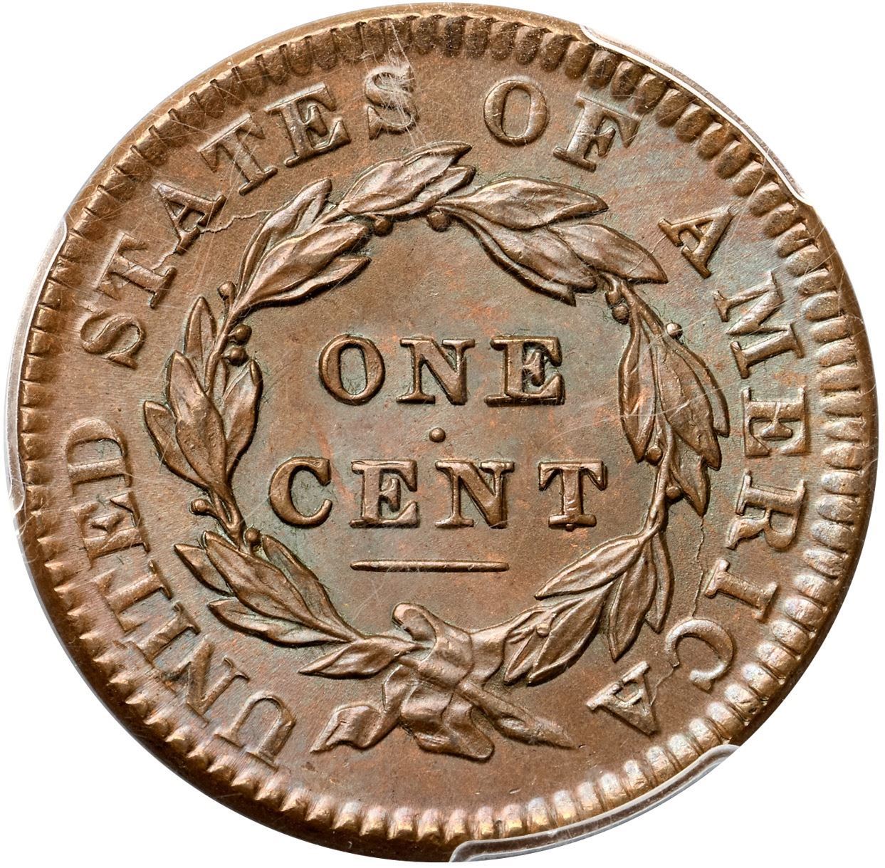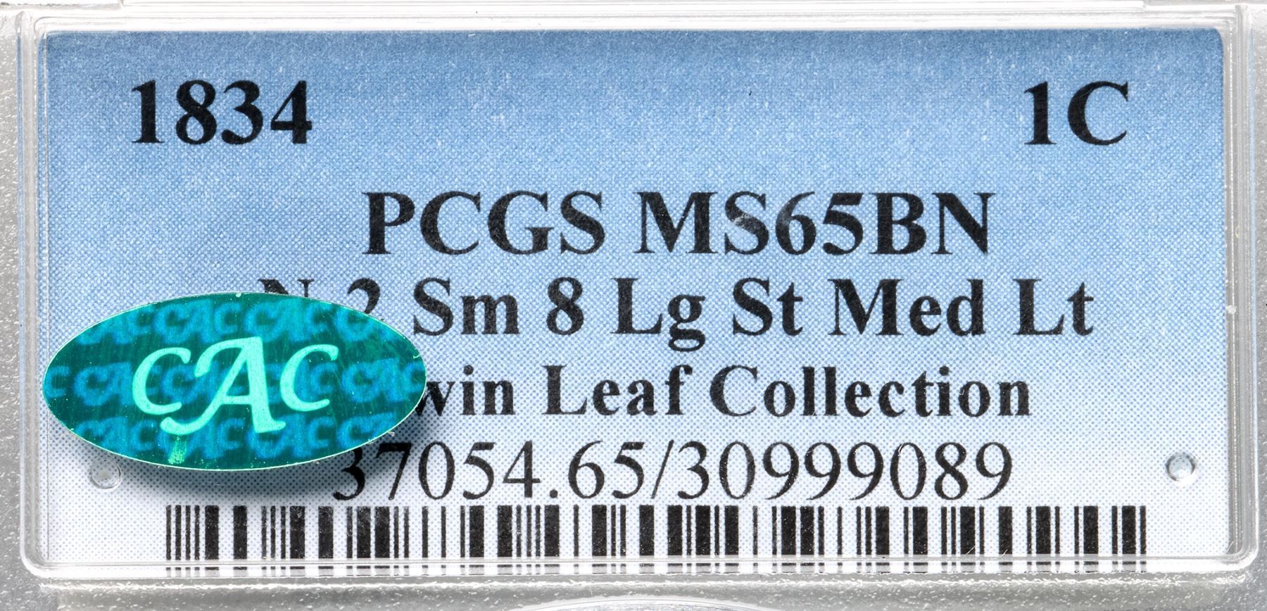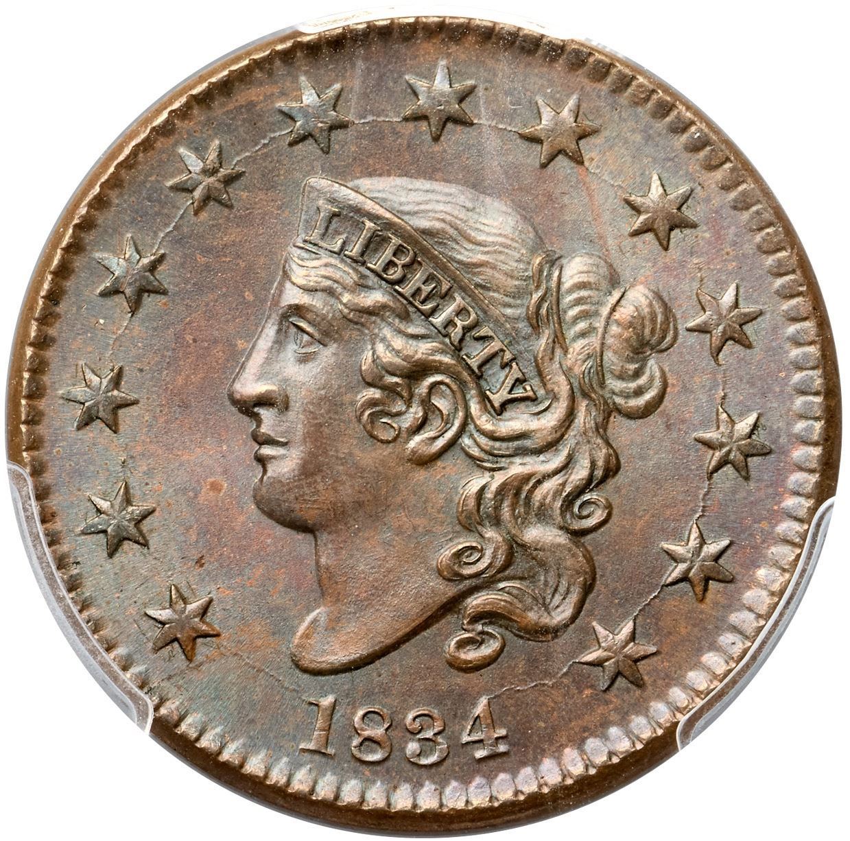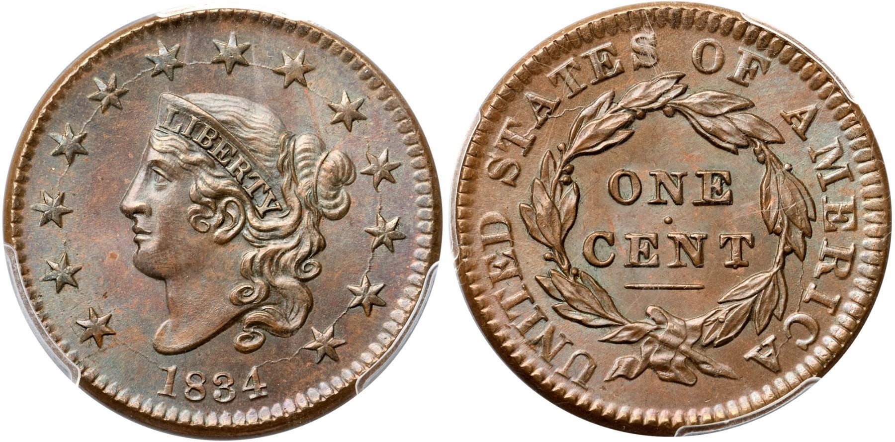 1834 N-2 R1 Small 8, Stars, Medium Letters, PCGS graded MS65 Brown, CAC ApprovedChoice lustrous bluish steel brown. The surfaces are satiny and virtually flawless, and this cent has superior eye appeal. The portrait and wreath are sharply struck with full hair details over the brow. Essentially flawless; a small spot of lighter brown toning in the field off the chin and a tiny speck of fine carbon on the right top of the N in UNITED are the only notable marks. MDS, die state b late. The spikes up from the dentils under the date are weak but still visible and both dies are cracked (as usual). This is the Newcomb plate coin for the die variety (Plate VII, 1834 Obverse 2, Reverse B). Graded MS63 Choice and tied for CC#4 in the Noyes census, his photo #36413. Our grade is MS64. A superb cent that comes with a great provenance.Certificate Number: 37054.65/30999089Pedigree: Ex Howard R. Newcomb, J. C. Morgenthau & Co. 5/16/1945:649-Floyd T. Starr, Stack's 6/13/1984:281-R. E. "Ted" Naftzger, Jr. 2001-W. M. "Jack" Wadlington (The Twin Leaf Collection), Stack's Bowers 7/16/2015:2237-Terry S. Denman Collection