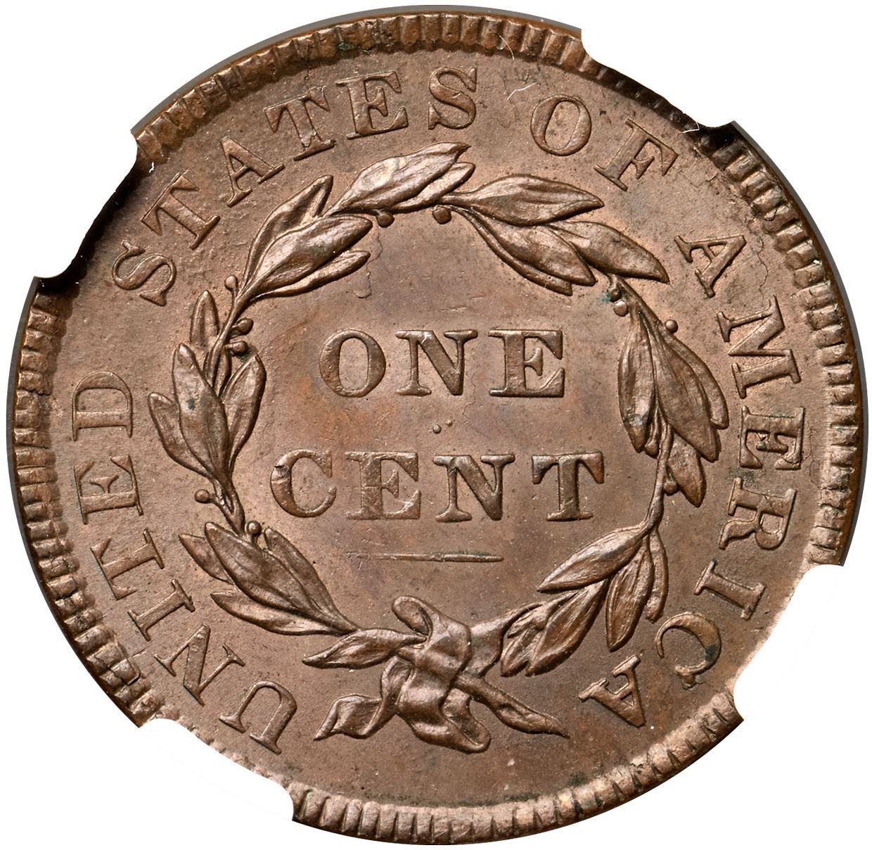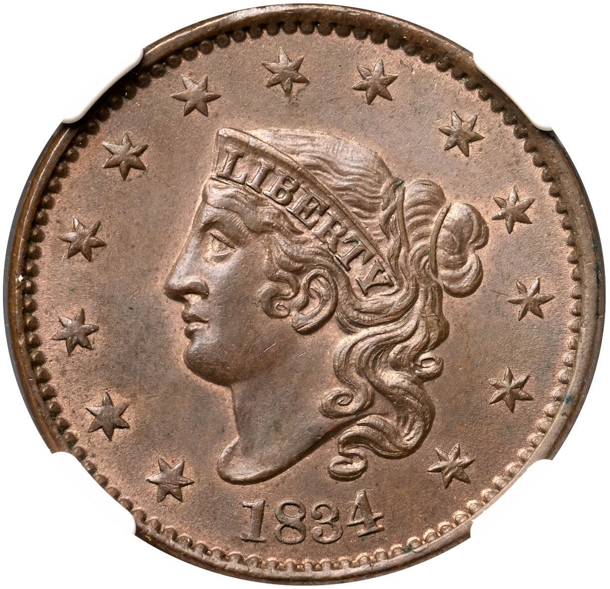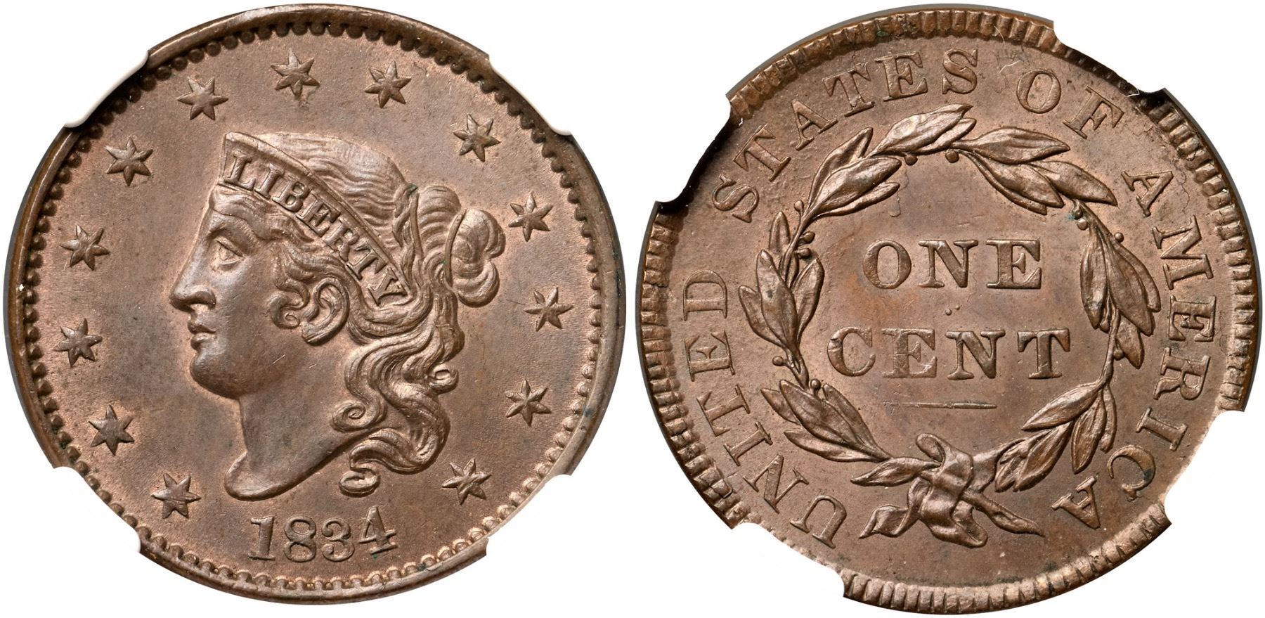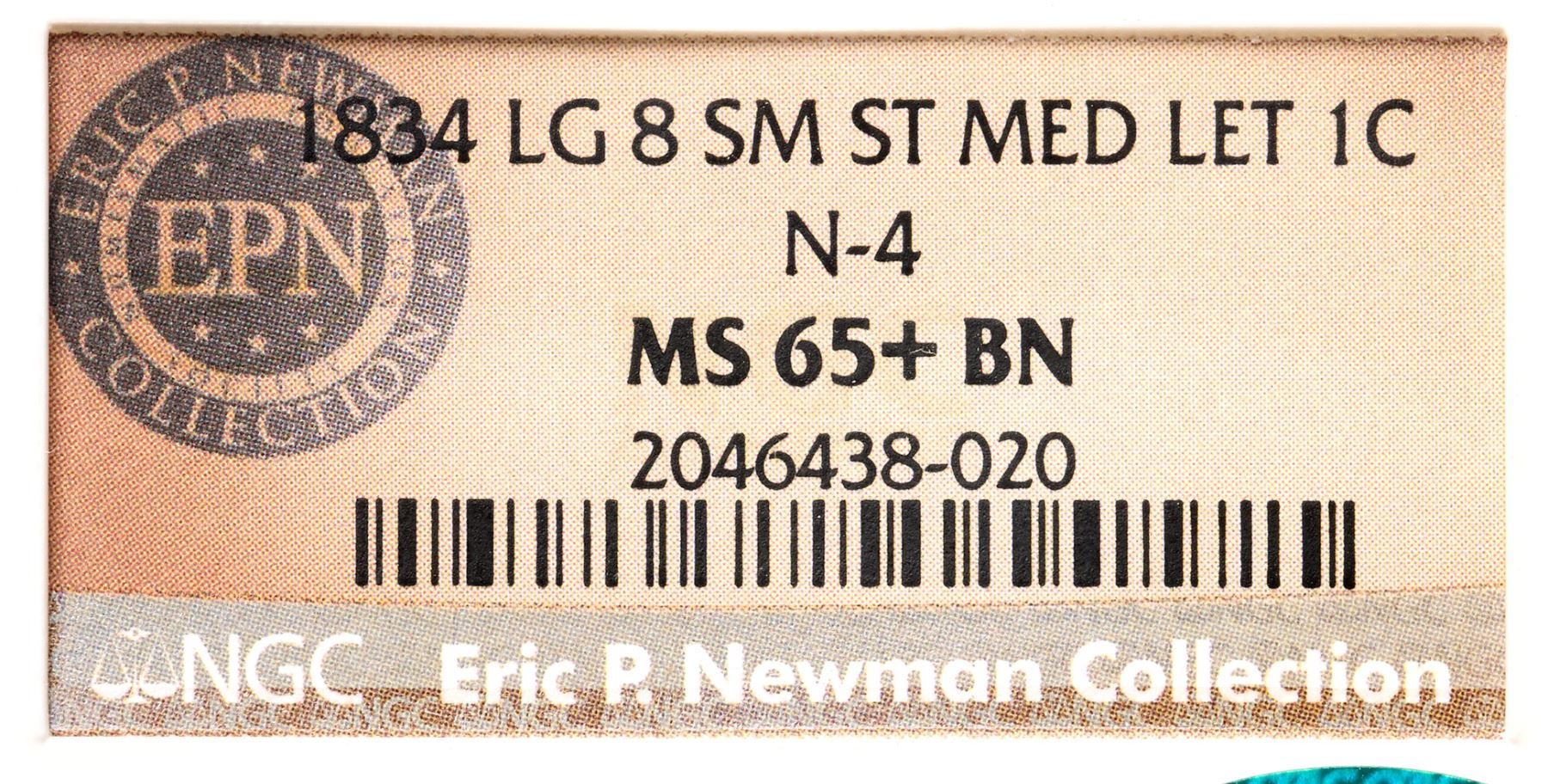1834 N-4 R2 Large 8, Small Stars, Medium Letters, NGC graded MS65+ Brown, CAC ApprovedLustrous medium steel brown with lighter reddish tan faded down from mint color in the protected areas on both sides. The surfaces are satiny and the eye appeal of this cent is really nice. The best identifying mark is a tiny speck of darker toning on the rim at star 12. Sharply struck MDS, die state c, with shallow die rust evident at NITED STATE and a die crack at F-AM. Our grade is MS63.Certificate Number: 2046438-020Pedigree: Ex Eric P. Newman Numismatic Education Society, Heritage Auctions 11/14/2014:3147-Terry S. Denman Collection