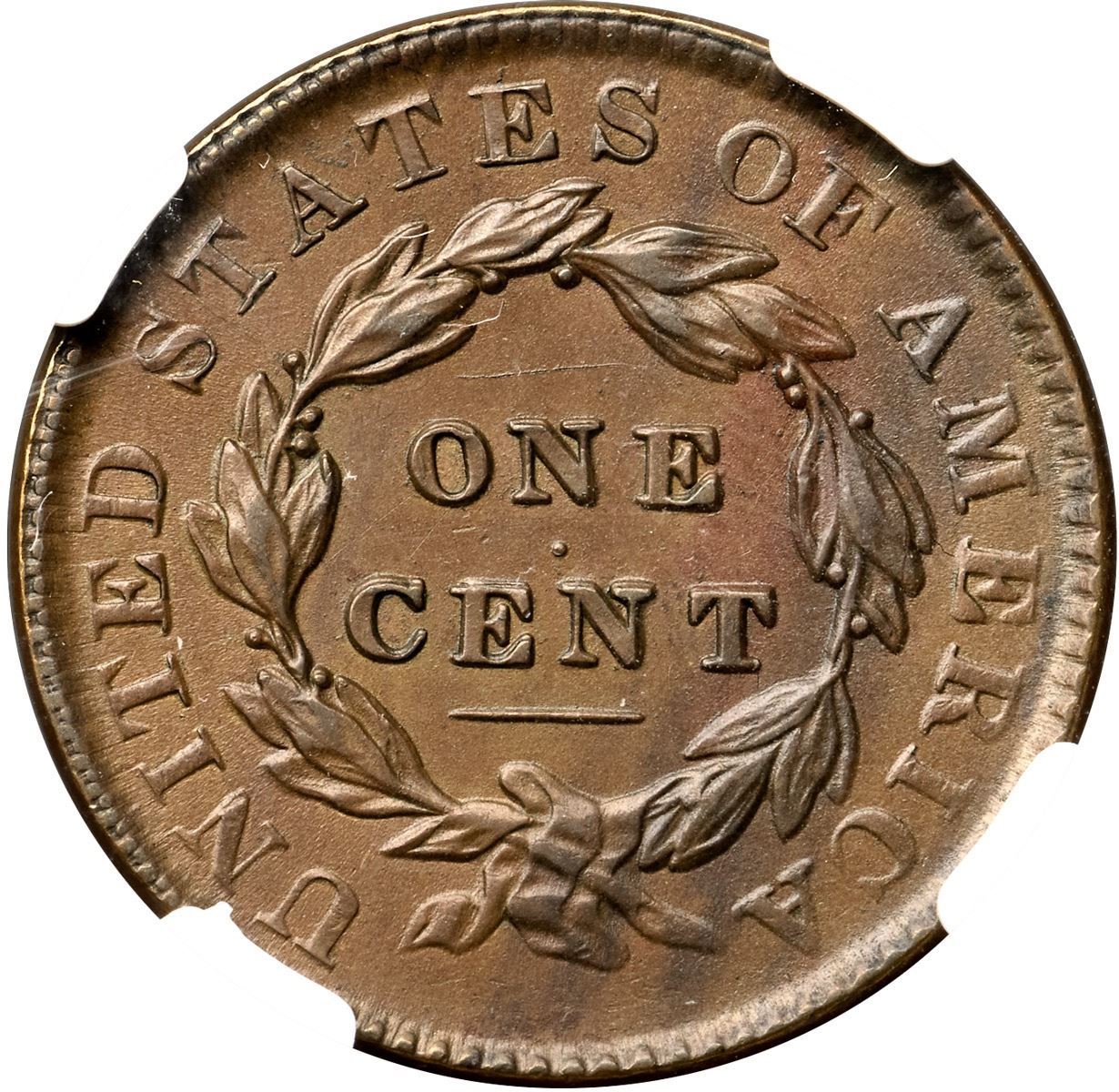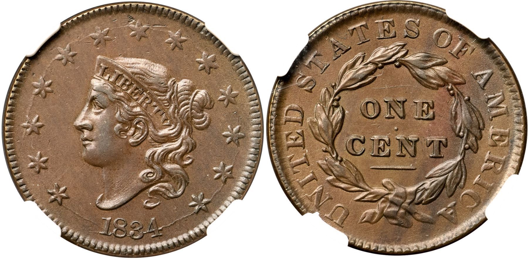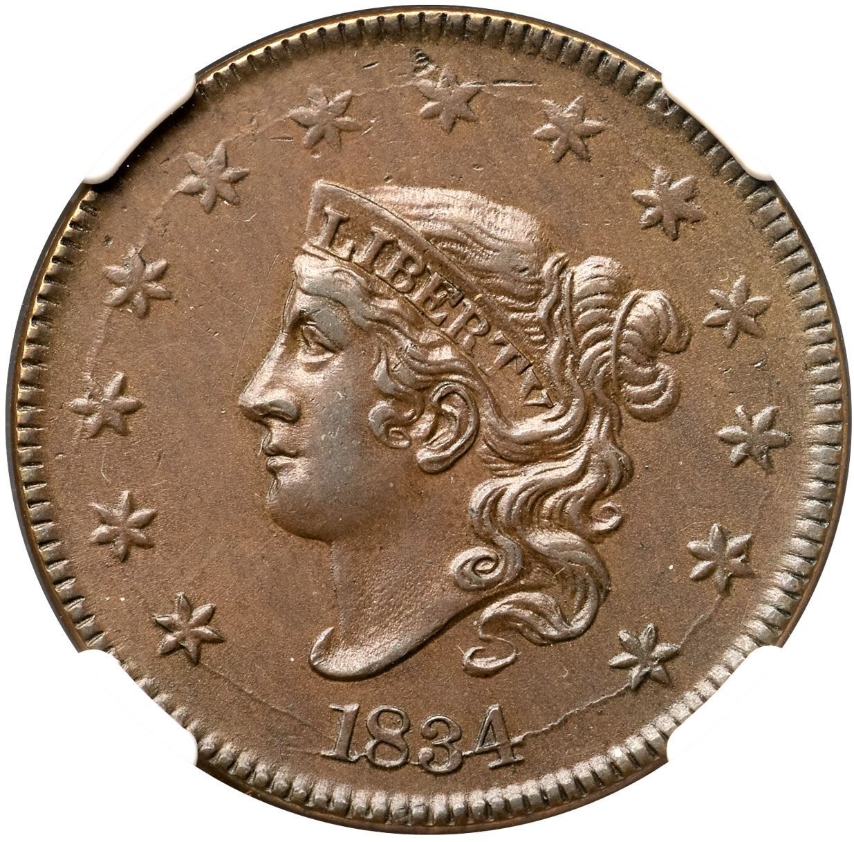 1834 N-5 R5 Large 8 & Stars, Medium Letters, NGC graded MS61 BrownVery attractive glossy light steel brown with swipes of olive and light reddish brown toning on the right side of the reverse. Underlying satiny mint frost covers the fields and protected areas on both sides and this cent has great eye appeal. There is very light friction on the devices and the notable marks are a thin nick from the right top of star 7 and a light hairline scratch over ONE. A small planchet flake over the upper left point of star 7 (as struck) is the best identifying mark. E-MDS. Both dies are worn and flowlined, as always seen on this variety because it is the product of previously used dies. The small triangular lump at the dentils right of star 8 is clear and relatively sharp. A fine but sharp double profile reaches from the forehead down to the chin. Called AU50 net EF45 and tied for CC#6 in the Noyes census, his photo #26817. Our grade is EF45+. A premium example of this very popular “Redbook” variety.Certificate Number: 3652967-001Pedigree: Ex Del Bland 8/12/1969-Jules Reiver, Heritage Auctions 1/24/2006:20003-Daniel W. Holmes, Jr., McCawley & Grellman Auctions/Goldbergs 5/30/2010:394-Chris McCawley 2012-Terry S. Denman Collection