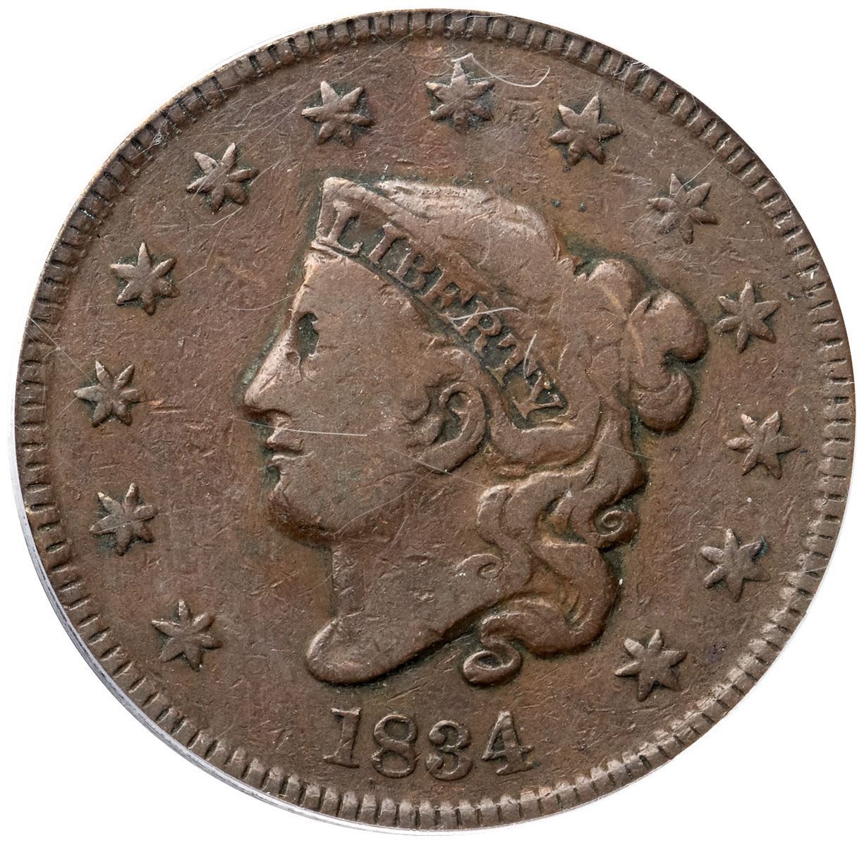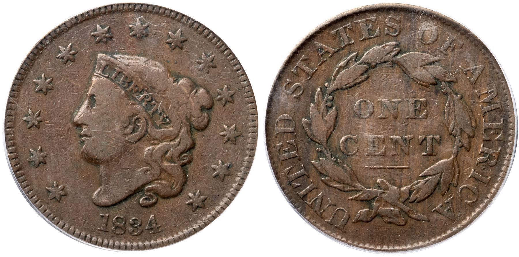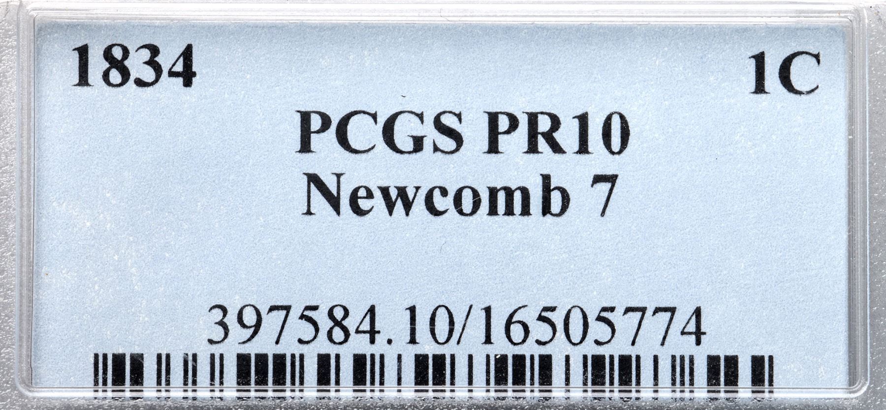 1834 N-7 R7 (Proof-Only) Large 8, Stars, & Letters, PCGS graded PR10Glossy medium brown and light chocolate delicately woodgrained with lighter brown on the reverse. No roughness, just even wear and small contact marks. None of the marks is significant, and nearly all of them are invisible to the unaided eye, but there are quite a few, especially on the obverse. A small, dull nick under the front of the eye and a light horizontal nick right of star 3 can help identify this cent. Only 9 examples of this proof-only variety are known to us, and 3 of those are well worn. This piece is the best of the "well-worn" group. So if you want to avoid paying sports-car-money to obtain the rarest variety in the 1816-1839 cent series, then this is your chance. Our grade is VG10, same as the PCGS grade.Certificate Number: 397584.10/16505774Pedigree: Ex Douglas F. Bird 4/24/2010-Terry S. Denman Collection