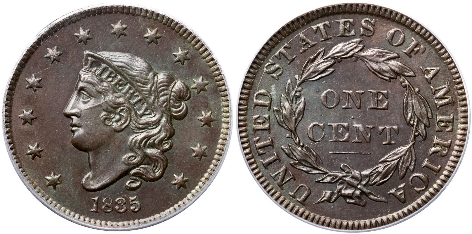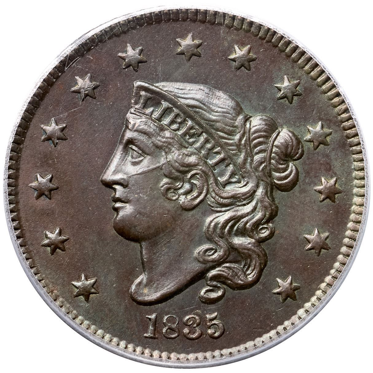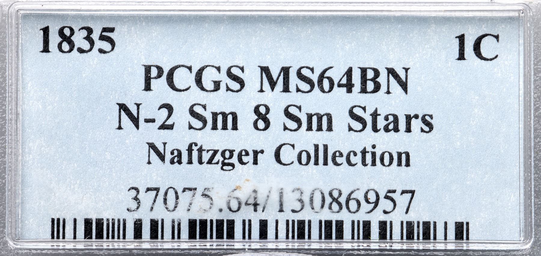 1835 N-2 R3 Head of 1834, Small 8 & Stars, PCGS graded MS64 BrownLustrous dark chocolate and olive brown with delicate overtones of bluish steel on both sides. The fields are satiny and the eye appeal of this cent is excellent. The only marks are a tiny nick in the hair at the brow, a speck of darker toning over the left edge of the O in ONE, and a tiny planchet chip right of the center dot on the reverse. Sharply struck EDS, die state a. The repunching at UN is sharp, including a fine but complete arc inside the bottom of the U. The die cut across the cheek is bold. Called MS63 and tied for CC#1 in the Bland census. Noyes says MS60 net AU50 and tied for CC#4, his photo #21868. Our grade is MS62+, close to MS63.Certificate Number: 37075.64/13086957Pedigree: Ex Barney Bluestone 2/16/1946:741-Dr. Kenneth J. Sartoris 5/1972-Del Bland-C. Douglas Smith-Jerry A. Bobbe 9/1975-Myles Z. Gerson 7/1980-R. E. "Ted" Naftzger, Jr.-Naftzger Estate, McCawley & Grellman Auctions/Goldbergs 2/1/2009:312-CHris McCawley-Terry S. Denman Collection
