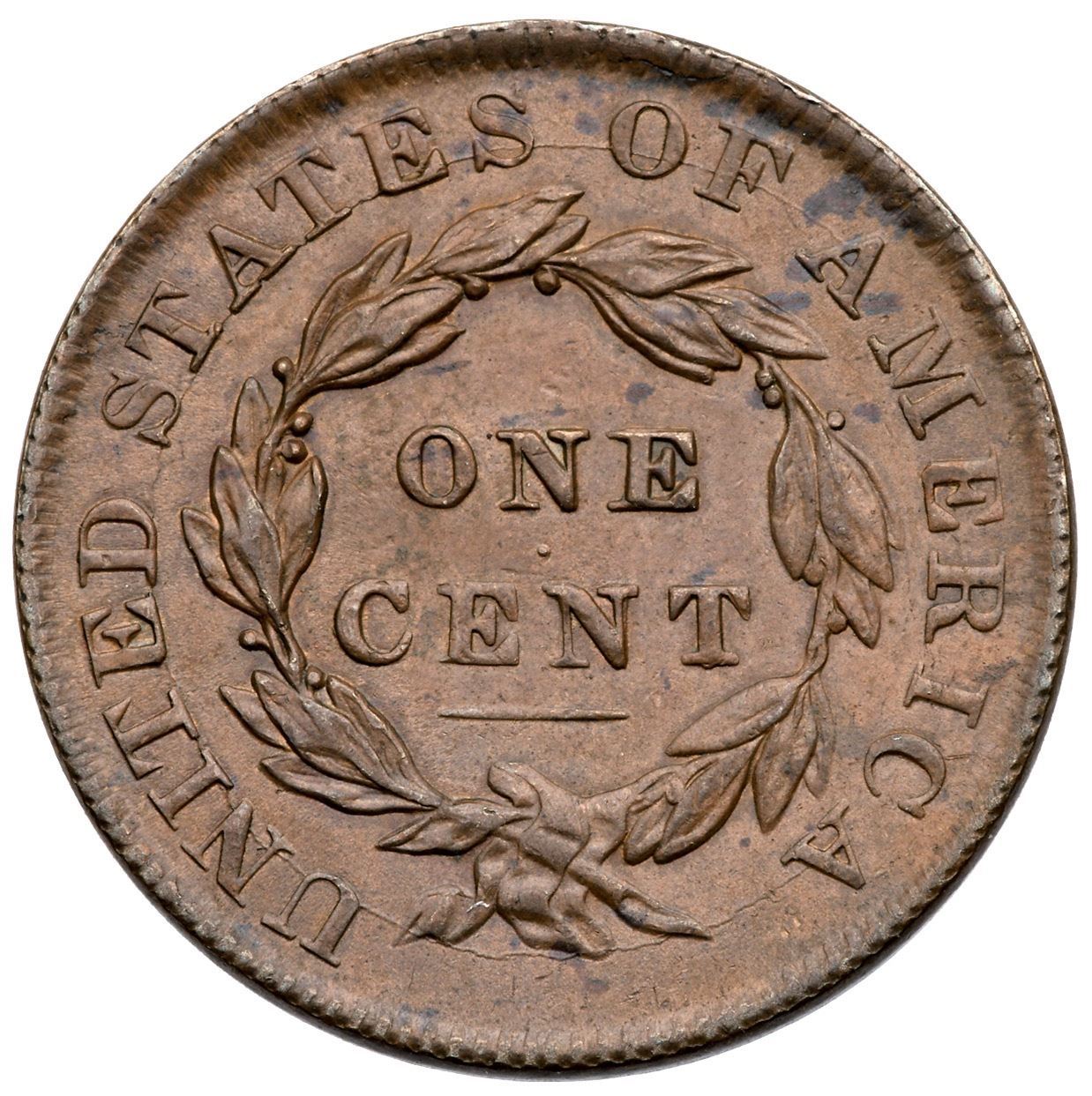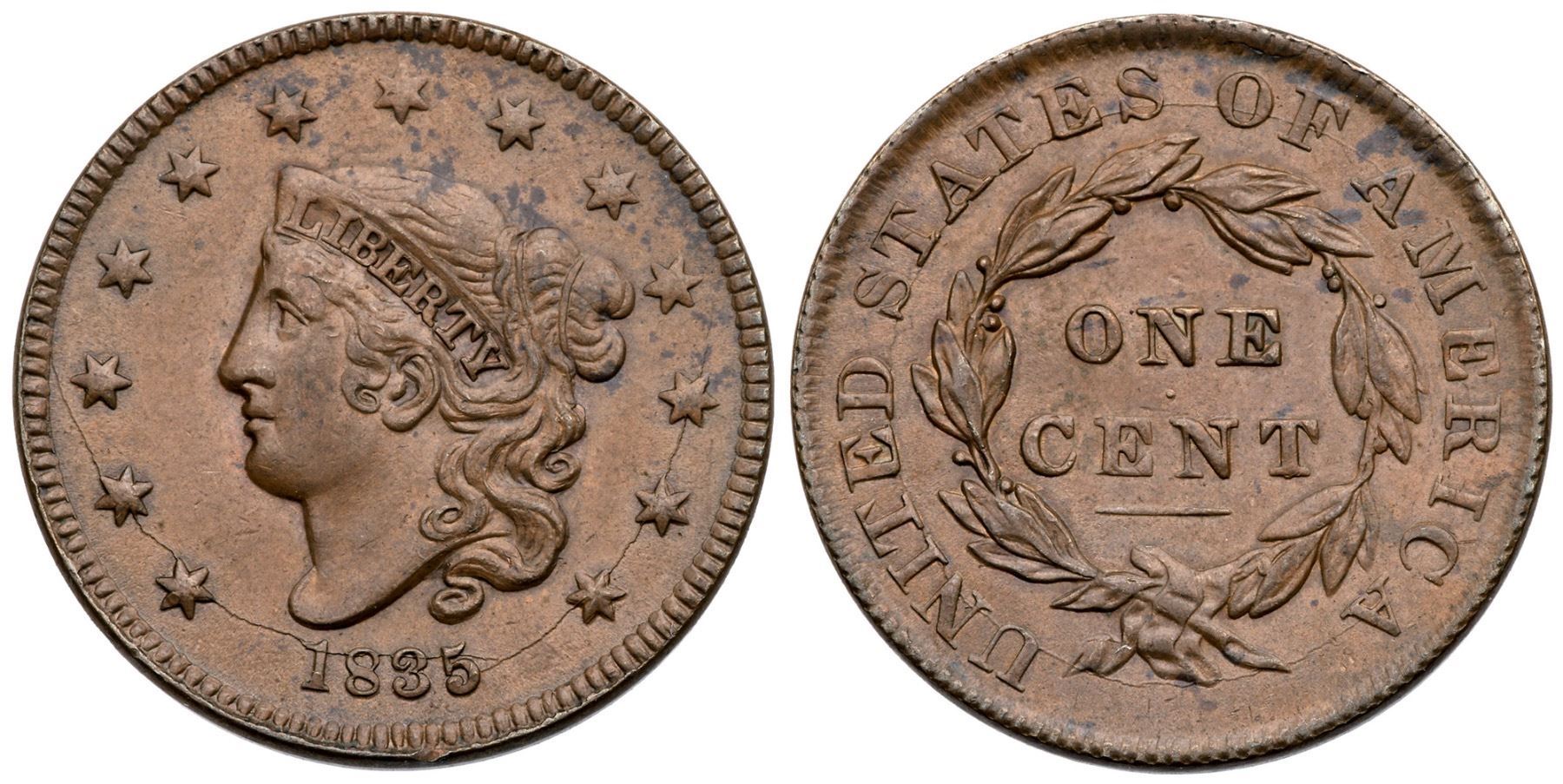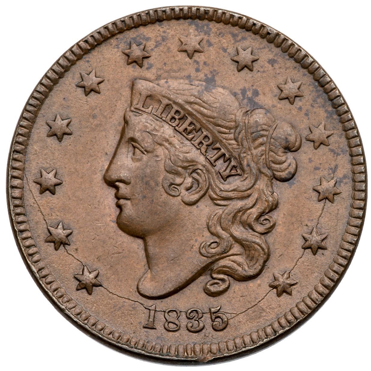 1835 N-3 R3 Head of 1834, Small 8 & Stars EF45Frosty light to medium brown and light chocolate with frosty mint luster covering the fields and protected areas. There are specks of dark olive toning peppered about the field at stars 6-11 with some more on the reverse, mostly at ES-OF-AM. The only contact marks are a small rim nick under the 3 in the date and a tiny tick just right of the eye, both marks totally insignificant. E-MDS, die state b early, before the tiny rim cuds occur in the dentils roots below the 35 or at the bottom of star 2. The reverse is rotated 20 degrees CW. Called EF45 and tied for CC#3 in the Bland census. Noyes says AU50 net VF35 and CC#4, his photo #26078 (can't see any reason for such a deduction). This variety is unknown in mint state by EAC grading standards. This is the Newcomb plate coin for the variety (see plate VII for the 3-4-10 obverse and plate VIII for the C reverse. (Removed from an NGC slab graded MS63BN following the Rasmussen sale in 2005.) A great cent with a great provenance.Certificate Number: Pedigree: Ex Howard R. Newcomb, J. C. Morgenthau & C0. 5/16/1945:660-Floyd T. Starr, Stack's 6/13/1984:295-Wesley A. Rasmussen, Heritage Auctions 1/13/2005:3632-Daniel W. Holmes, Jr., McCawley & Grellman Auctions/Goldbergs 5/30/2010:403-Chris McCawley 12/17/2010-Terry S. Denman Collection