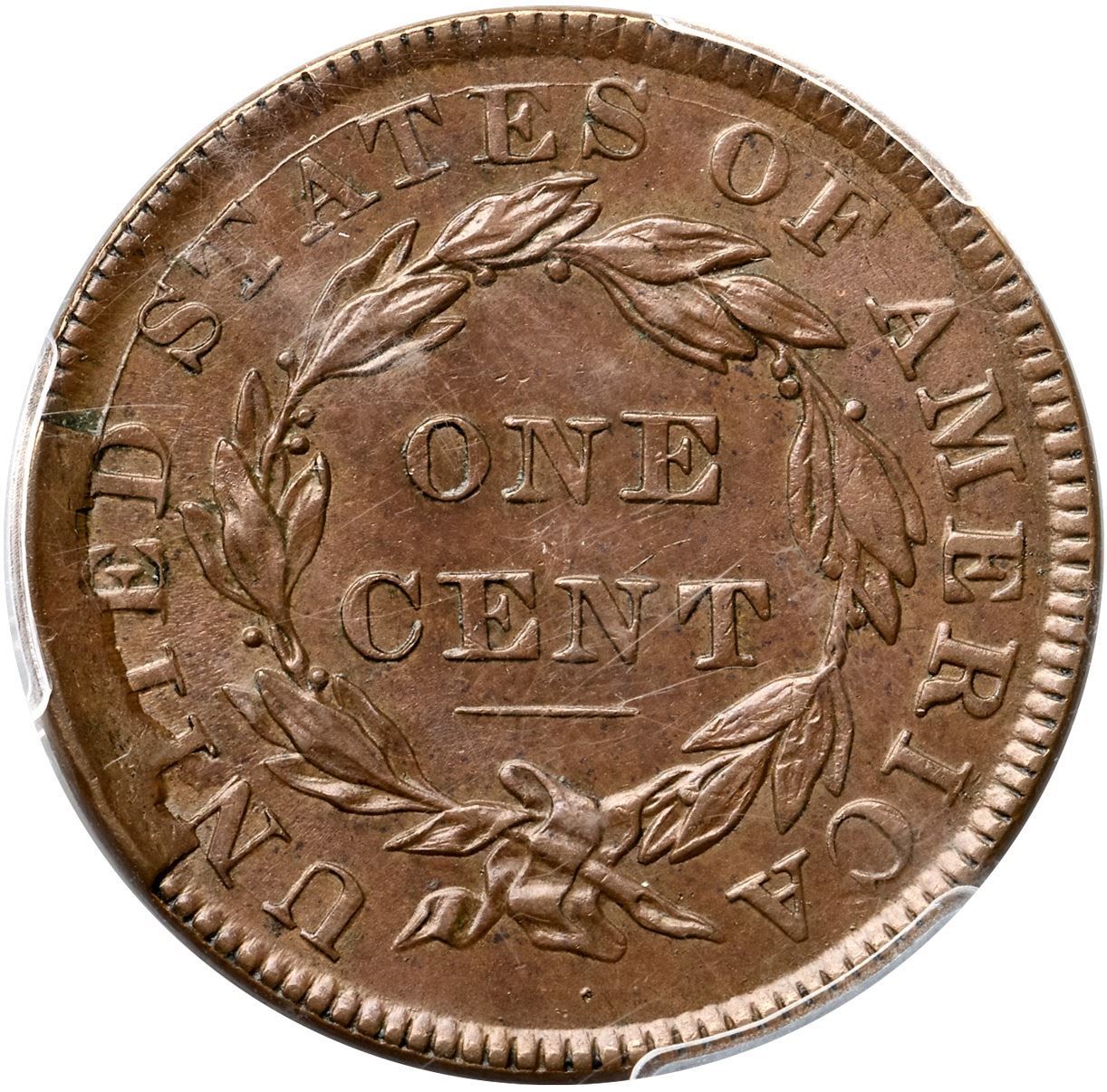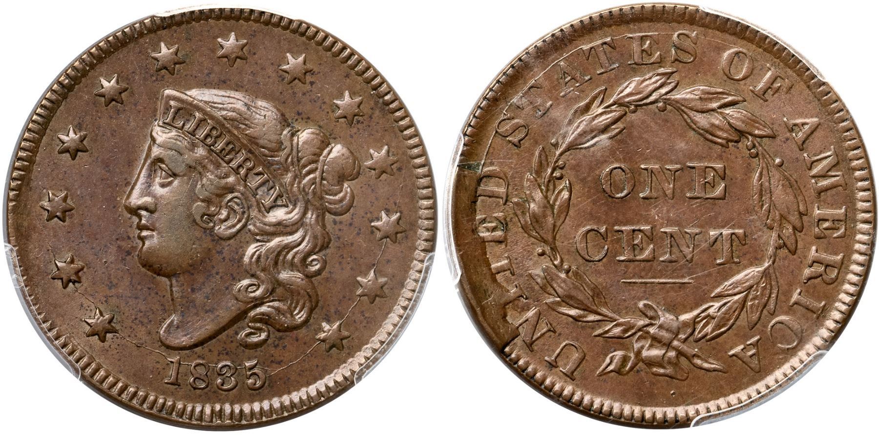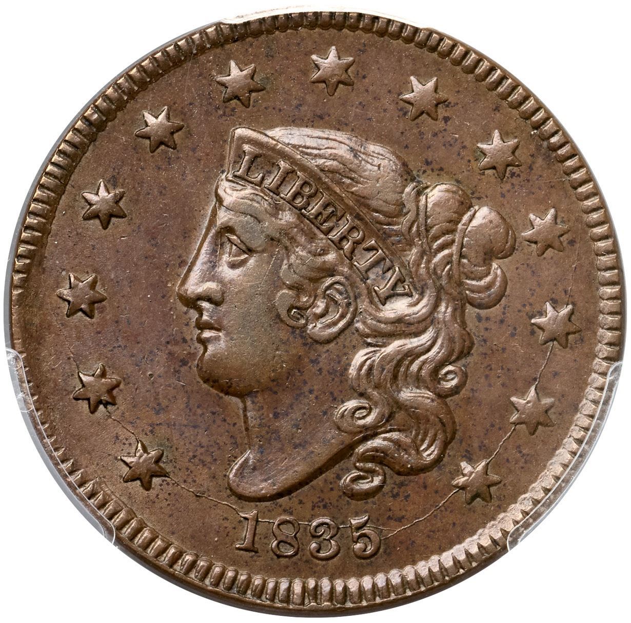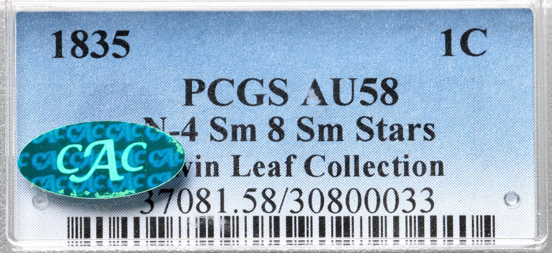 1835 N-4 R4+ Head of 1834, Small 8 & Stars, PCGS graded AU58, CAC ApprovedChoice glossy medium brown and light chocolate with mint frost in the protected areas on both sides. Very tiny specks of darker olive brown toning are scattered over the obverse, none visible without the aid of a glass. Lightly worn on the devices and nearly flawless. Some tiny ticks in the field off the end of the nose are the only notable contact marks, and you need a glass to see them. Rare LDS, die state e, with a fully raised cud break at NITED (a single low grade example of a later die state has a slightly raised retained cud over D-STA). This is the finest known example of the variety and of this impressive die state. Graded AU55 net EF45 and CC#1 in the Noyes census, his photo #29374. Our grade is EF45+, close to AU50. An impressive cent: a wonderful combination of rarity, eye appeal, and die state.Certificate Number: 37081.58/30800033Pedigree: Ex Charles J. DuPont (Anderson DuPont Sale), Stack's 9/24/1954:735-Judge Thomas L. Gaskill-Dennis E. Steinmetz 12/1978-Andrew M. Hain, Stack's 1/15/2002:801-W. M. "Jack" Wadlington (The Twin Leaf Collection), Stack's Bowers 7/16/2015:2249-Terry S. Denman Collection