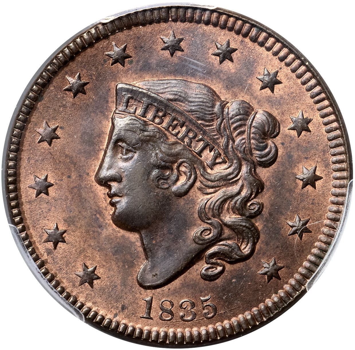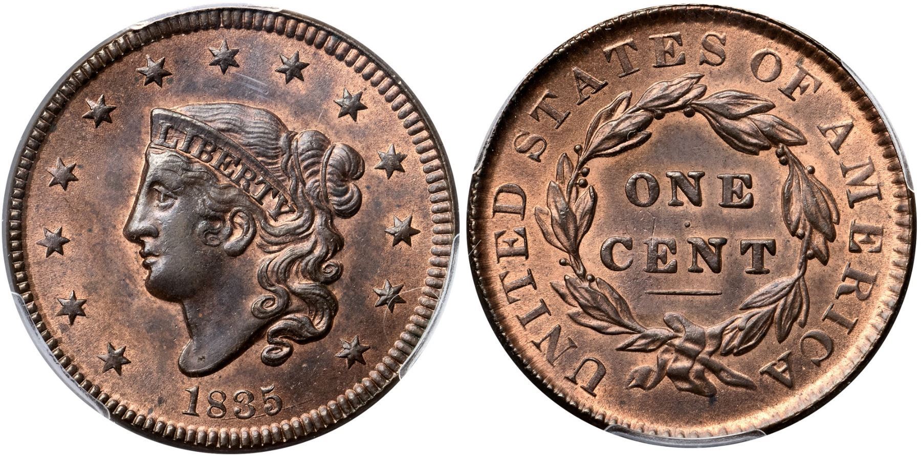 1835 N-5 R2 Head of 1834, Small 8 & Stars, PCGS graded MS64 Red & BrownChoice lustrous mint red fading to steel brown and olive on the highpoints with at least half of the original mint color remaining. Nearly flawless with satiny surfaces and superior eye appeal. The best identifying marks, and it takes a glass to see them, are a tiny planchet flake on the bust over the 1, a thin vertical struck-through line at the top of the E in CENT, and a tiny spot of darker toning (not carbon) at the left top of the F in OF. MDS with fine radial die flowlines in the obverse fields. The line at the bottom of the 835 is clear. Not listed in the Noyes census. Our grade is MS64, finest known in our census; clearly superior to the finest listed in the Noyes census. A wonderful example of the Head of 1834 type.Certificate Number: 37085.64/36186795Pedigree: Ex Chris McCawley 4/25/2019-Terry S. Denman Collection