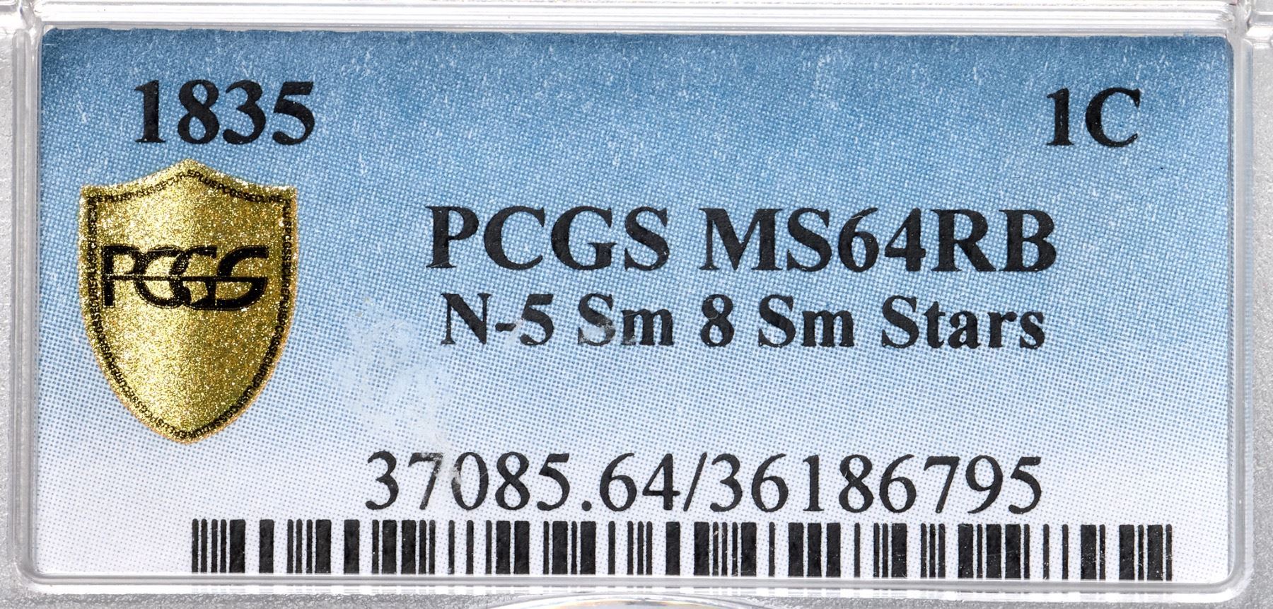 Lot 56 1835 N-5 R2 Head of 1834, Small 8 & Stars, PCGS graded MS64 Red & Brown