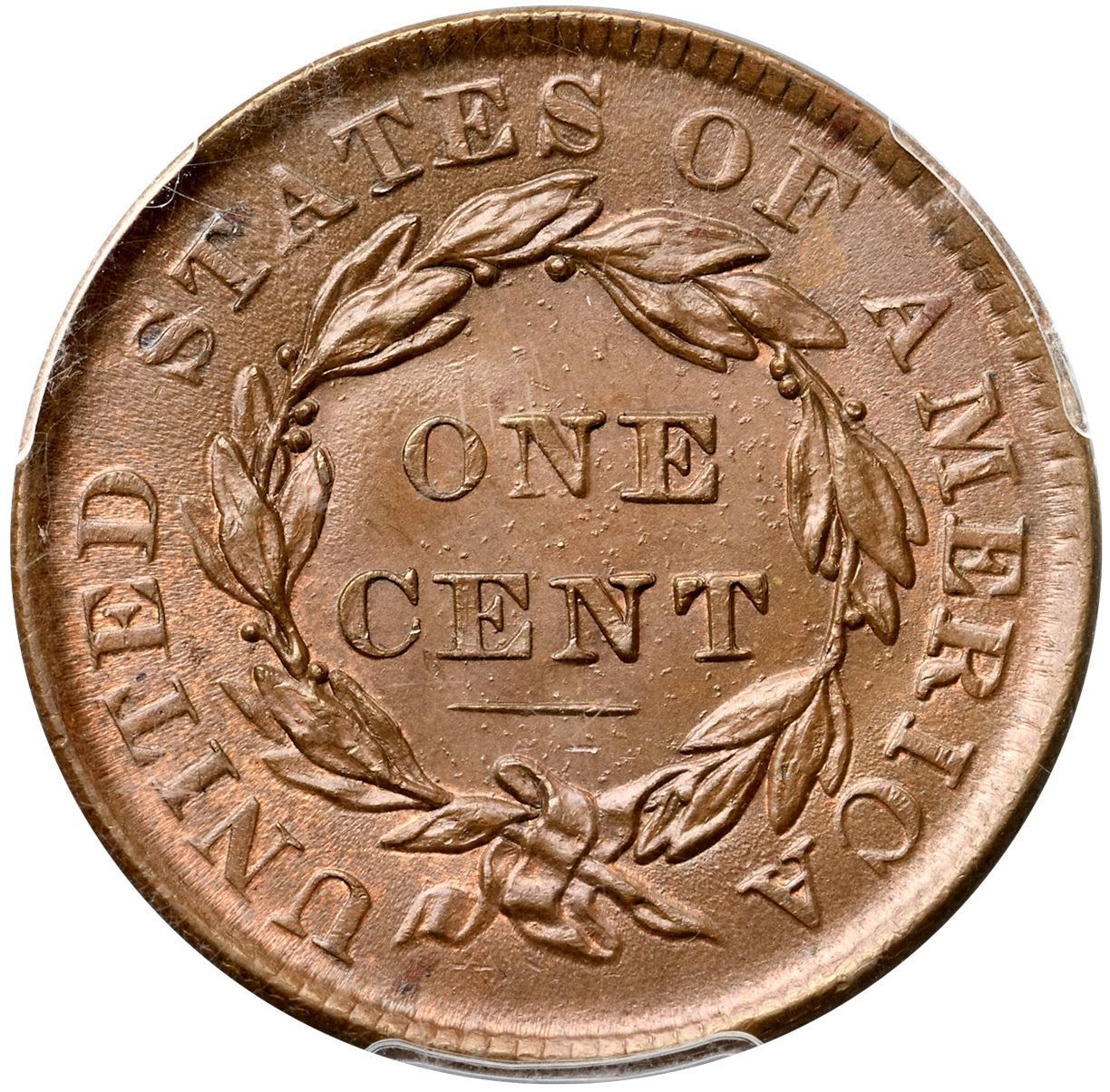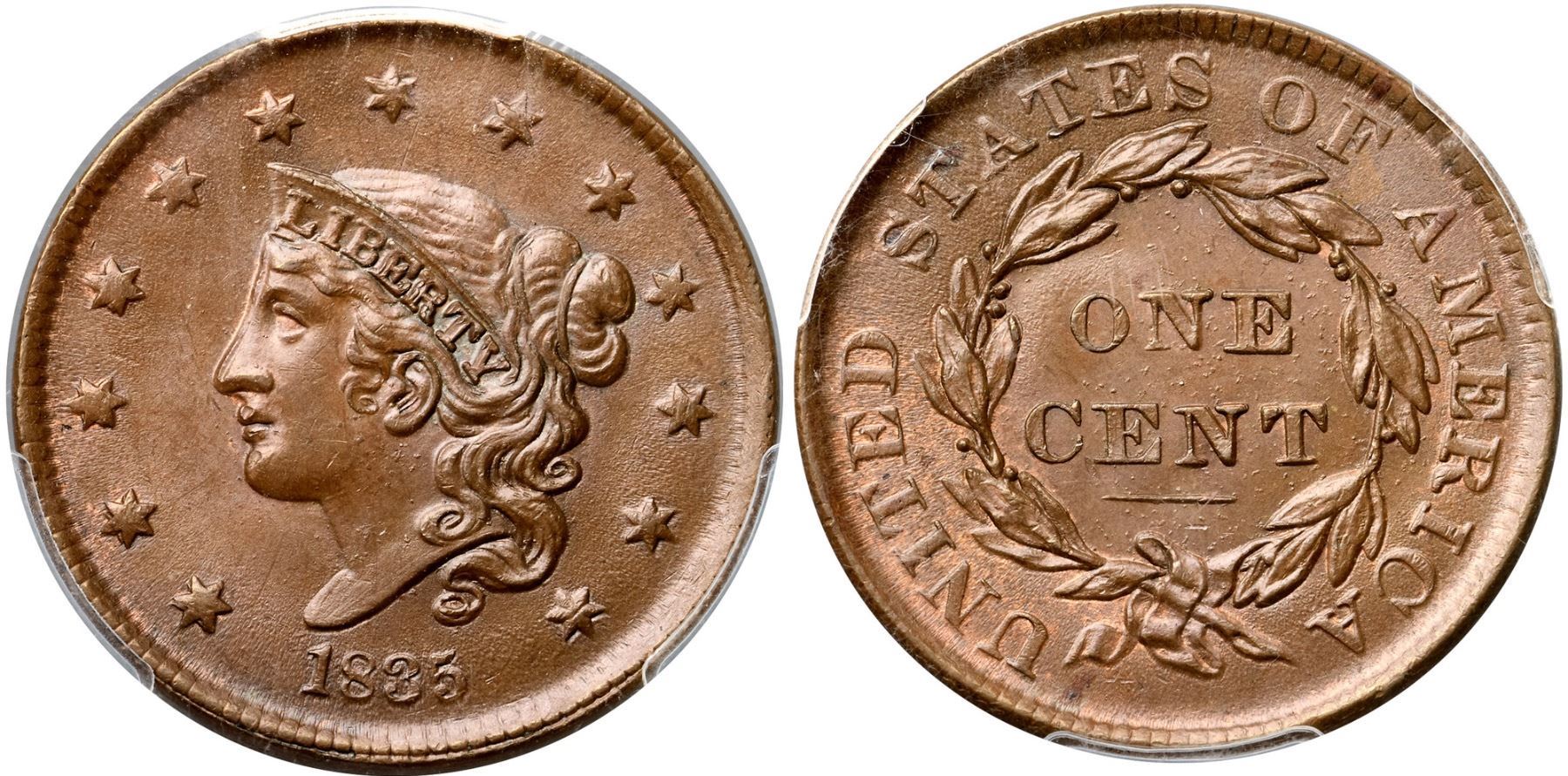 1835 N-7/17 R1 Head of 1836, PCGS graded MS64 Brown, CAC ApprovedLustrous light to medium brown with traces of mint red in protected areas. Satiny and quite attractive but there are a few microscopic marks. The notable marks are a few very light scratches and abrasions on the cheek and a few more in the field between the mouth and star 2. None of these marks is visible to the unaided eye, and even with a glass you need just the right angle on the light to catch them. LDS, die state b. The earlier lumps on the bottoms of the 1 & 8 are gone, the fields are flowlined, and there are tiny lumps from die rust evident on both sides, clearest in the field around ONE CENT. This is Newcomb's #17. There is a clear double profile on the forehead, nose, lips, and chin with additional doubling on stars 1-5 (from die bounce or "machine doubling). Graded MS63 and tied for CC#1 honors in the Noyes census. Our grade is MS63 net MS62 (but the eye appeal suggests the higher grade).Certificate Number: 37057.64/30800036Pedigree: Ex Thomas J. Wass-Louis Helfenstein, Lester Merkin 8/14/1964:155-R. E. "Ted" Naftzger, Jr. (via William C. Noyes) 4/2003-W. M. "Jack" Wadlington (The Twin Leaf Collection, Stack's Bowers 7/16/2015:2254-Terry S. Denman Collection