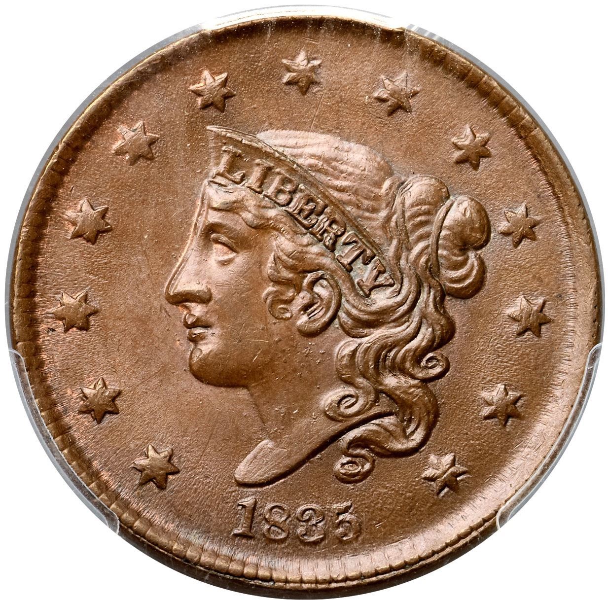 Lot 58 1835 N-7/17 R1 Head of 1836, PCGS graded MS64 Brown, CAC Approved