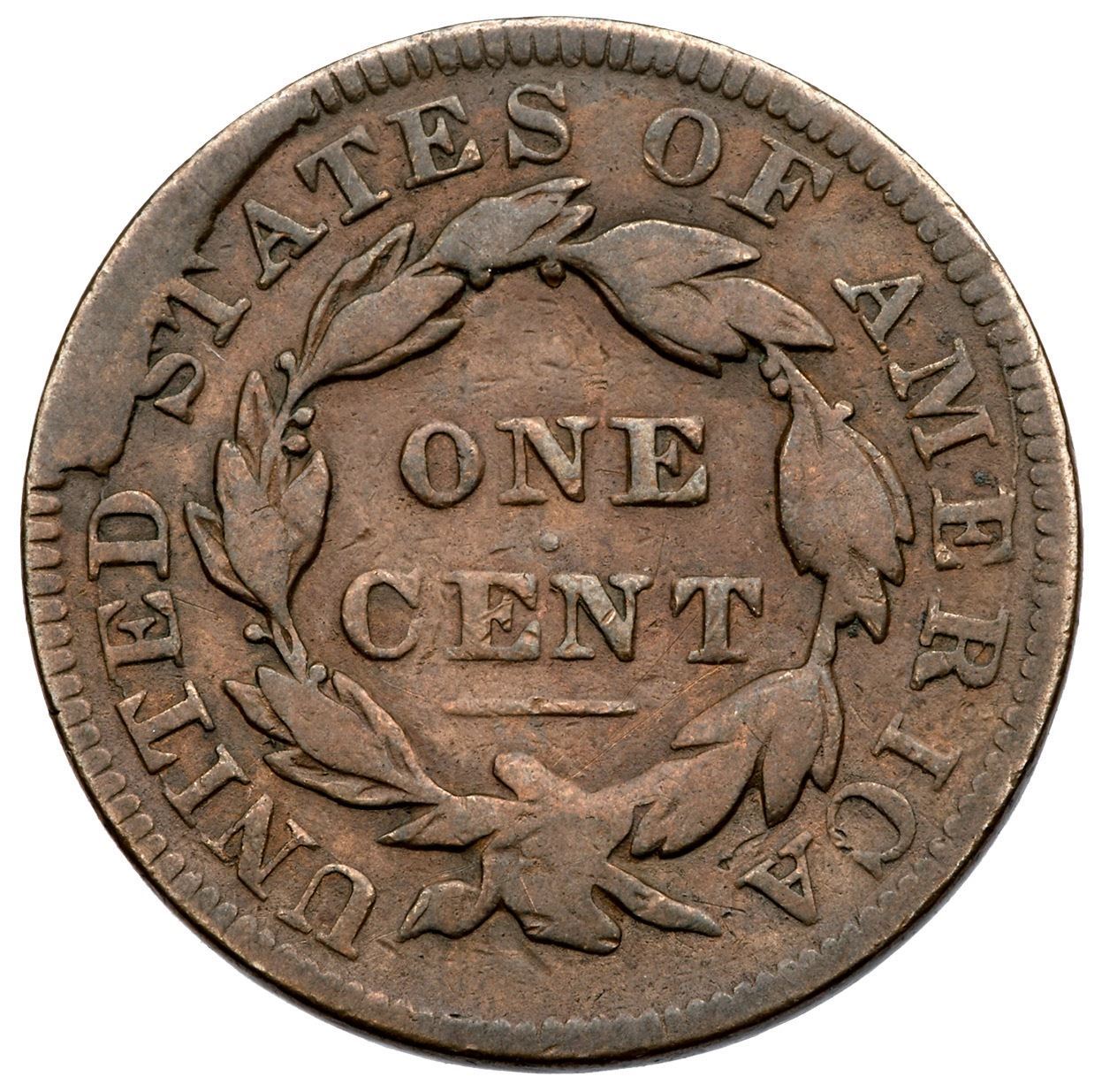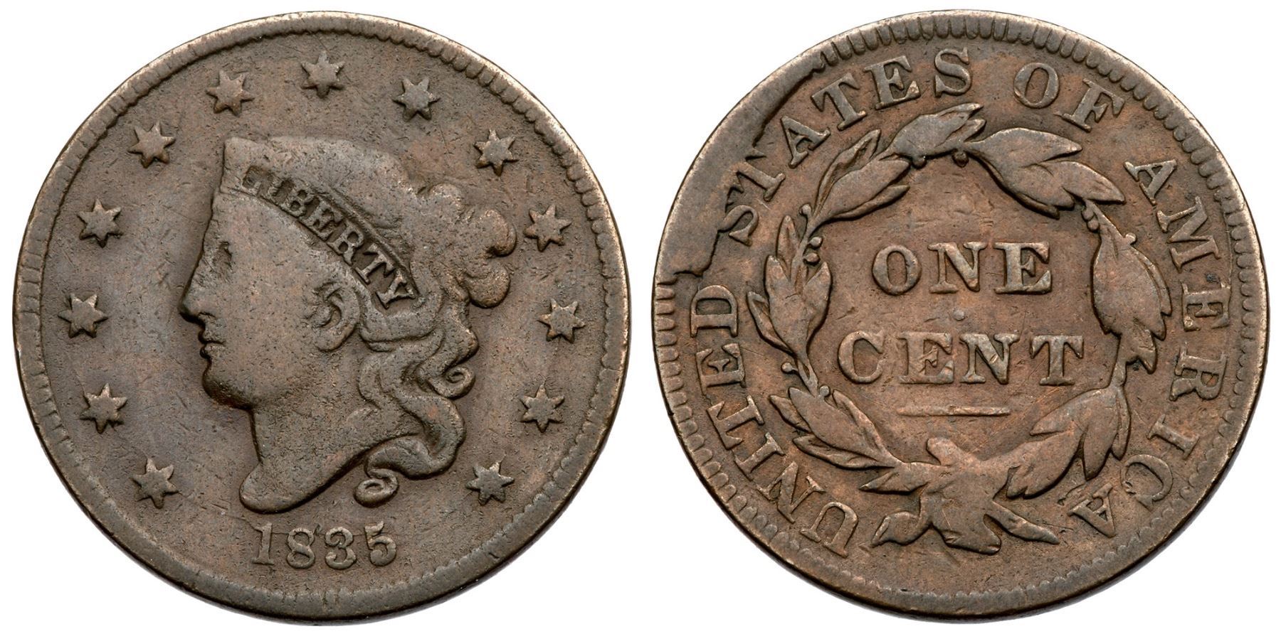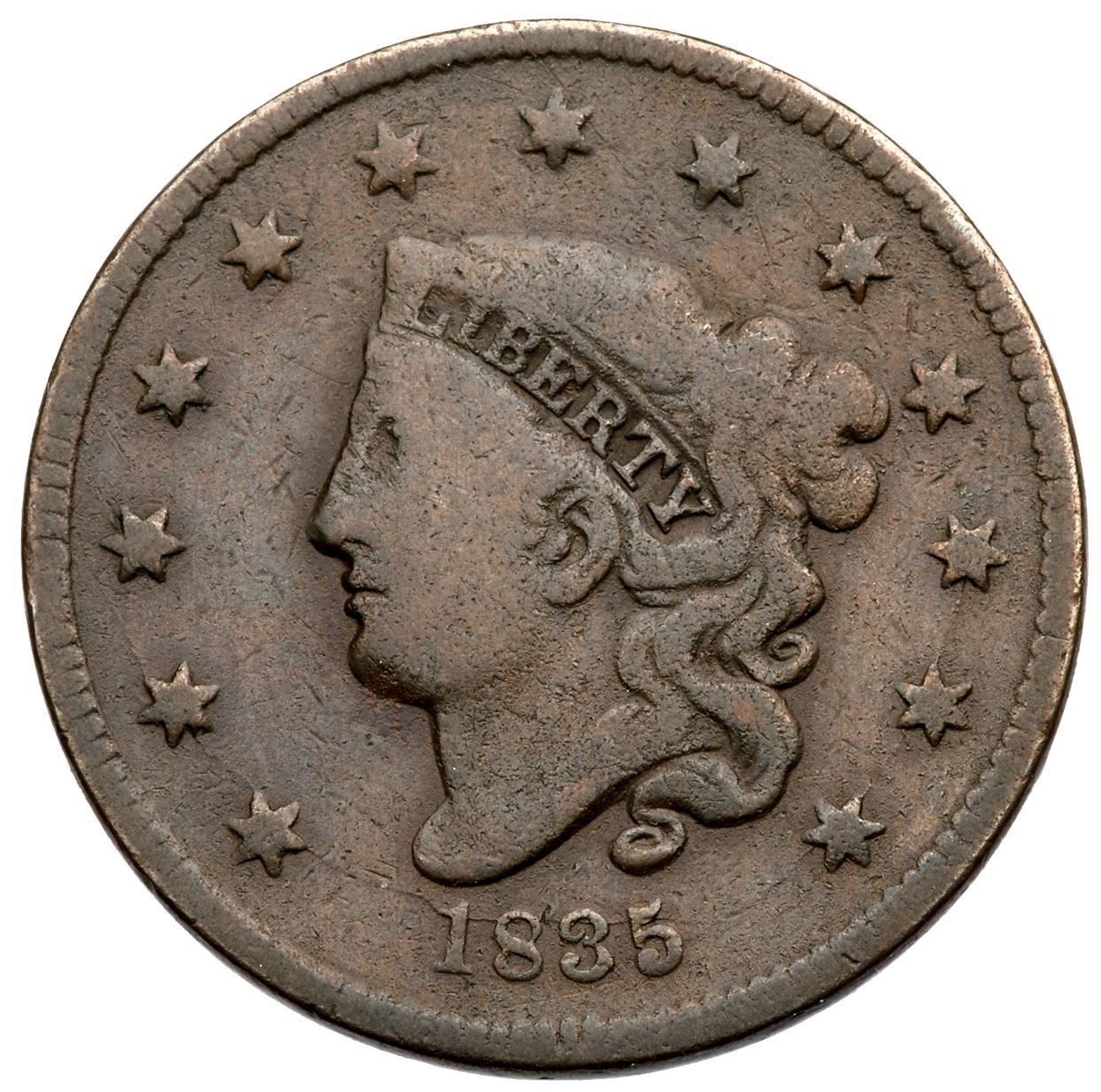 1835 N-10 R4+ Head of 1834, Small 8 VG7+Glossy light olive and steel brown blending to light chocolate in protected areas. Very attractive with even wear and trivial marks, quite nice for a worn cent, close to VG8. Very rare terminal die state, state e, with a bold cud break at D-STAT. Graded VG10 net VG7 and finest of the terminal die state in the Noyes census, his photo #20946. And it comes with a very impressive provenance.Certificate Number: Pedigree: Ex Henry C. Hines-Dr. William H. Sheldon-Floyd T. Starr, 1949 ANA Sale, lot 1693-Willard C. Blaisdell 9/1976 (via Del Bland)-R. E. "Ted" Naftzger, Jr.-William C. Noyes 8/17/2011-Terry S. Denman Collection