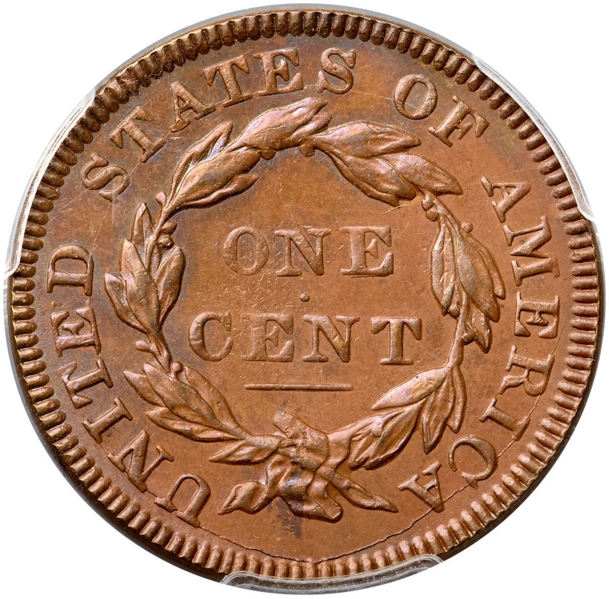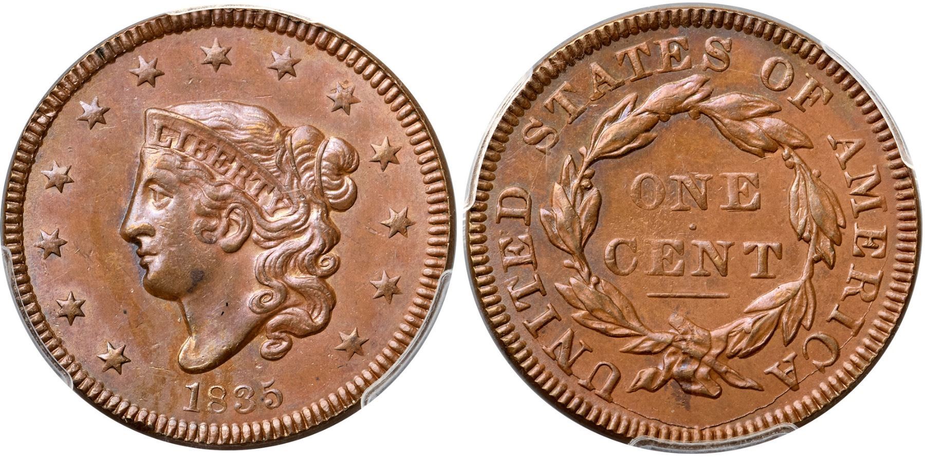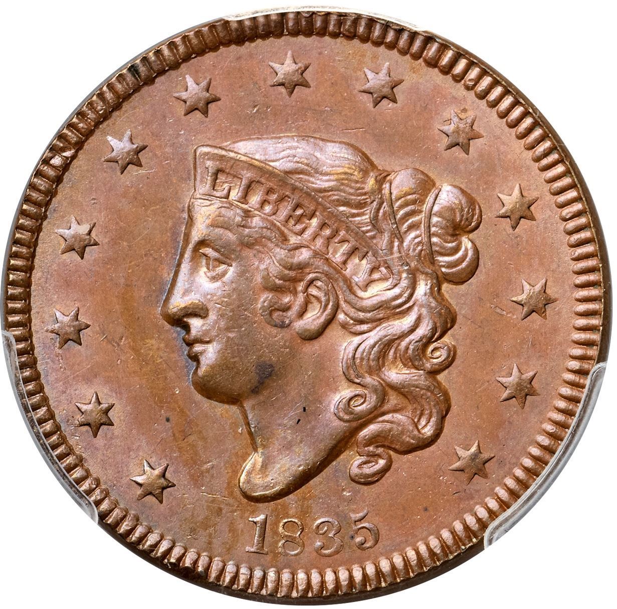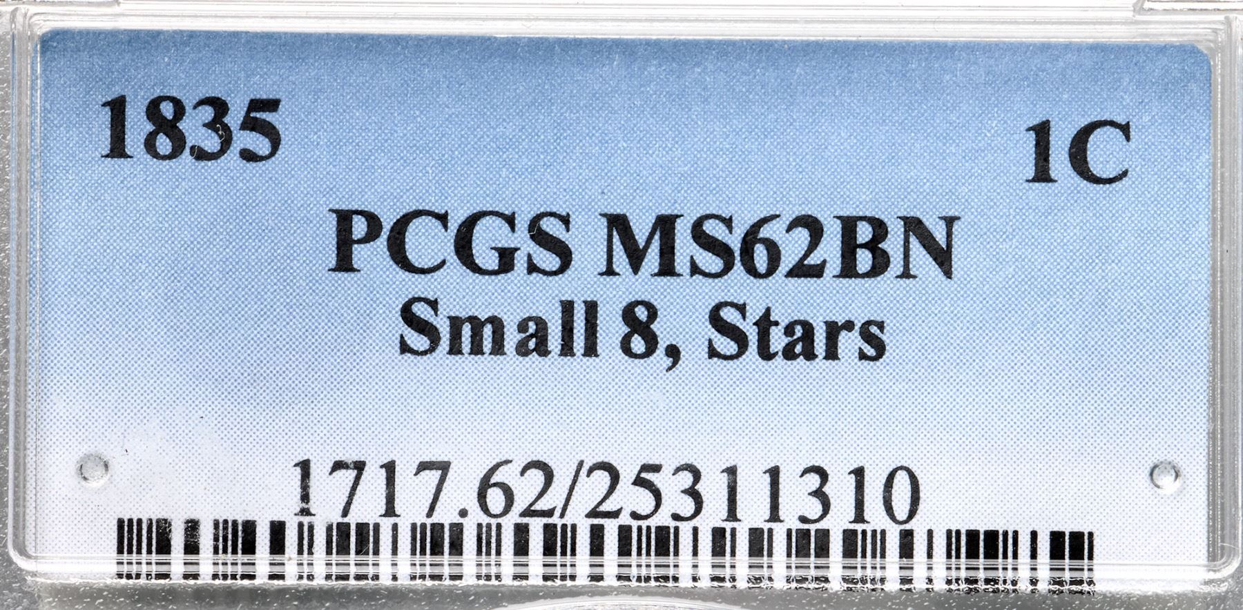 1835 N-11 R4+ Head of 1834, Small 8 & Stars, PCGS graded MS62 BrownAttractive lustrous light to medium steel brown with subtle hints of light bluish steel overtones in the fields and protected areas. Slightly darker steel brown toning shows on the highest points of the devices. The fields are satiny and this cent has very nice eye appeal. The notable marks are a light rim bruise left of the date, a small planchet chip or nick in the dentils left of star 5, a puff of dark olive toning on the jawline, and a small vertical swipe of darker toning on the bottom of the wreath ribbon. E-MDS, die state a. There is a faint die crack or die line passing through the base of 835 and there are fine die cracks through most of the legend on the reverse. The dentils around both sides are bold. Our grade is MS60. This cent is the second finest known of the variety. The next best are a pair of AU50 examples, and one of those is impounded in the ANS. The condition census falls off quickly following those two pieces. A very nice cent.Certificate Number: 1717.62/25311310Pedigree: Ex Lee J. Bellisario, McCawley & Grellman Auctions/Goldbergs 8/31/2014:342-Terry S. Denman Collection