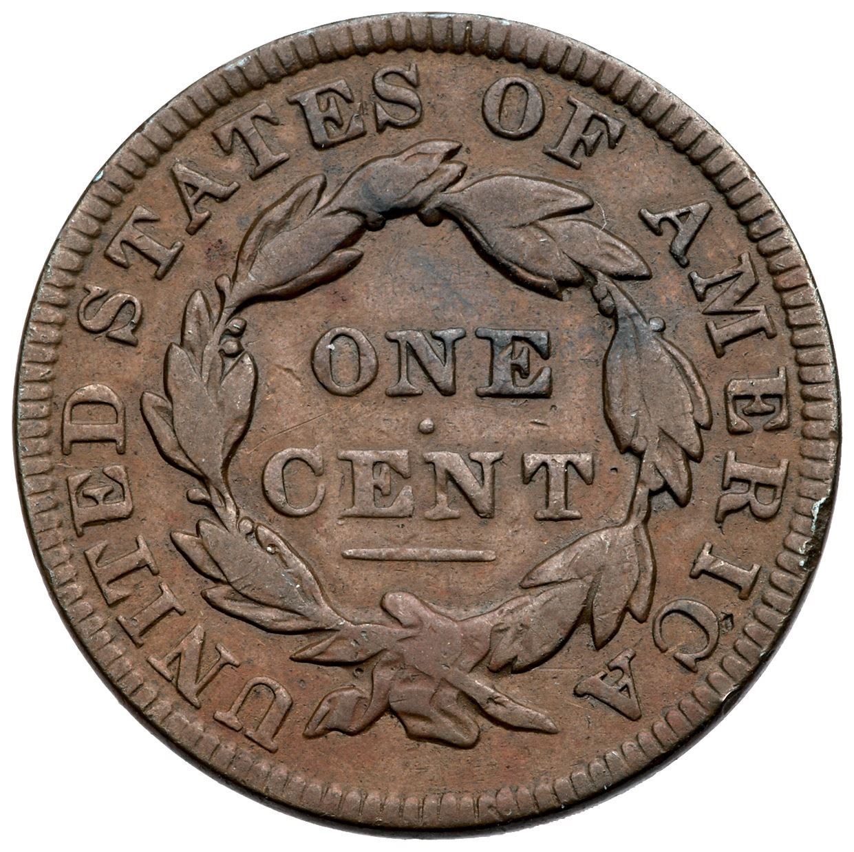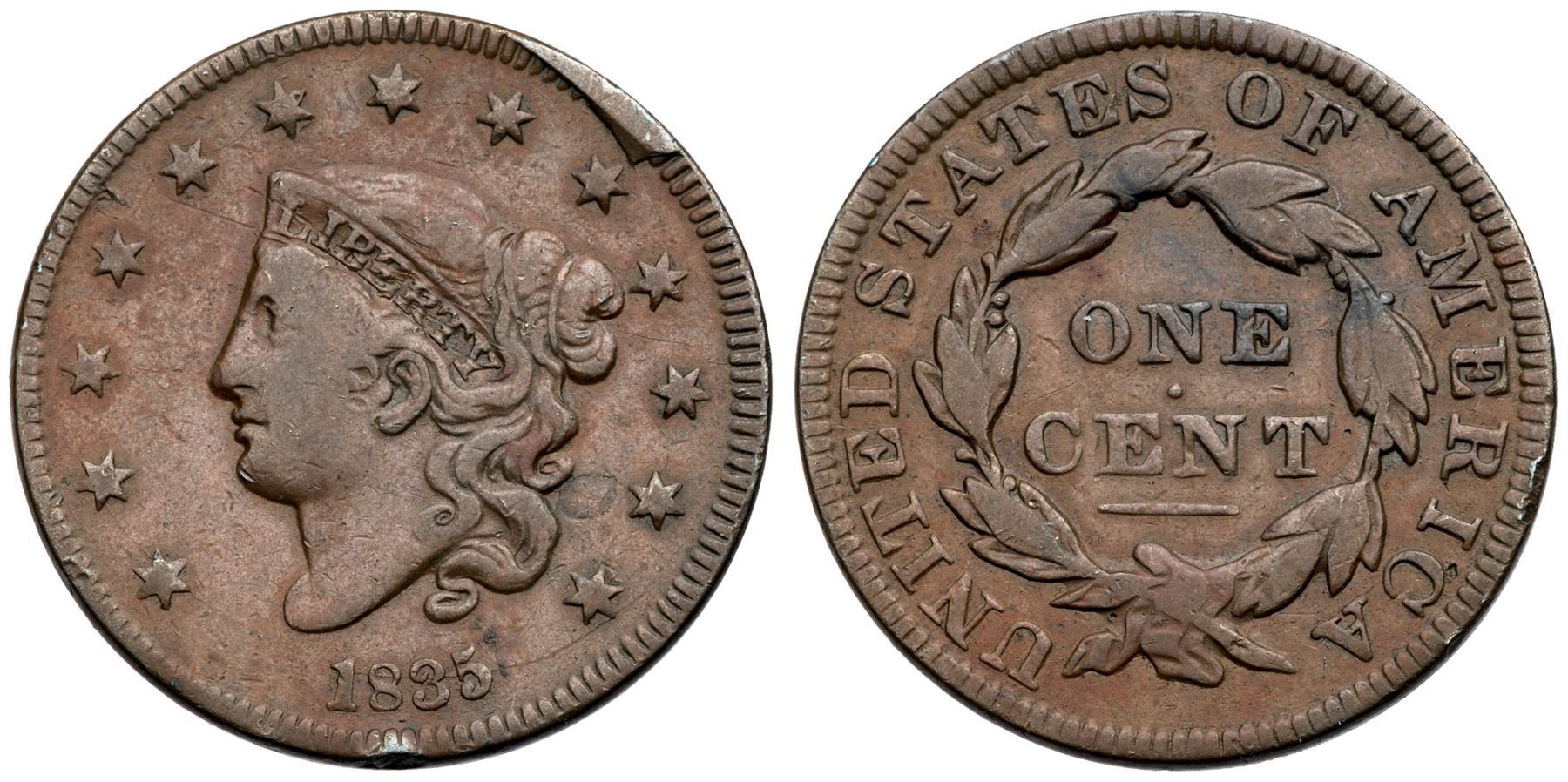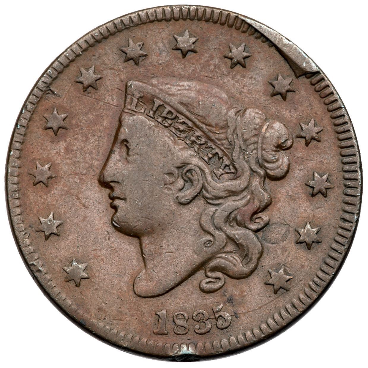 1835 N-12 R4+ Head of 1834, Small 8 F12Several points sharper but there is a dull rim nick under the 8 plus a lighter one at RI in AMERICA. Otherwise just a few trivial contact marks on smooth, attractive surfaces. Glossy medium brown and light chocolate with a wisp of darker steel brown from the E in STATES to the E in ONE. Rare LDS, die state d, with a strong cud break at the dentils over star 8 angling down to just above the outer point of star 9. Struck with the reverse rotated 40 degrees CW. Called VF20 net F12 and tied for third finest of the terminal die state in the Noyes census, his photo #27501.Certificate Number: Pedigree: Ex Jules Reiver, Heritage Auctions 1/24/2006:20034-Daniel W. Holmes, Jr., McCawley & Grellman Auctions/Goldbergs 5/30/2010:433-Terry S. Denman Collection