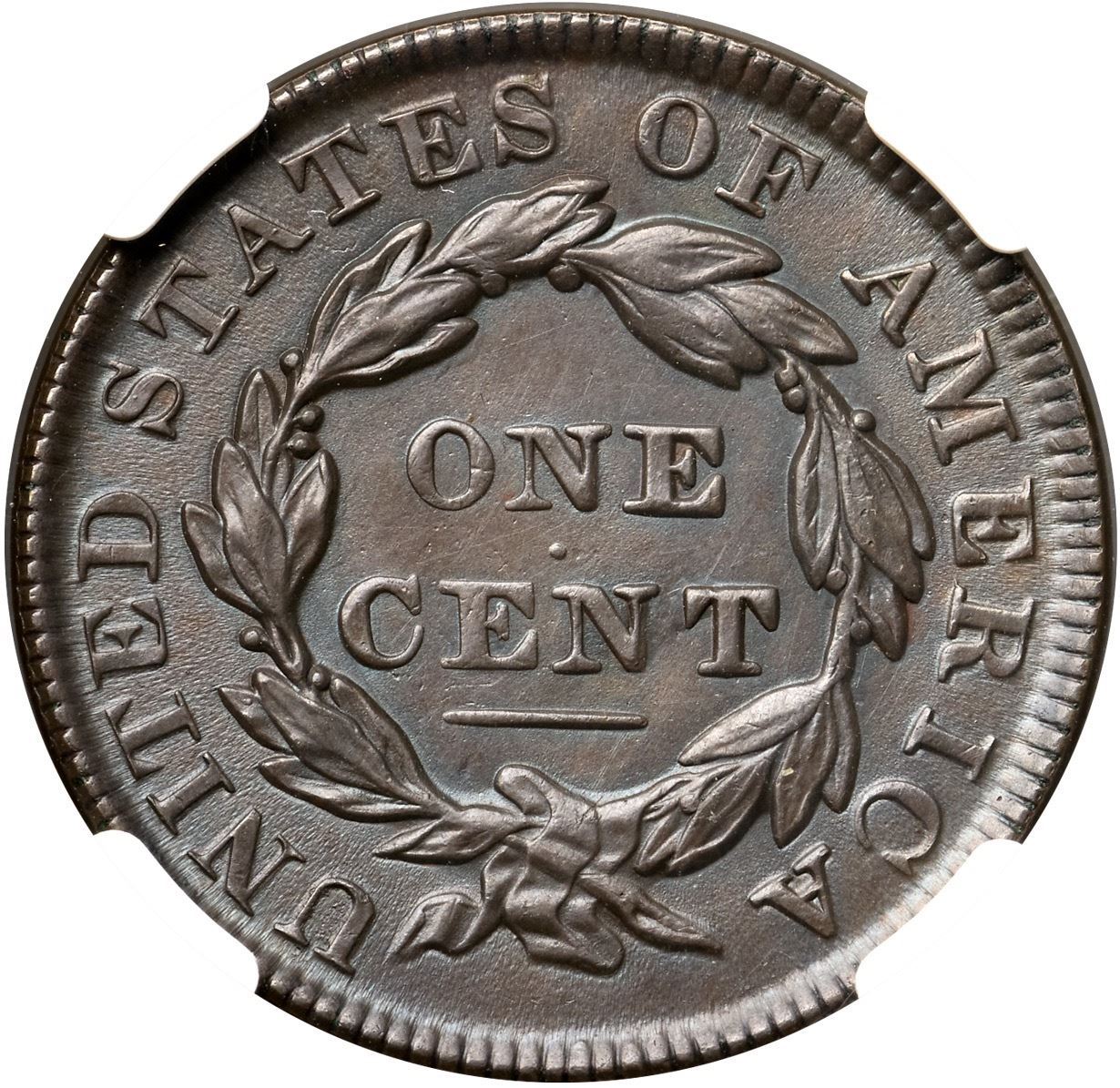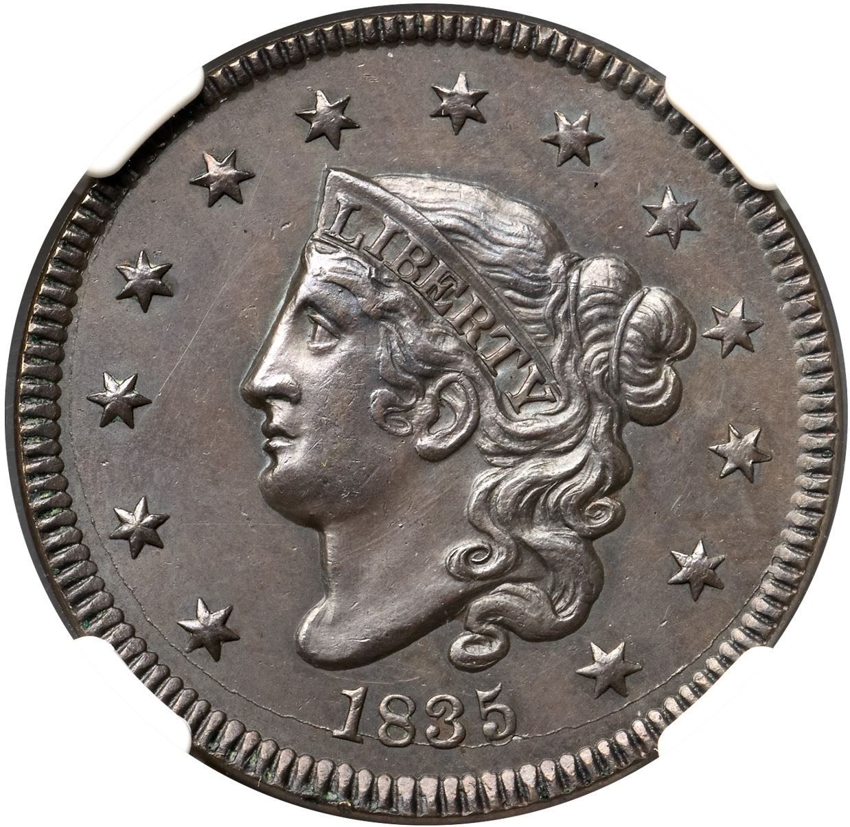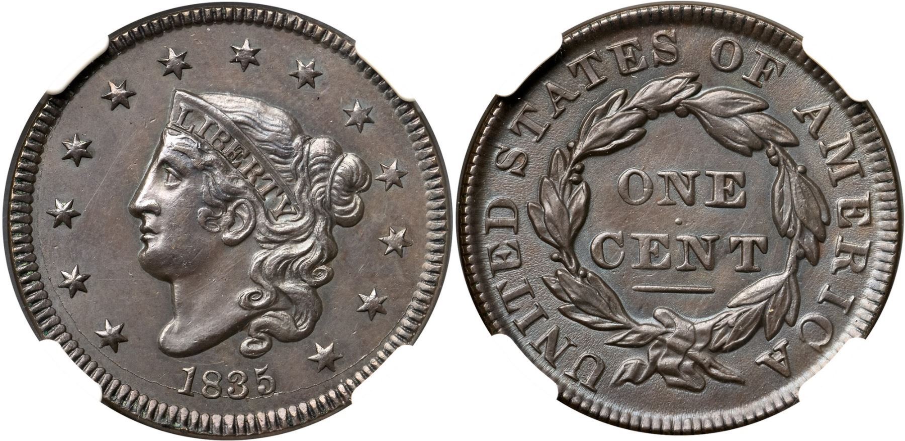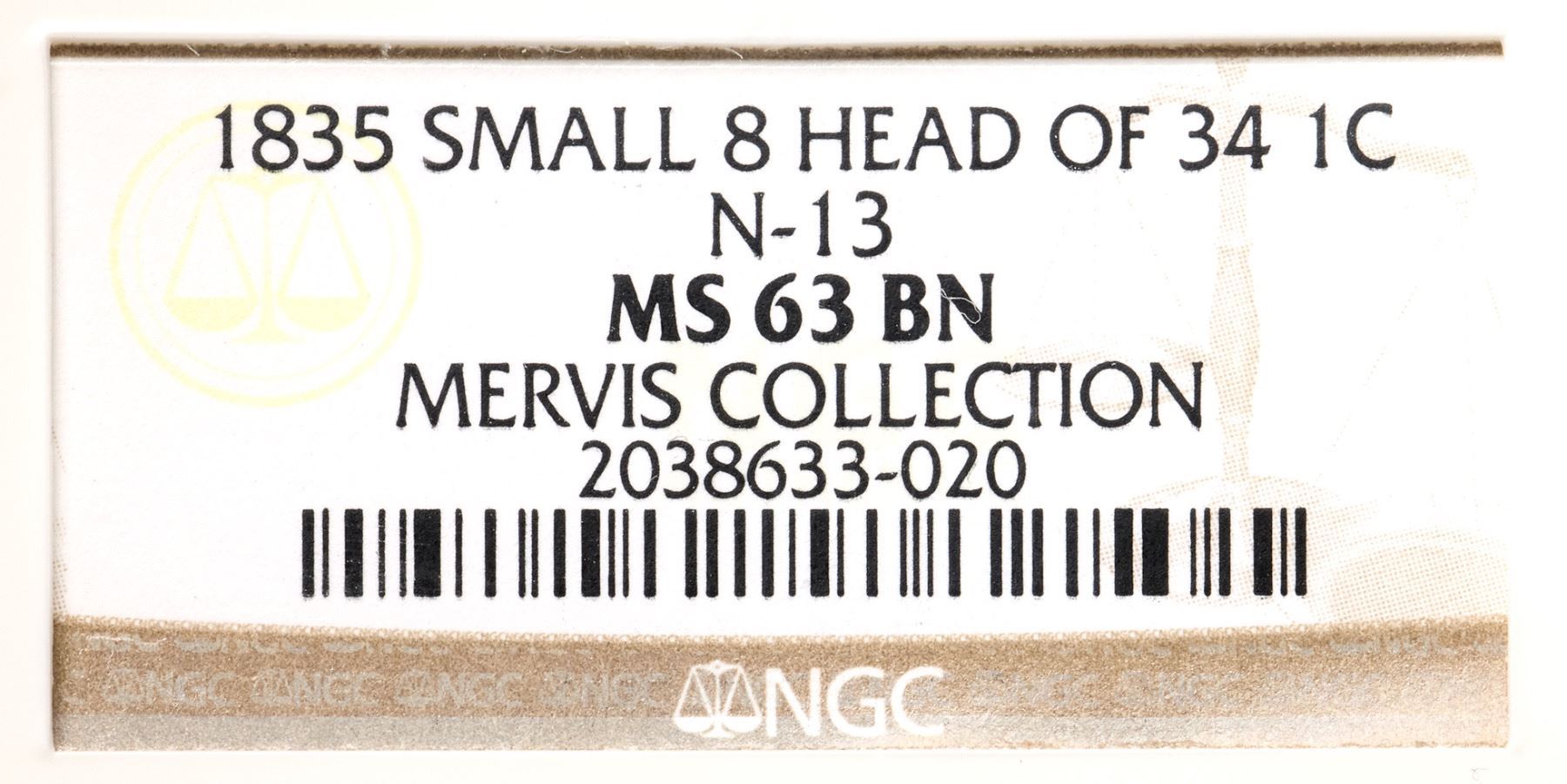 1835 N-13 R4 Head of 1834, Small 8 & Stars, NGC graded MS63 BrownGlossy chocolate brown with delicate overtones of bluish steel. The obverse fields are hard and reflective while the reverse fields are satiny from fine die flowlines. The sharpness is very close to mint state, but there are faint hairlines covering both sides (which only show in the obverse fields thanks to their smooth, prooflike finish). Otherwise this cent is virtually flawless. A good identifying mark is a tiny, barely visible lamination from a dentil up to the base of the 3 in the date. EDS, die state a. The small chip on the right bottom of the 5 in the date has not formed and the repunching under that numeral is sharp. Solidly in the condition census for this scarce variety, and the prooflike obverse die state is a definite plus. Called AU55 net EF45 and tied for CC#6 in the Noyes census, his photo #25744. Bland says EF45 and tied for CC#3 among the confirmed examples in his census. Our grade is EF45+, very close to AU50.Certificate Number: 2038633-020Pedigree: Ex Abe Kosoff-Robert Gildred, Kagin's GENA Sale 10/1983:1129-Wesley A. Rasmussen, Heritage Auctions 1/13/2005:3651-Daniel W. Holmes, Jr., McCawley & Grellman Auctions/Goldbergs 5/30/2010:434-Greg Hannigan-Adam Mervis, Heritage Auctions 1/10/2014:2189-Terry S. Denman Collection