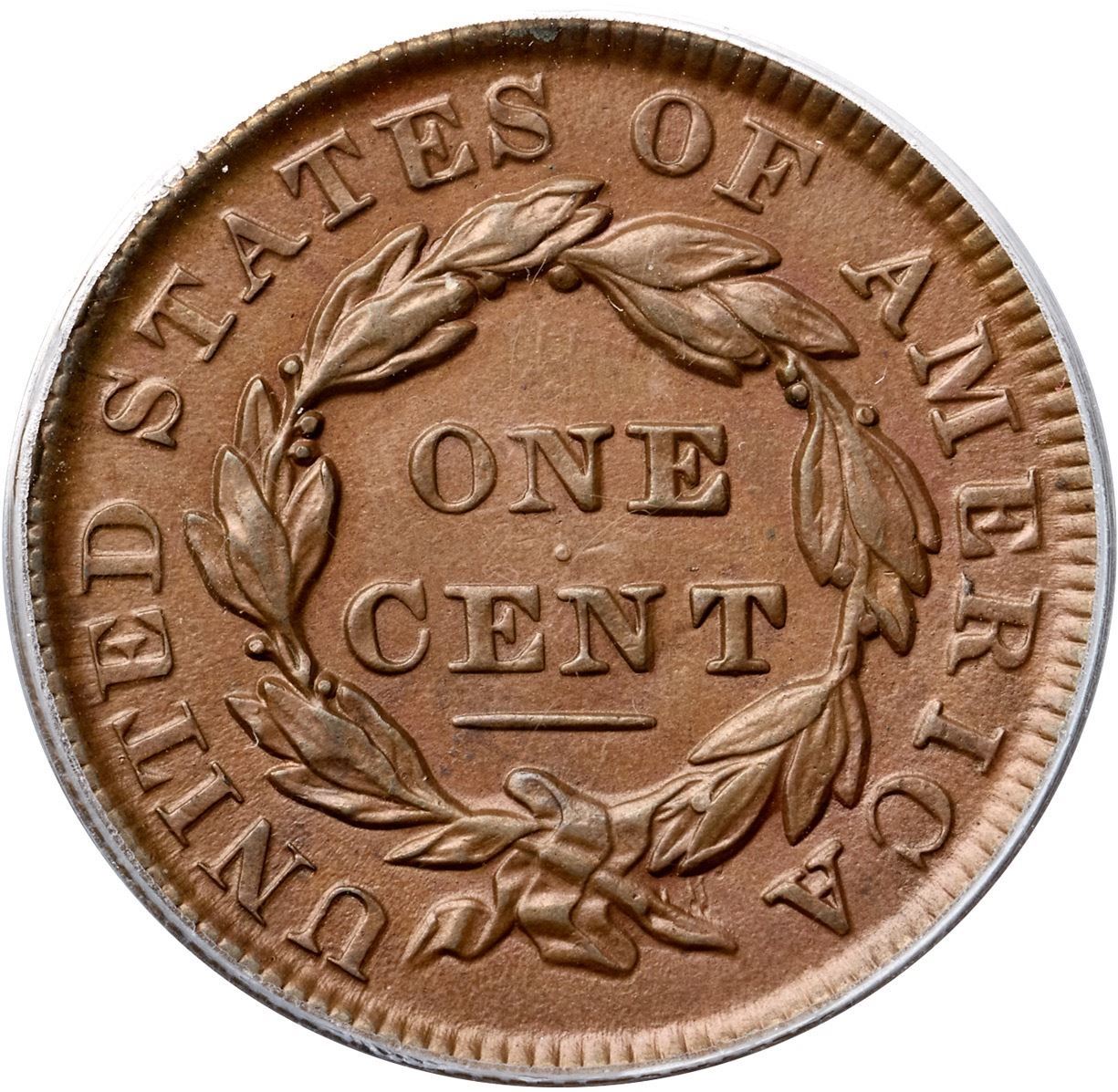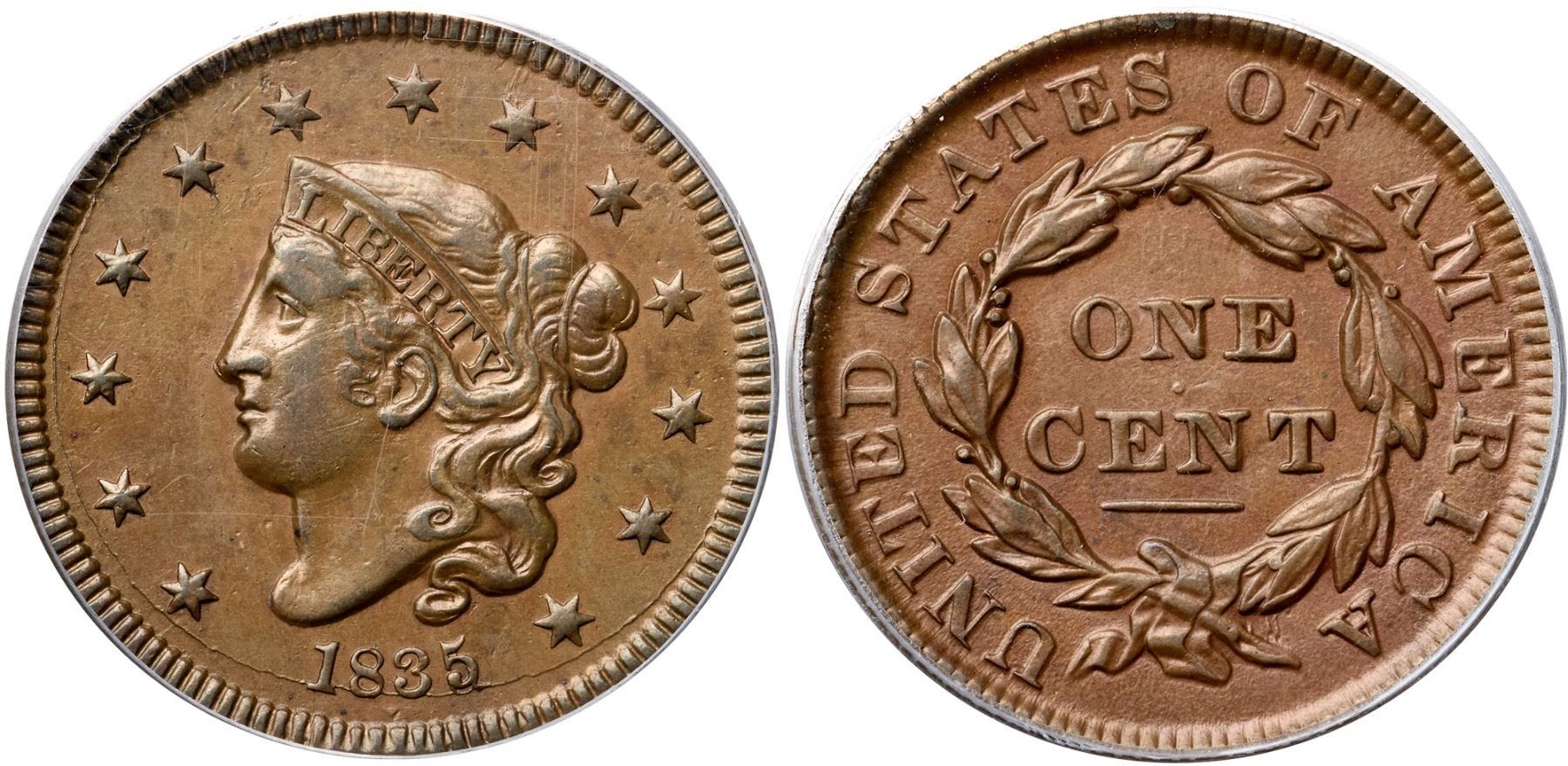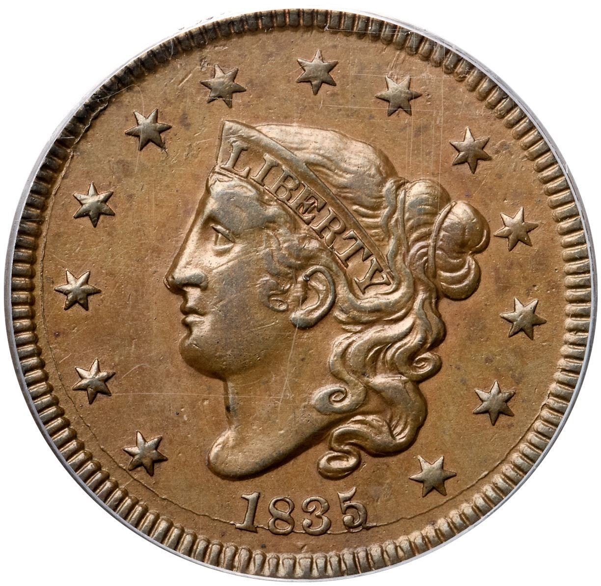 1835 N-13 R4 Head of 1834, Small 8 & Stars, PCGS graded AU58Glossy medium brown with slightly darker steel brown toning on the highpoints of the devices. Possibly lightly cleaned long ago but the toning and eye appeal of this cent is quite nice. The only notable marks are a few light contact marks on the cheek, a speck of dark toning on the front edge of the neck, and a tiny tick on the very tip of the nose. M-LDS, die state f, with clear rim cud breaks at D-S and ST, but the die crack at stars 4-6 has not formed. Called EF45 and tied for CC#6 in the Noyes census, his photo #21431. Bland says EF45 as well but tied for CC#3 in his list. Our grade is EF40.Certificate Number: 37099.58/13086965Pedigree: Ex William Sleicher, S. H. Chapman 10/9/1919:1102-Hillyer Ryder, Wayte Raymond 2/18/1947:115-Willard C. Blaisdell (via Del Bland) 9/1976-R. E. "Ted" Naftzger, Jr.-Naftzger Estate, McCawley & Grellman Auctions/Goldbergs 2/1/2009:337-Chris McCawley 2014-Terry S. Denman Collection