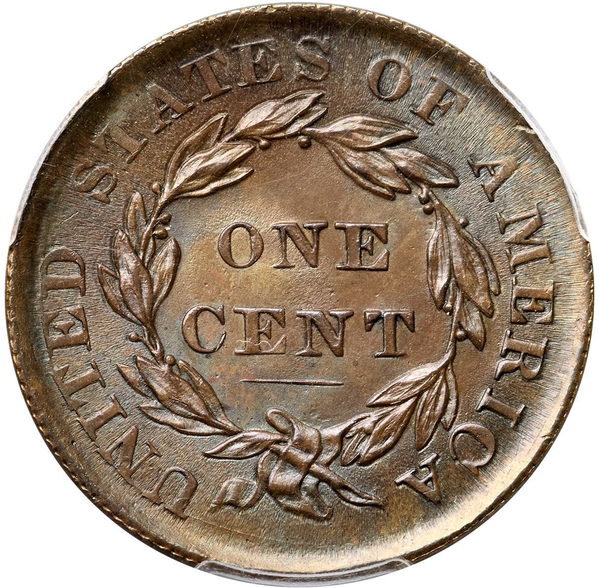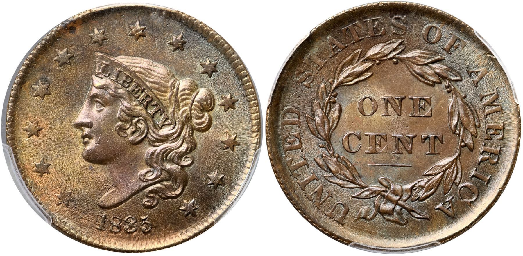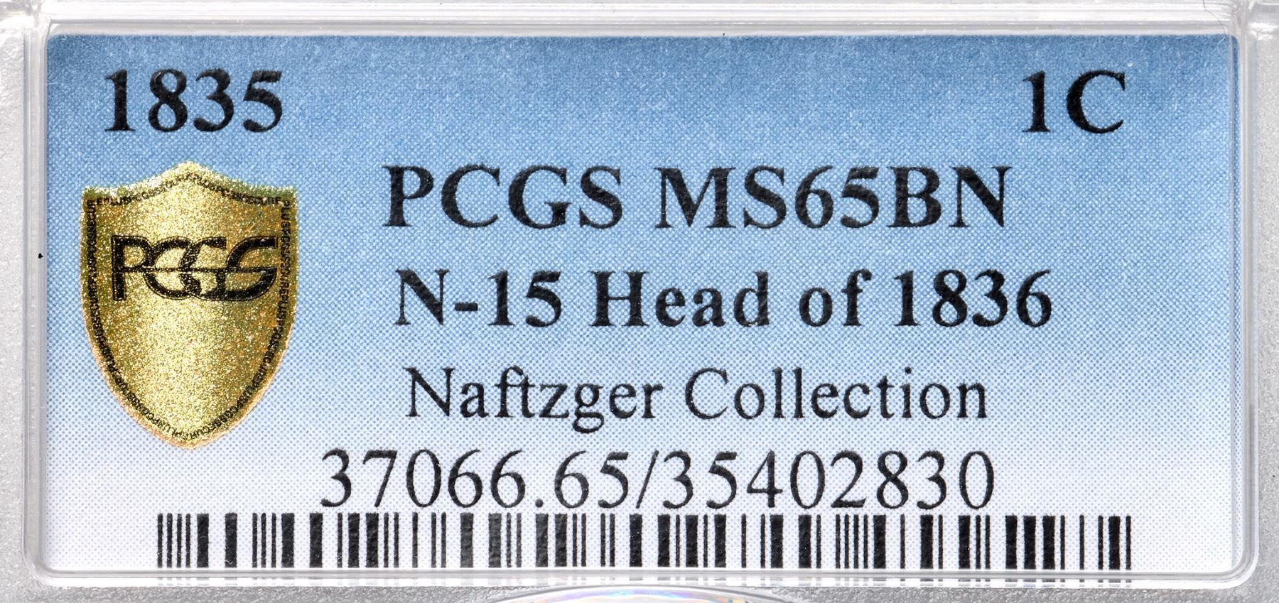 1835 N-15 R2 Head of 1836, PCGS graded MS65 BrownLustrous light olive with underlying golden tan and bluish steel overtones. A spot of dark toning at the dentils left of star 6 is the only notable mark. The surfaces are highly lustrous thanks to die flowlines and the eye appeal of this cent is quite nice. LDS, die state c. The peripheral details are weakened, most of the dentils are gone, and there is subtle swelling at ON and CEN. Called MS60 net AU55 and tied for CC#8 in the Noyes census, his photo #21204. Our grade is MS60.Certificate Number: 37066.65/35402830Pedigree: Ex F. C. C. Boyd, New Netherlands Coin Co. #50, 12/7/1957:1569 (as MS60)-Emanuel Taylor 10/1960-R. E. "Ted" Naftzger, Jr.-Naftzger Estate, McCawley & Grellman Auctions/Goldbergs 2/1/2009:342-Chris McCawley 2011-Gene Gardner, Heritage Auctions 10/2015:98012-Terry S. Denman Collection