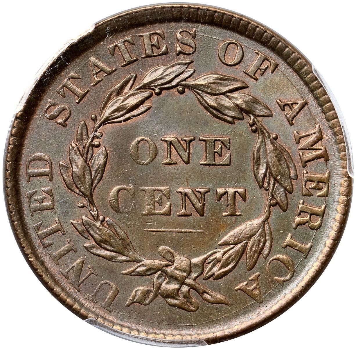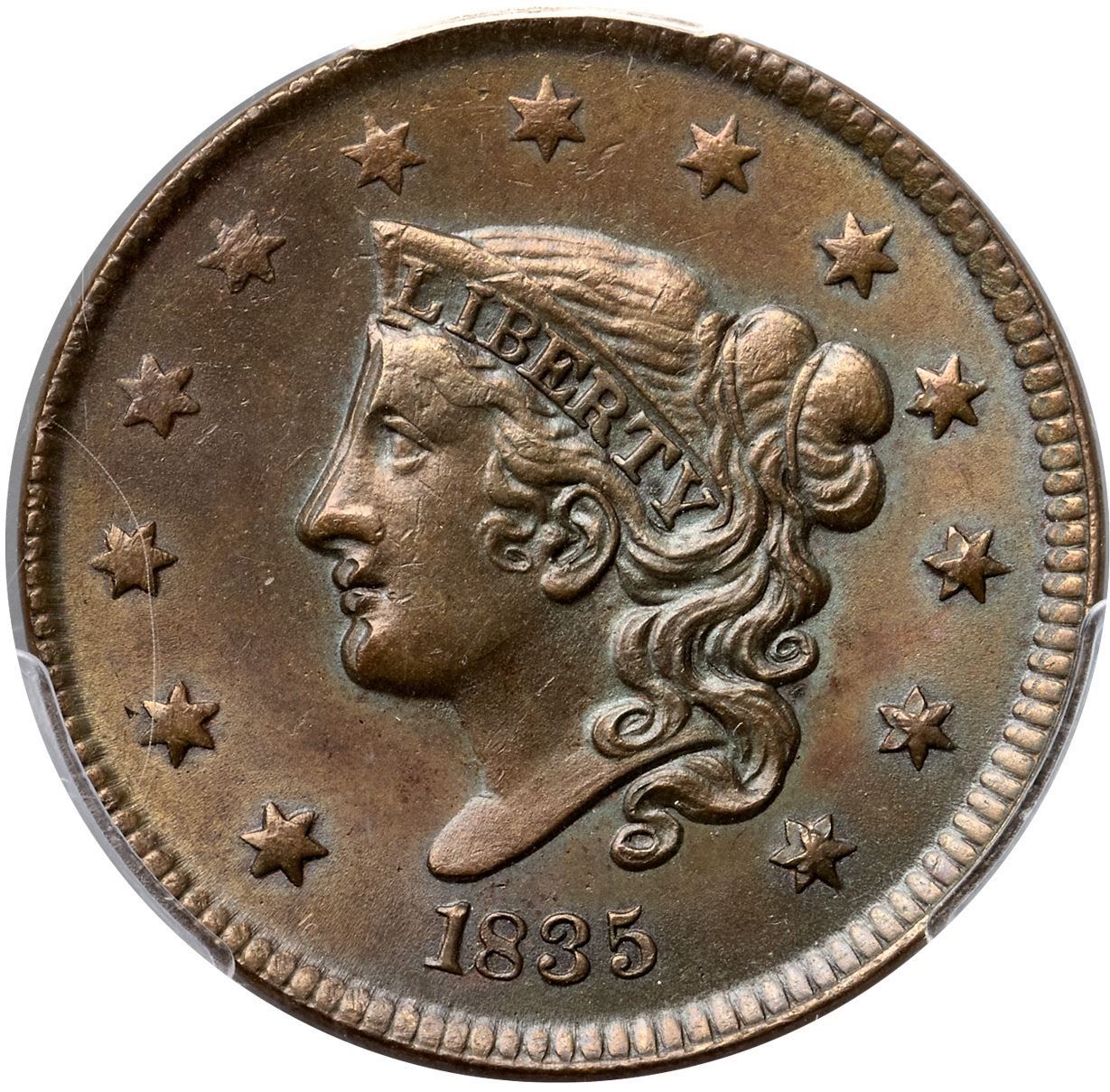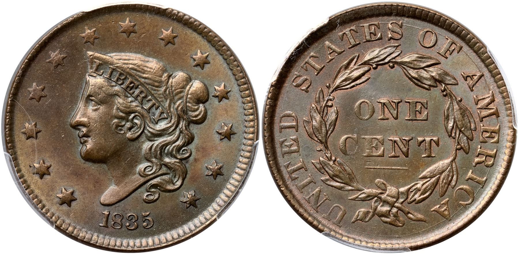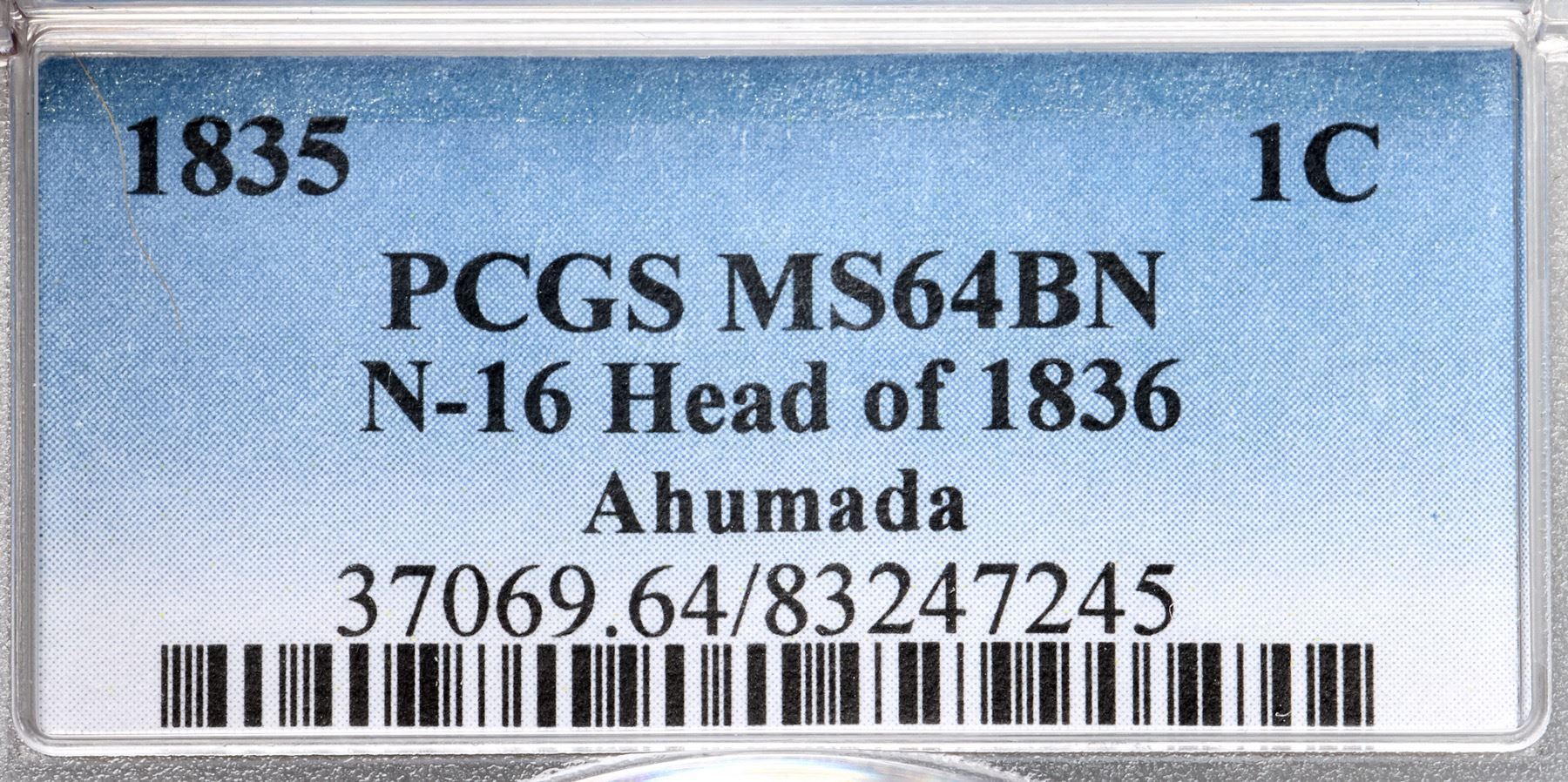 1835 N-16 R2 Head of 1836, PCGS graded MS64 BrownLustrous light olive and bluish steel with traces of very faded mint red in protected areas on the reverse. Essentially flawless except for a slightly weak strike on the upper part of the obverse and two small ticks on the coronet over LI. E-MDS. The fields are covered with fine die flowlines, the dentils on the obverse are clear, and the die crack on the reverse is clear. There is an obvious double profile from the forehead down to the chin with similar doubling on stars 10-13. Graded MS63 Choice and tied for CC#1 honors with one other piece in the Noyes census, his photo #35162. Our grade is MS62.Certificate Number: 37069.64/83247245Pedigree: Ex Stack's 9/5/1990:23-Anthony J. Terranova-Dennis Mendelson, Superior 2/3/1991:885-Douglas F. Bird, Superior 6/1992:584-Ludwig T. Smith, McCawley & Grellman Auctions 1/7/1995:530-Manuel Ahumada Collection, McCawley & Grellman Auctions/Goldbergs 6/4/2017:151-Terry S. Denman Collection