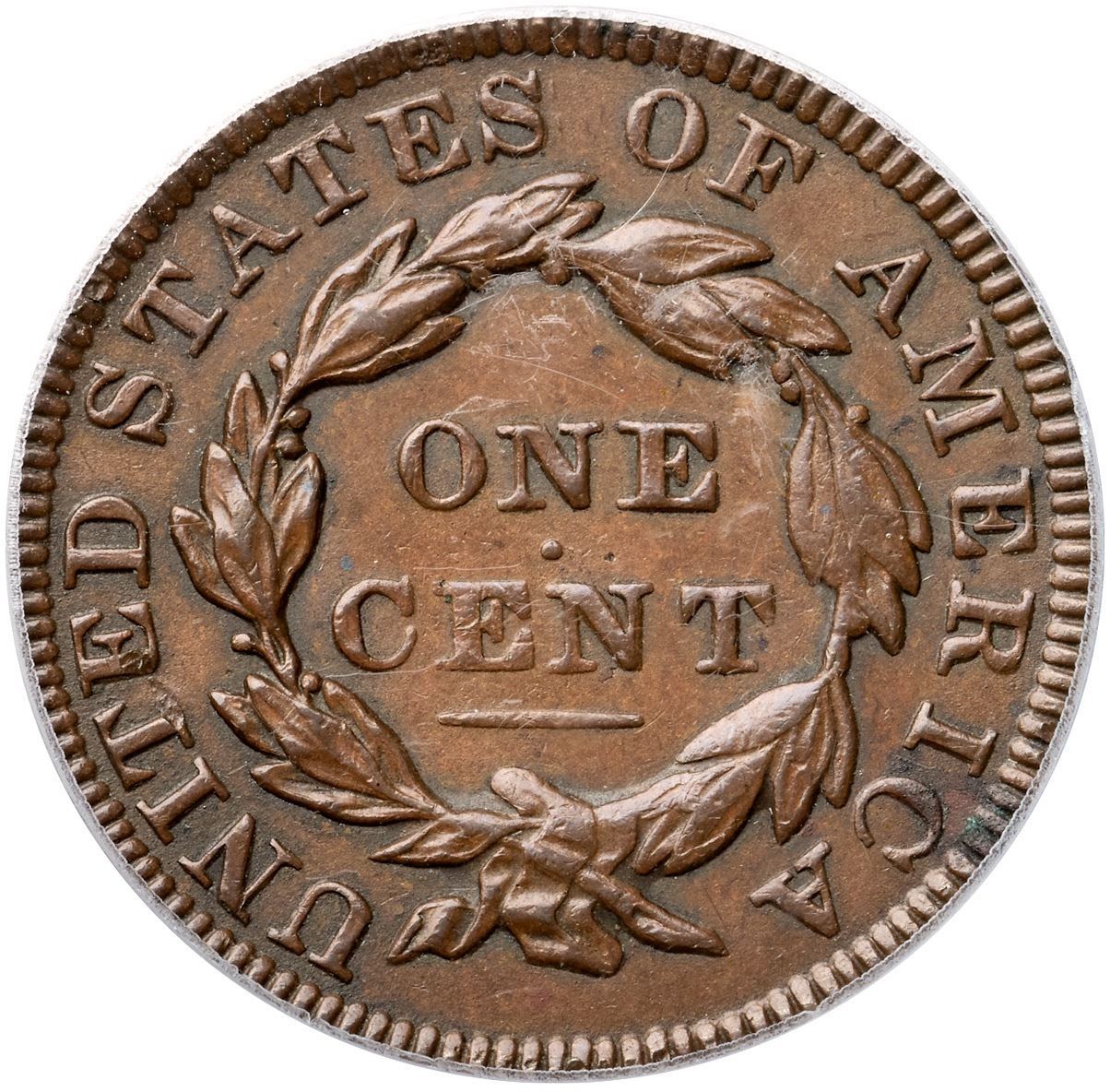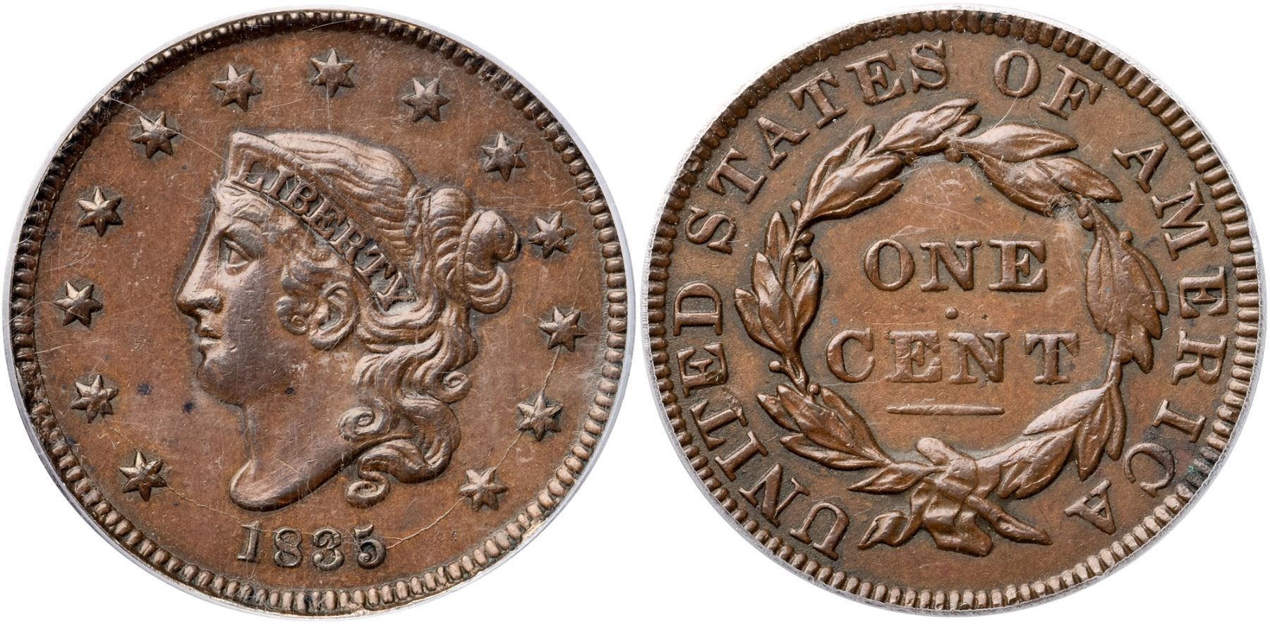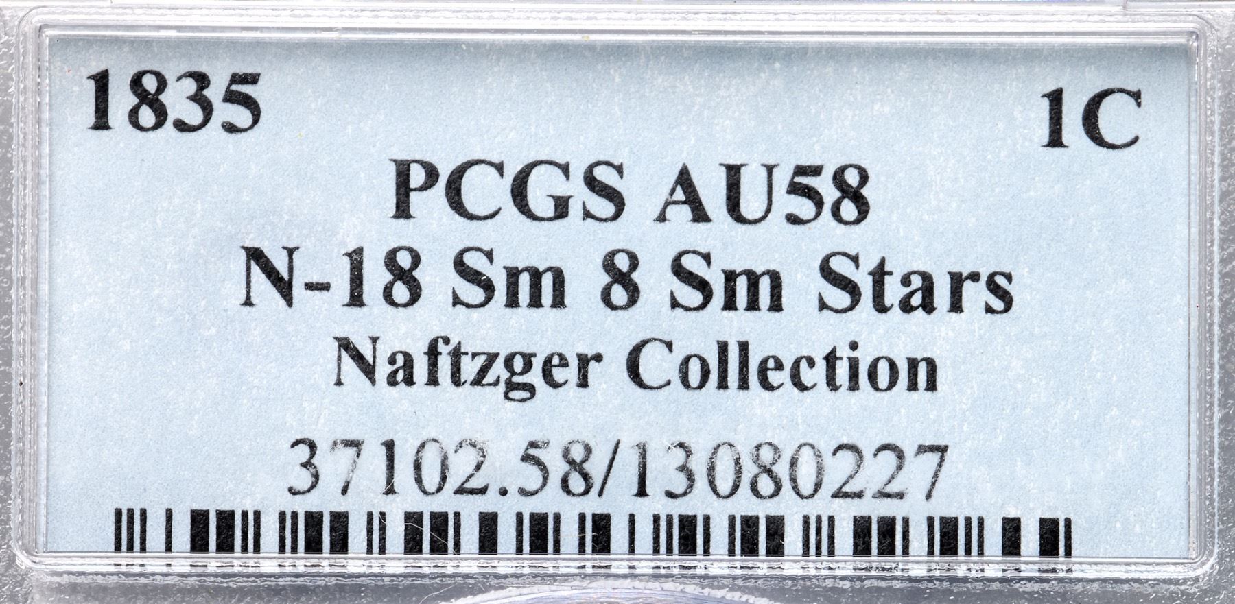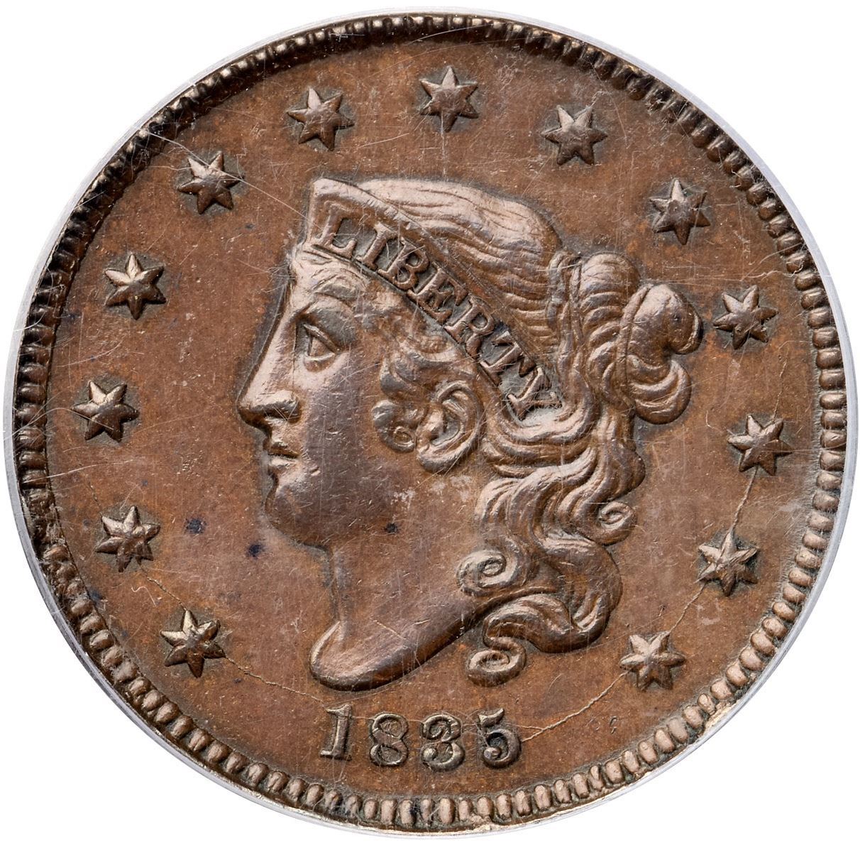 1835 N-18 R4+ Head of 1834, Small 8 & Stars, PCGS graded AU58Glossy medium brown and light chocolate with steel brown toning on the highpoints and medium chocolate in the protected areas. The surfaces are smooth and the eye appeal of this cent is excellent. The notable marks are a tiny scratch from the dentils under star 3, two small spots of darker toning in the field off the chin, a nick on the bases of TE in UNITED, and a couple specks of verdigris at IC in AMERICA. MDS, die state b, with a tiny crumble in the dentils below the 35. The reverse is rotated 35 degrees CW. Called AU50 net VF35 and CC#1 by 10 points in the Noyes census, his photo #32002. Our grade is EF40. (The holder is scuffed.)Certificate Number: 37102.58/13080227Pedigree: Ex Larry Briggs-Anthony J. Terranova 2/1993-R. E. "Ted" Naftzger, Jr.-Naftzger Estate, McCawley & Grellman Auctions/Goldbergs 2/1/2009:345-Chris McCawley-Terry S. Denman Collection