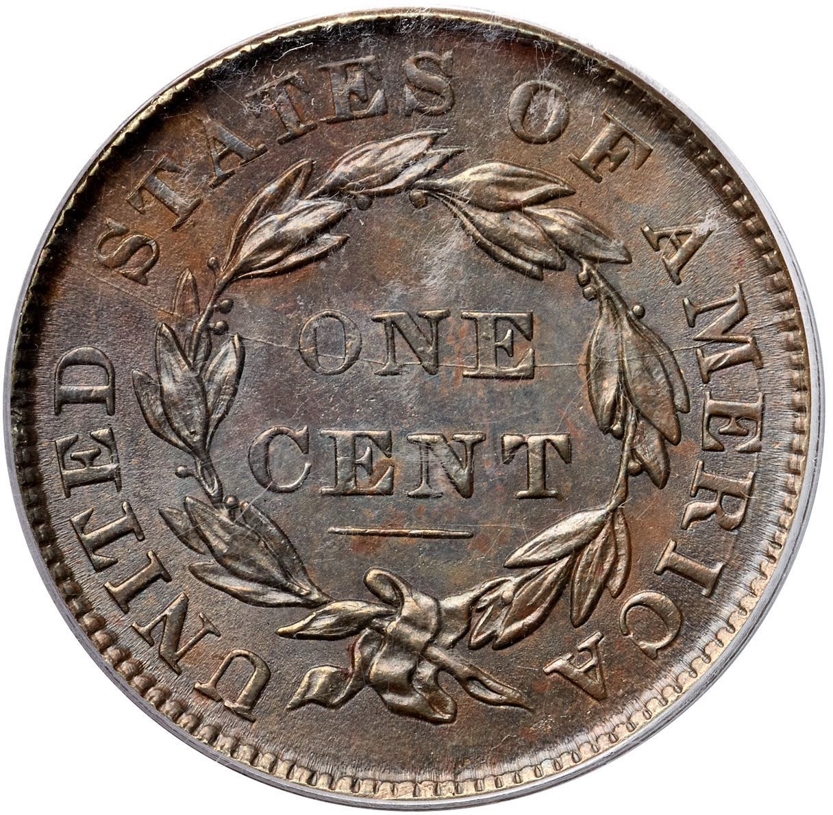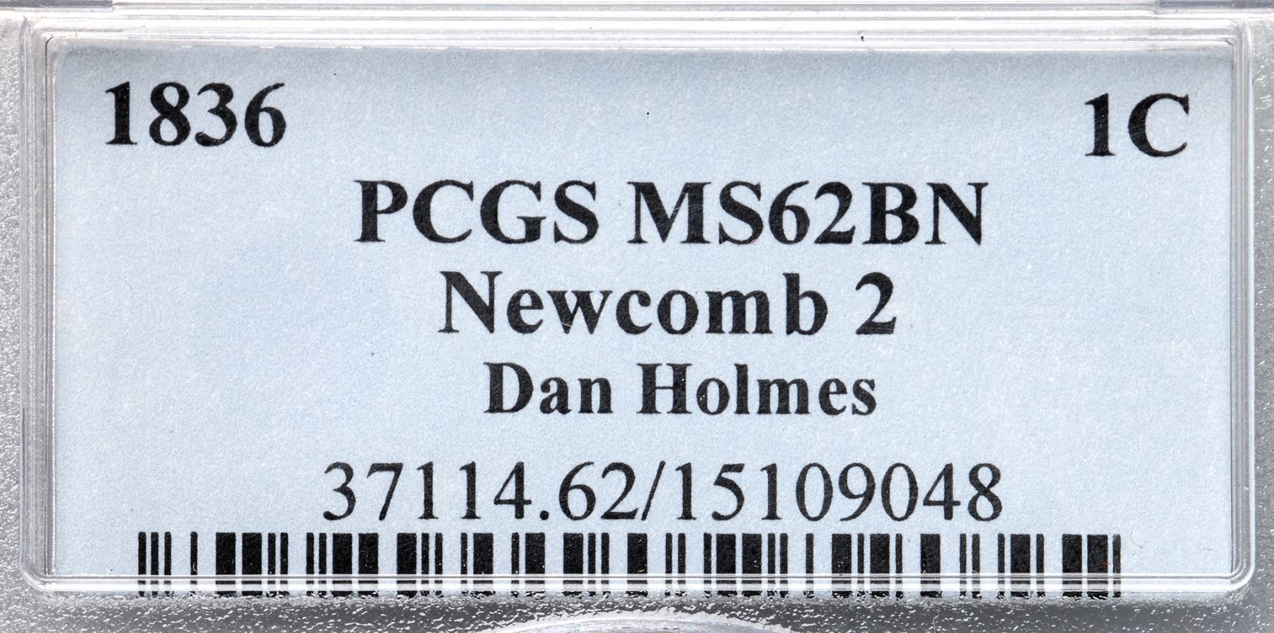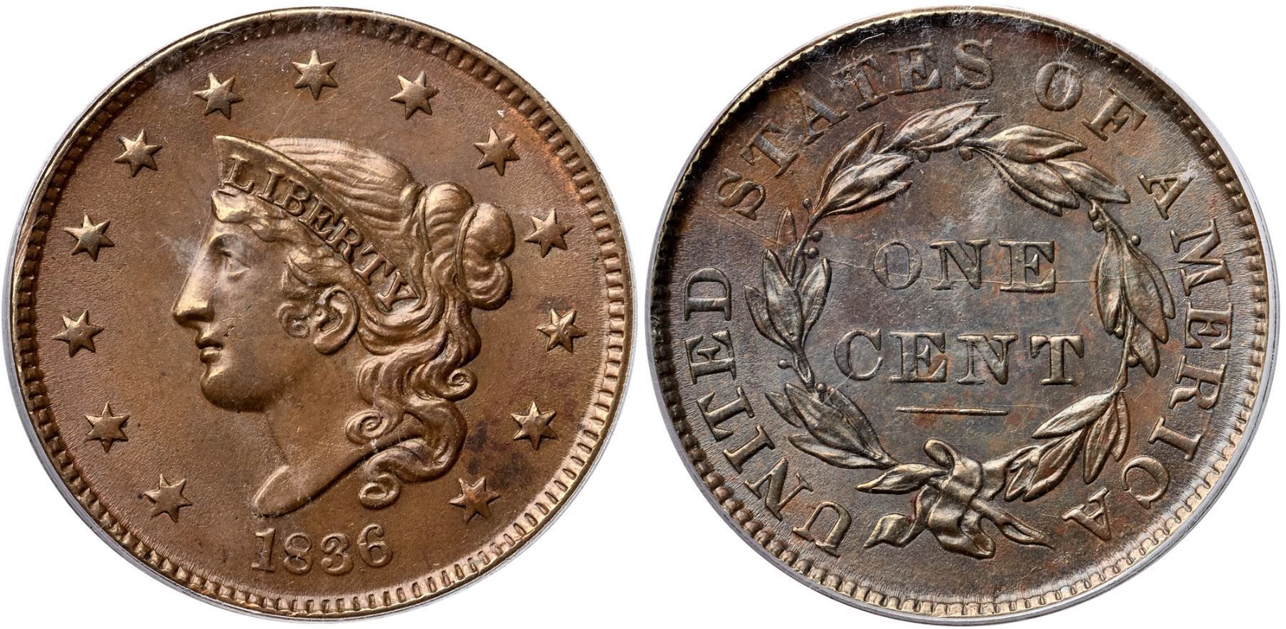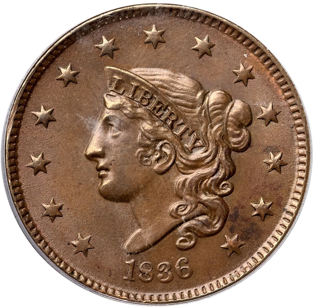 1836 N-2 R2 PCGS graded MS62 BrownThe obverse is frosty medium brown with hints of faded mint color in a few protected areas plus a puff of darker olive brown toning between stars 12 & 13. The reverse is a slightly darker frosty bluish steel brown mixed with some medium brown tones, especially at the top. A couple microscopic planchet chips right of the upper lip are the only notable defects. LDS, die state e, with all the reverse die cracks clear, including the final one down from the dentils through the left side of the second S in STATES. This is the Wright plate coin for the variety. Called MS60 and tied for CC#3 in the Noyes census, his photo #22022. Bland also says MS60 but tied for CC#9 in his list. Our grade is MS60.Certificate Number: 37114.62/15109048Pedigree: Ex Larry Whitlow (Beverly Hills Coin Co.) 1970-R. S. "Robbie" Brown, Jr., Superior 9/30/1986:808-Dennis Mendelson, Superior 2/3/91:505-R. S. "Robbie" Brown, Jr., Superior 1/27/1996:619-Ron E. Adam, McCawley & Grellman Auctions/Superior 9/5/2004:945-Evan L. Kopald (via Chris McCawley) 5/2006-Daniel W. Holmes, Jr., McCawley & Grellman Auctions/Goldbergs 5/30/2010:448-Terry S. Denman Collection
