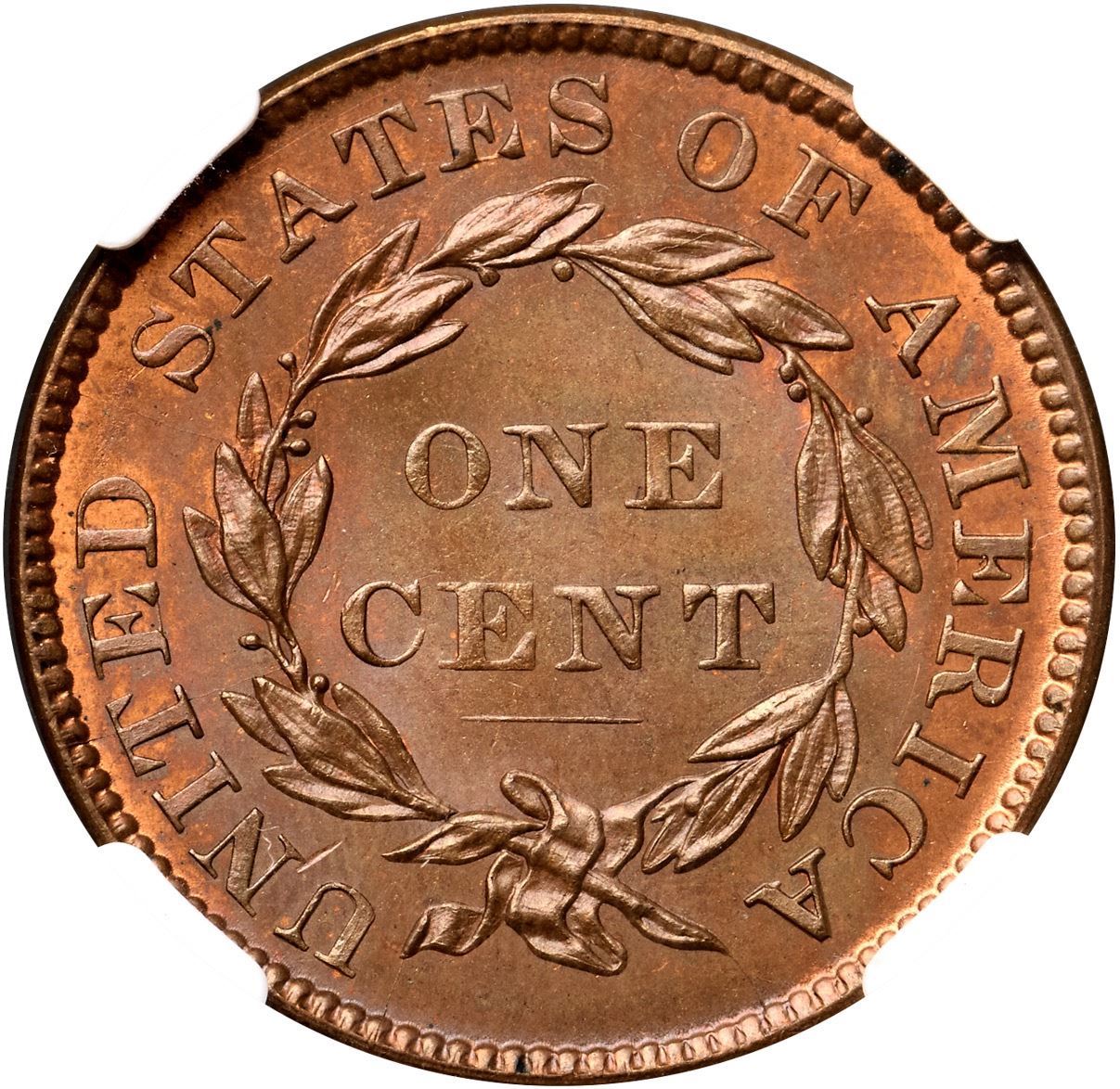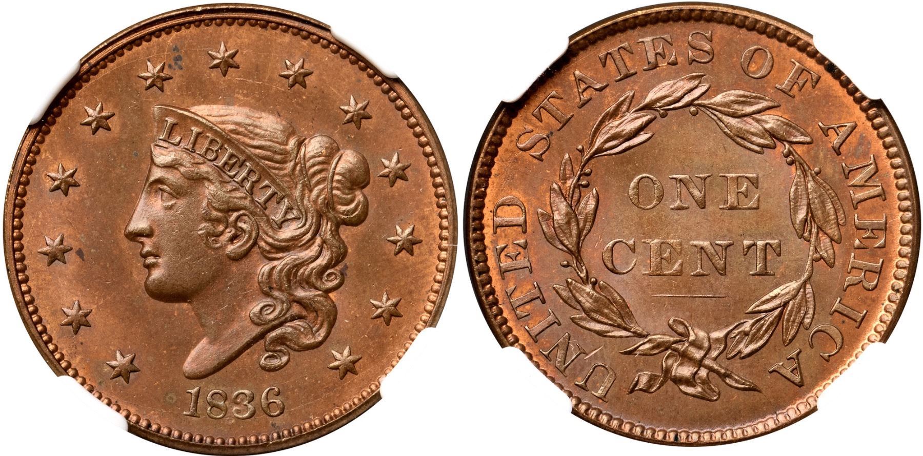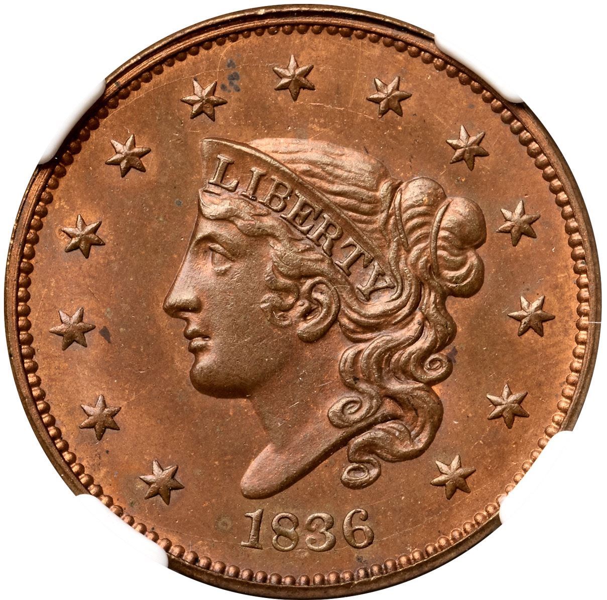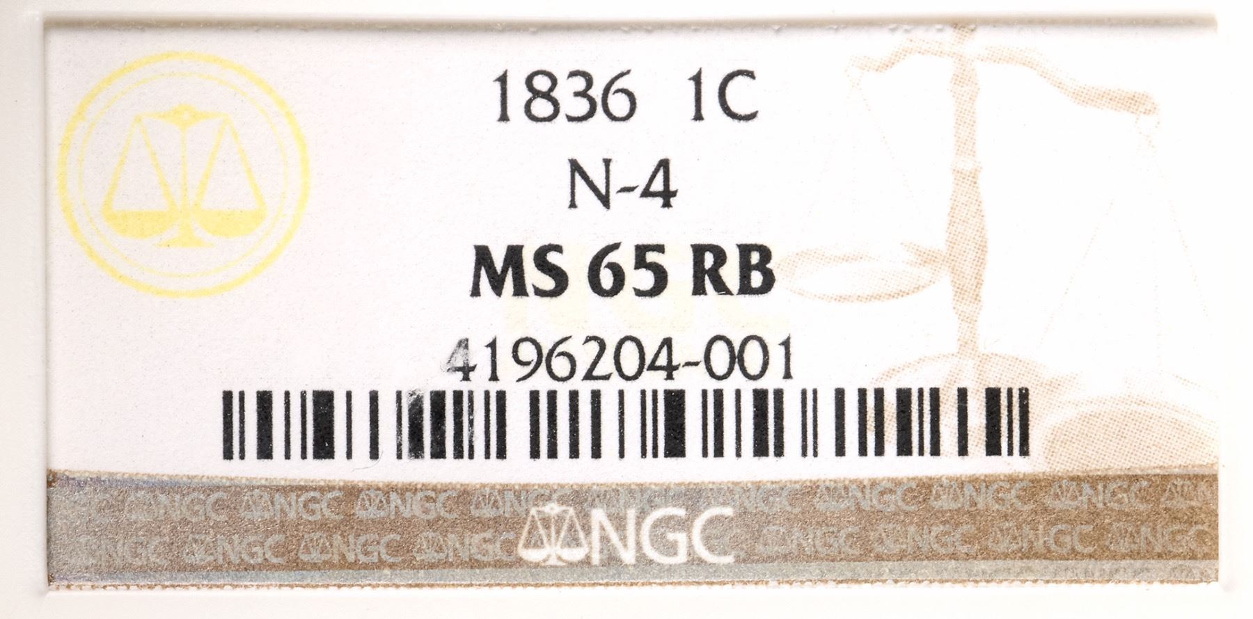 1836 N-4 R3 NGC graded MS65 Red & BrownLustrous light brown and steel with very subtle overtones of light bluish steel. Lighter reddish tan faded down from mint color shows in protected areas, particularly on the reverse. Satiny mint frost covers this cent and the eye appeal is outstanding. Sharply struck with trivial marks including a couple small spots of darker olive brown toning (not carbon) right of star 6, another under the 6, and one right of star 3. Faint traces of an old fingerprint show at stars 11-12. E-MDS, die state b early, with very fine die cracks on both sides. The dentils are sharp and the narrow rim cud from star 1 to star 2 has not formed. Graded MS63 and finest in the Noyes census ahead of the ANS Coin, his photo #30029. Del Bland says MS65 and finest known. Our grade is MS63+. This cent comes with an amazing provenance that has been traced back more than a century.Certificate Number: 4196204-001Pedigree: Ex Peter Mougey, Esq., Thomas L. Elder 9/1/1910:193-Dr. Henry W. Beckwith, S. H. Chapman, 4/27/1923:85-William Festus Morgan, J. C. Morgenthau & Co., 6/16/1932:277-T. James Clarke, B. Max Mehl 6/12/1945:1823-Milton A. Holmes, Stack's 10/5/1960:1572-Richard Picker-Norweb Family Collection, Bowers & Merena 11/14/1988:2925-J. R. Frankenfield, McCawley & Grellman Auctions/Superior 2/17/2001:1118-W. M. "Jack" Wadlington (The Twin Leaf Collection), Stack's Bowers 7/16/2015:2272-Terry S. Denman Collection