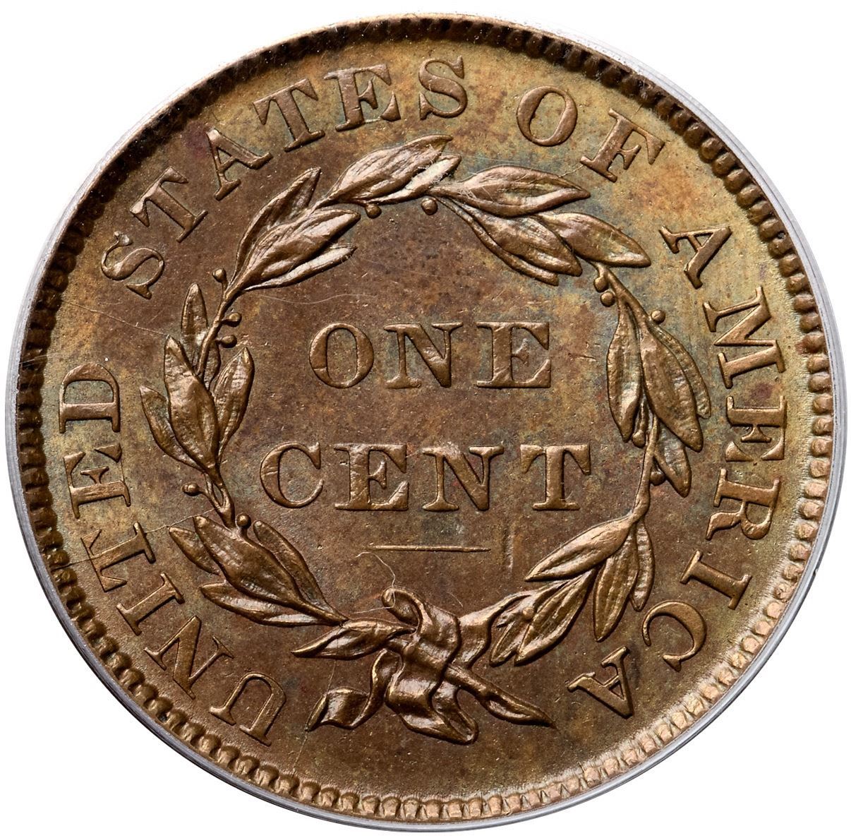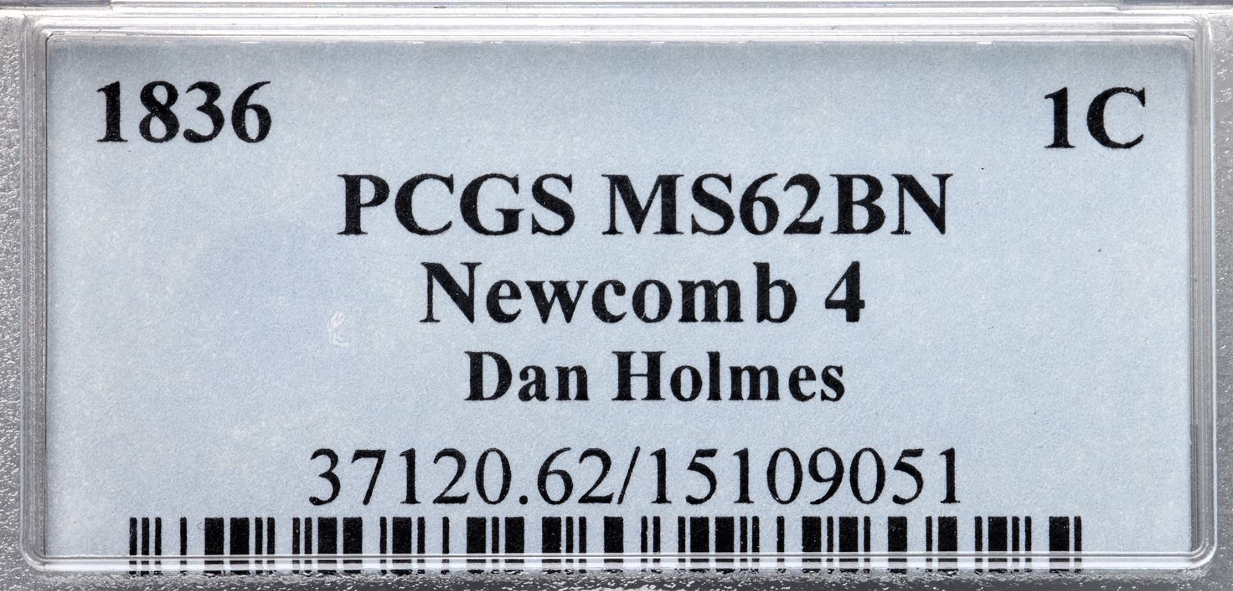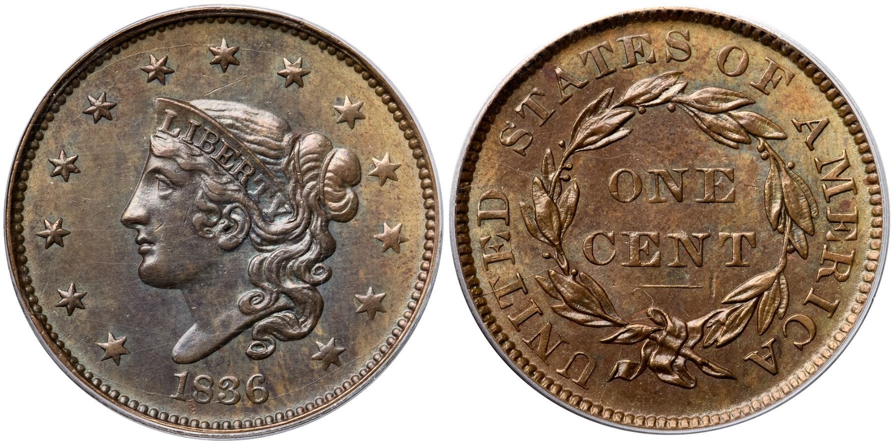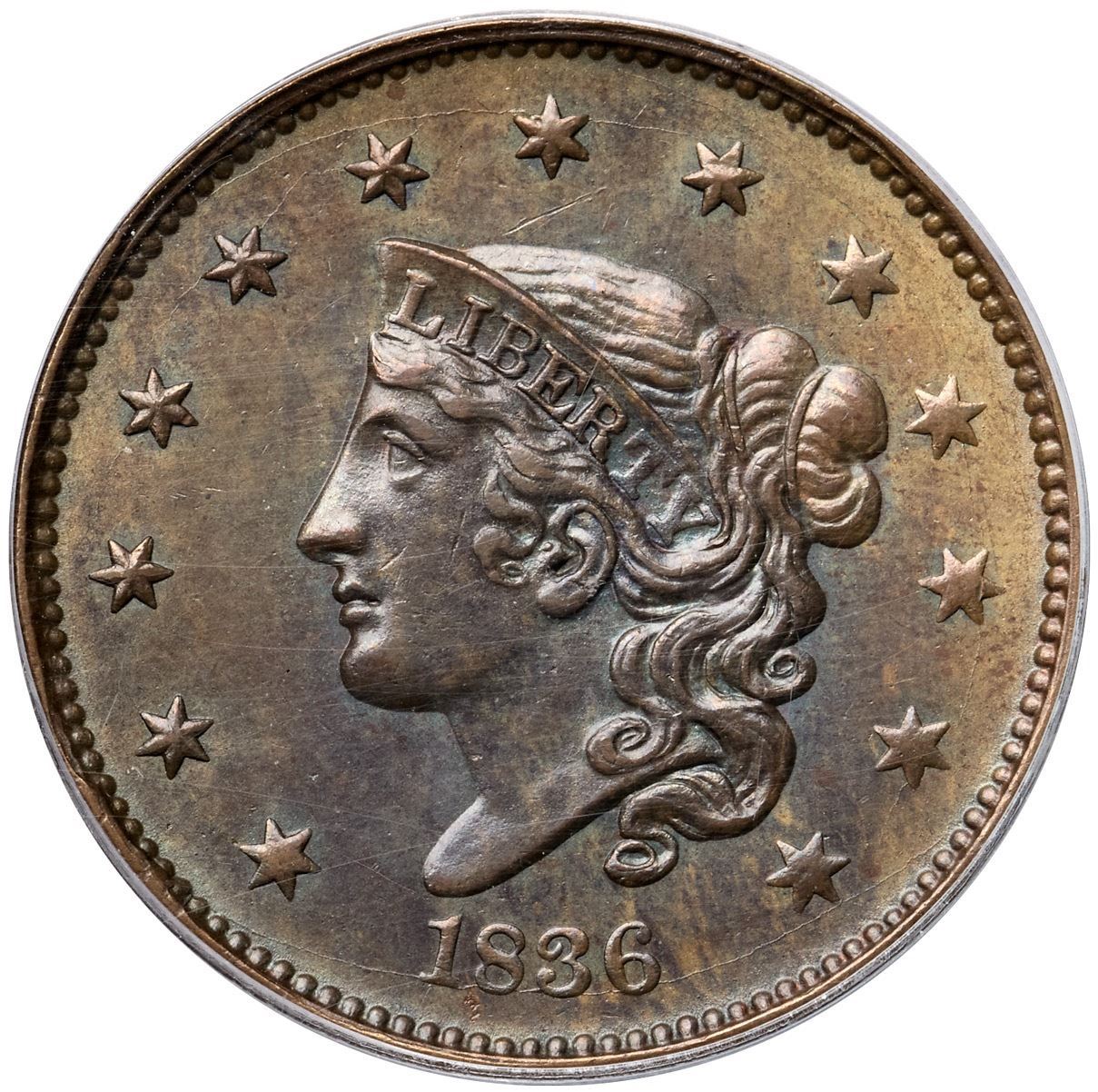 1836 N-4 R3 PCGS graded MS62 BrownGlossy light olive brown with overtones of bluish steel, especially on the obverse, and frosty golden light brown and tan in protected areas. A fine hairline scratch under star 7 and a vertical nick-like planchet void at the right end of the line under CENT are the only notable marks. Just a touch of very light friction on the highpoints from mint state. M-LDS, die state c, with 5 very fine radial die cracks on the reverse, several fine die cracks on the obverse, and a narrow rim cud break between stars 1 & 2. Called MS60 and tied for CC#3 in the Bland census. Noyes says AU55 and tied for CC#7, his photo #30129. Our grade is AU58.Certificate Number: 37120.62/15109051Pedigree: Ex Julian Leidman 4/1978-Del Bland-R. S. "Robbie" Brown, Jr., Superior 9/30/1986:811-J. R. Frankenfield, McCawley & Grellman Auctions/Superior 2/17/2001:1119-Daniel W. Holmes, Jr., McCawley & Grellman Auctions/Goldbergs 5/30/2010:452-Terry S. Denman Collection