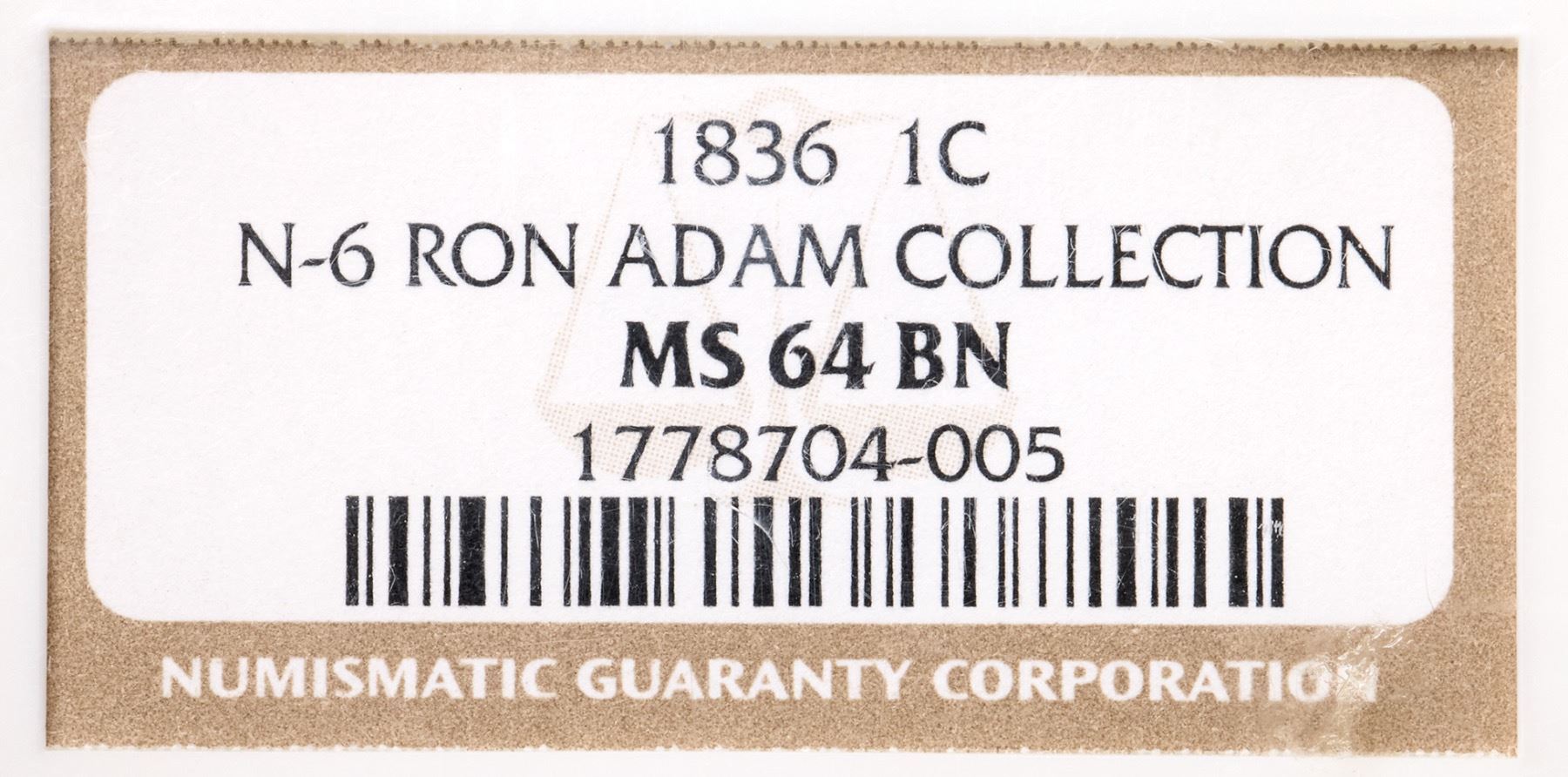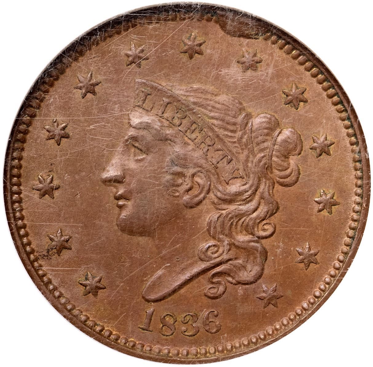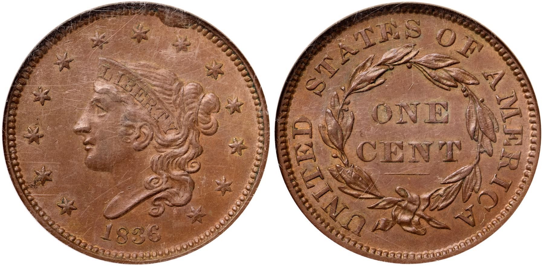 1836 N-6 R2 Gobrecht Head, NGC graded MS64 BrownFrosty tan and light brown with traces of very faded mint red on the left side of the reverse. Sharply struck with satiny luster in the fields and protected areas. Just a few trivial marks including a small nick over star 5 and a few more very well hidden in the wreath below the I in UNITED/ LDS, die state h, with a strong cud break over star 8 and several fine die cracks on the reverse. Our grade is AU58.Certificate Number: 1778704-005Pedigree: Ex Ron E. Adam, McCawley & Grellman Auctions/Superior 9/5/2004:951-Chris McCawley 4/2012-Terry S. Denman Collection