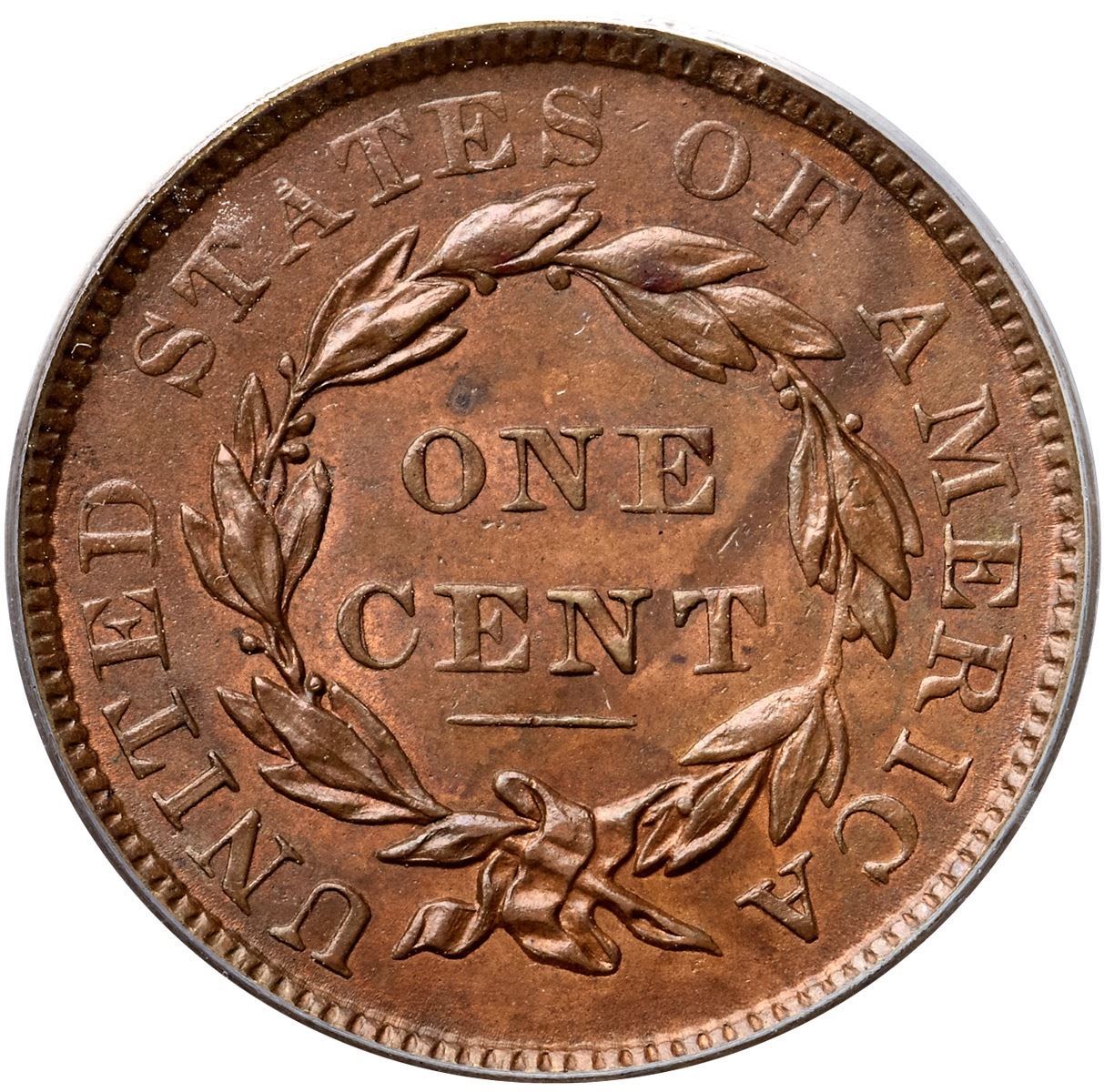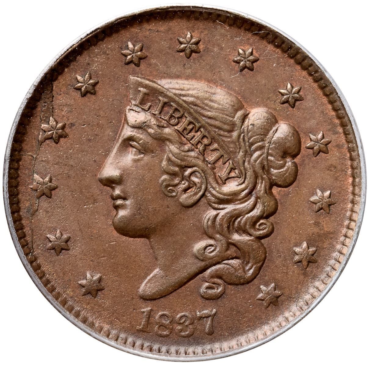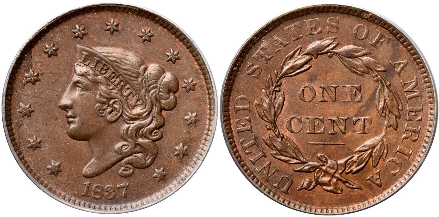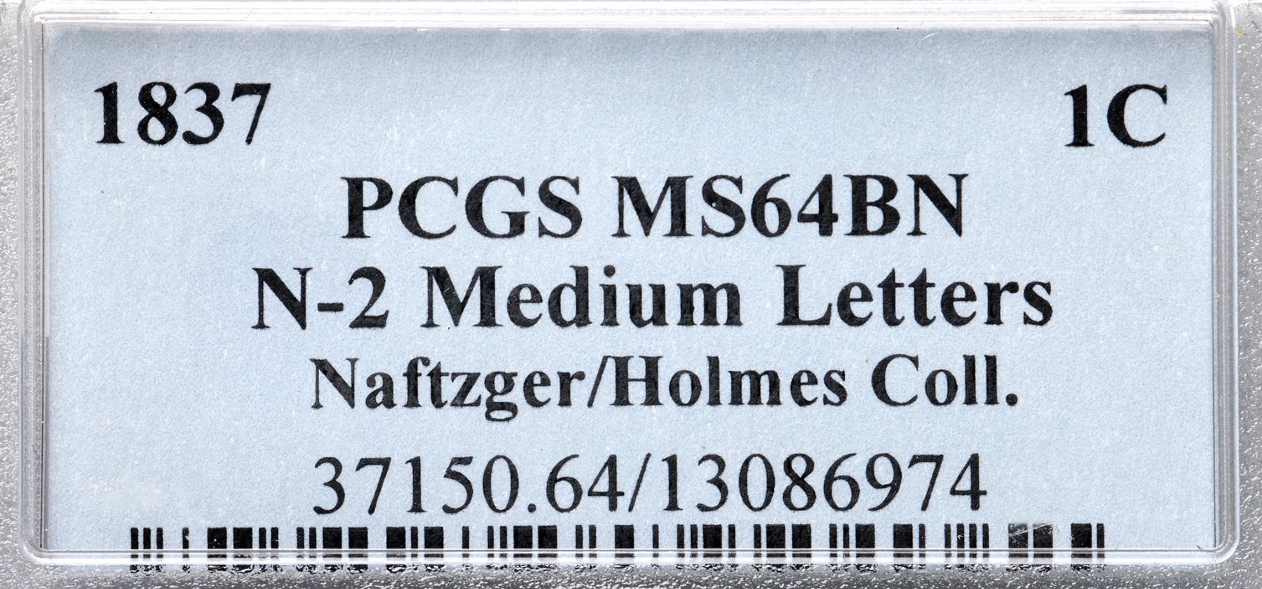 1837 N-2 R2 Plain Hair Cord, Medium Letters, PCGS graded MS64 BrownGlossy steel and light chocolate with faded mint color showing on both sides, especially on the reverse. A spot of darker toning over the O in ONE and an arc of similar toning from right of the F in OF down to the N in CENT are the only marks visible without a glass. Frosty mint luster shows in the fields and protected areas on both sides, and this cent has very nice eye appeal. M-LDS, die state e. There is a clearly raised retained cud up from star 4 to the rim left of star 5, and another raised retained cud has developed down from the left side of star 3. Called MS60+ and tied for CC#1 in the Bland census. Noyes says MS60 net AU55 and tied for CC#3, his photo #21918. Our grade is AU58. Certificate Number: 37150.64/13086974Pedigree: Ex John Borhek 1974-William C. Noyes 10/1982-R. E. "Ted" Naftzger, Jr.-Naftzger Estate, McCawley & Grellman Auctions/Goldbergs 2/1/2009:361-Daniel W. Holmes, Jr., McCawley & Grellman Auctions/Goldbergs 5/30/2010:462-Terry S. Denman Collection