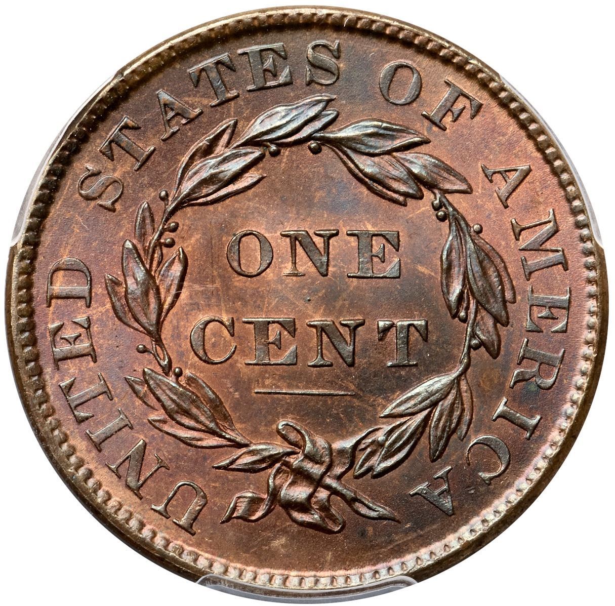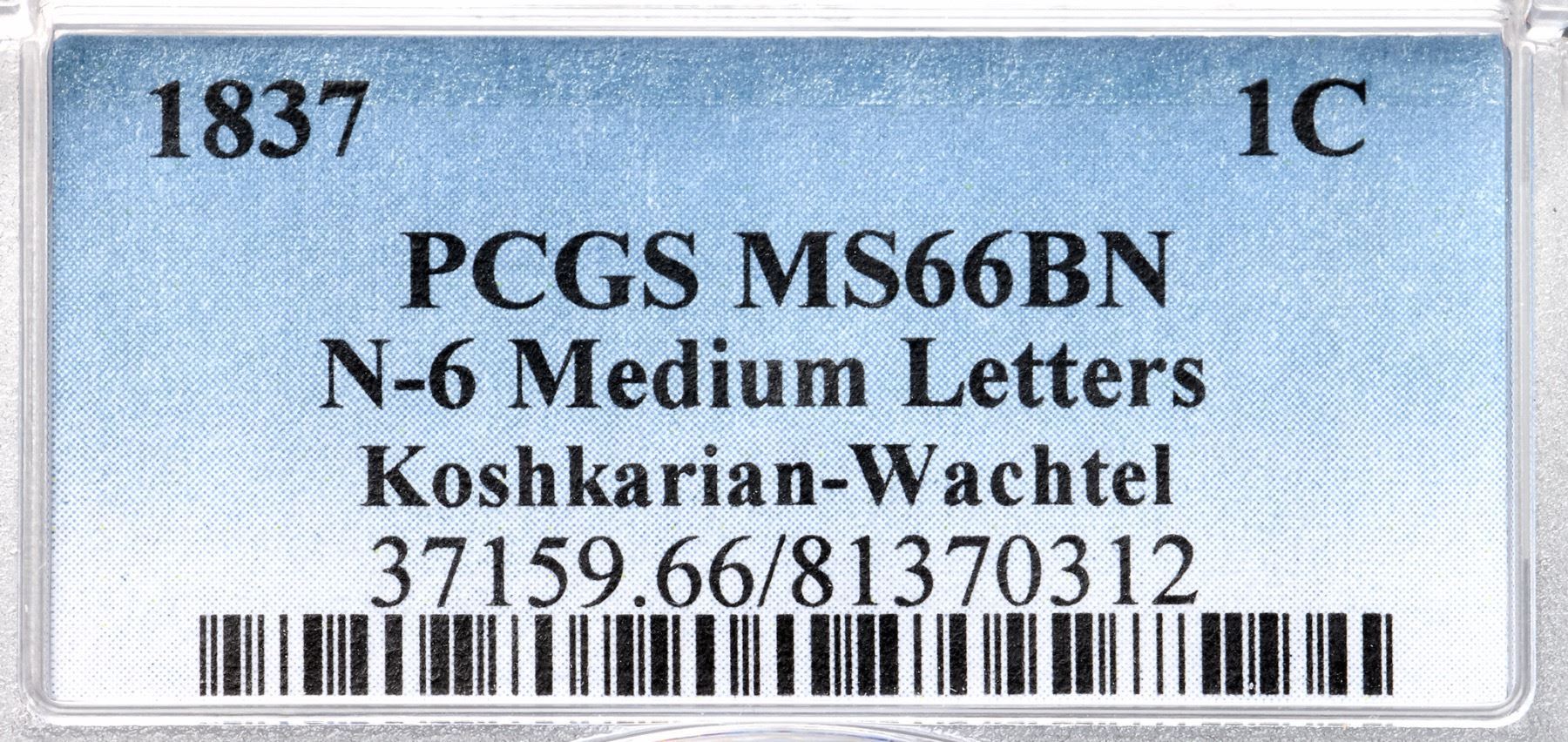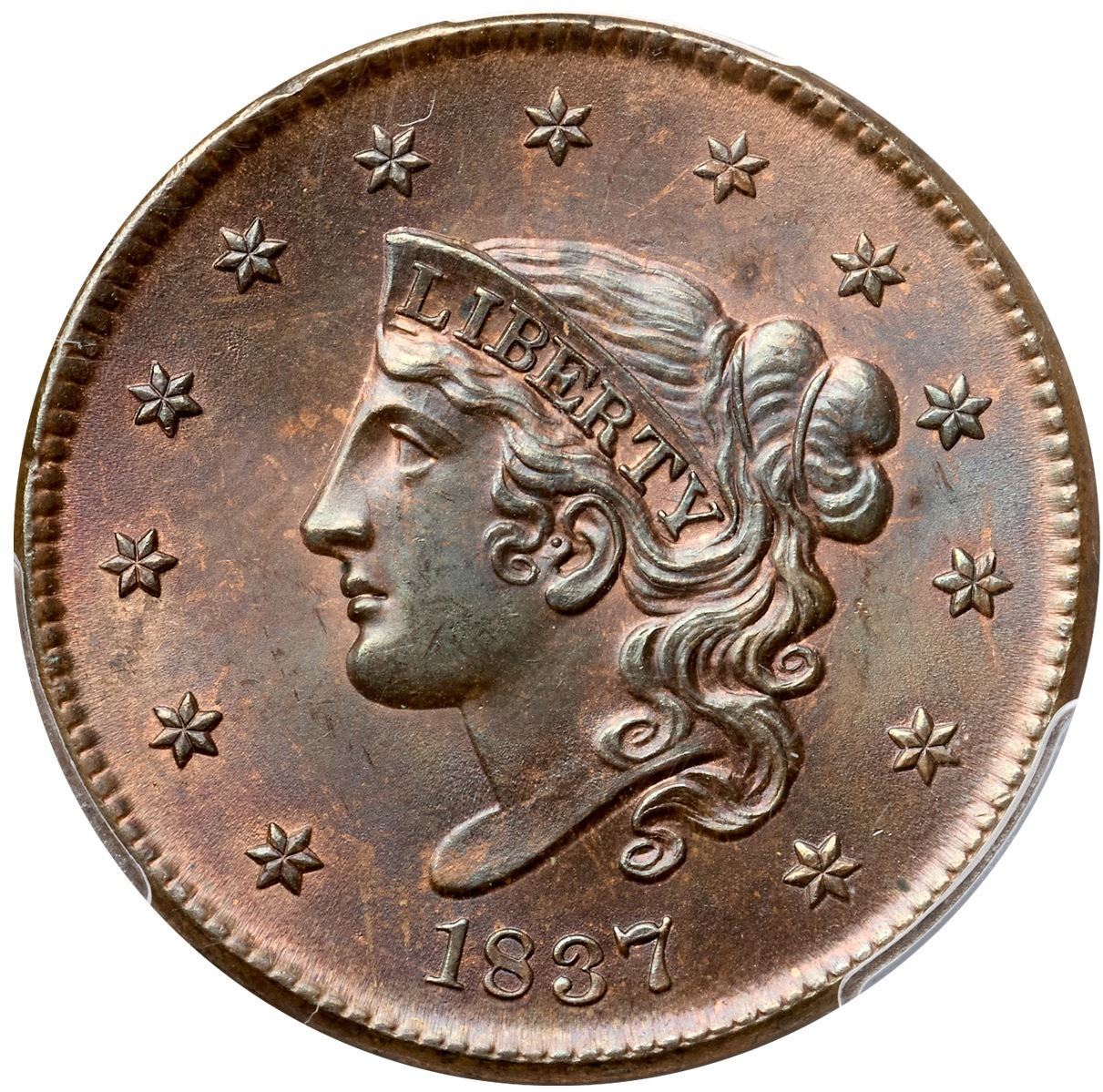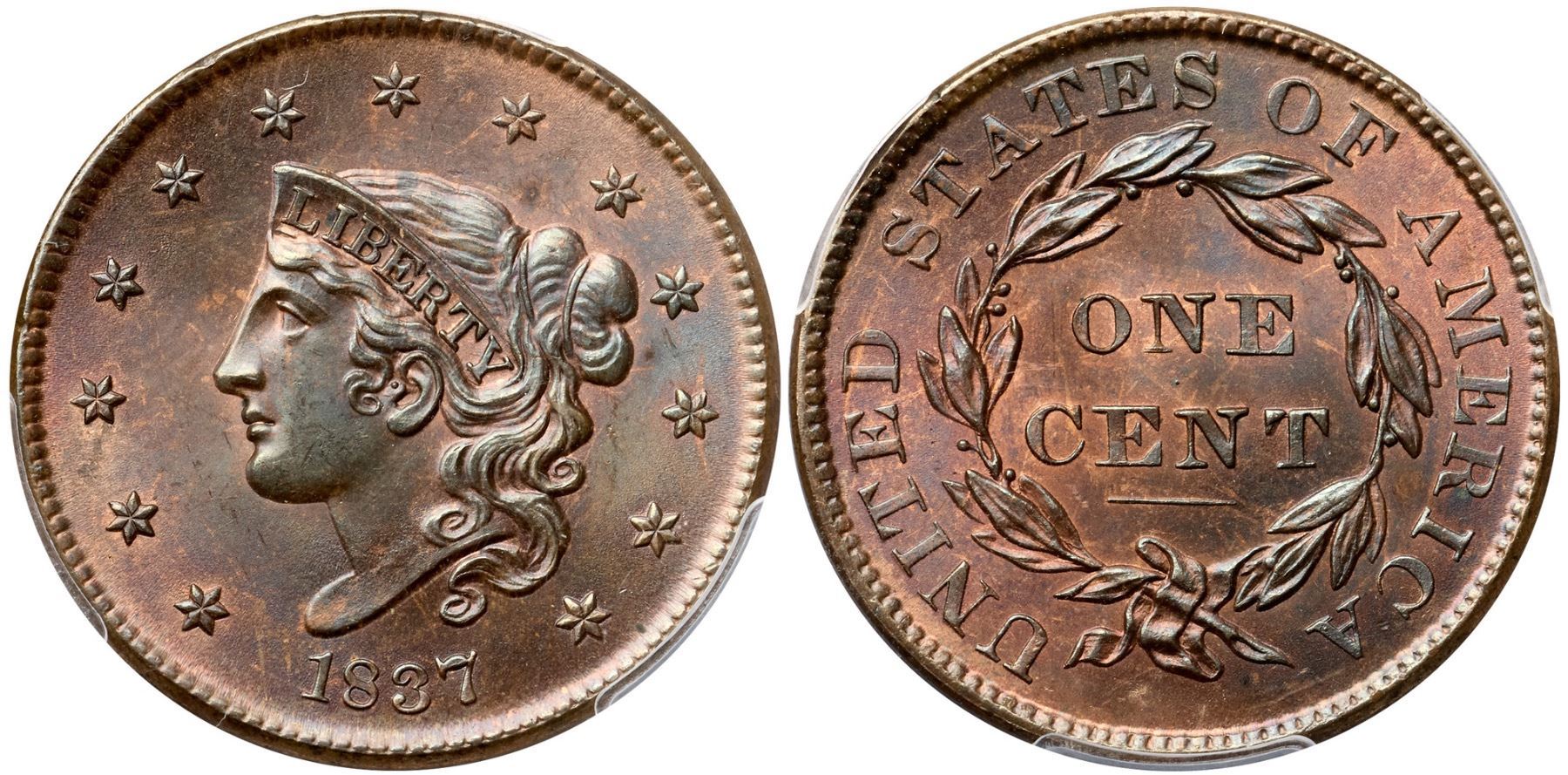 1837 N-6 R2 Plain Hair Cord, Medium Letters, PCGS graded MS66 BrownBeautiful lustrous bluish steel and light olive with at least 20% of the planchet showing faded mint red, mostly on the reverse. Must have been close to getting an "RB" designation from PCGS. Unbroken satiny mint frost covers this cent and the eye appeal is outstanding. Just a few trivial marks from flawless. A light nick or planchet flake on the rim at star 6, a tiny speck of carbon at the dentils right of star 13, and a barely visible scratch between the I & T in UNITED are good identifying marks. Sharply struck MDS, die state b. Die lapping has removed the tiny lumps around the outside berry under TE in UNITED, but a few remain tucked tightly around the berry left of the bottom of the C in CENT. A wonderful cent that comes with an excellent provenance. Our grade is MS63+, close to MS64. Noyes says MS63 and tied for CC#1, his photo #36383. The attribution and Koshkarian provenance are noted on the PCGS label. (The slab is a bit scuffed.)Certificate Number: 37159.66/81370312Pedigree: Ex Willard C. Blaisdell (from his date set) 9/1976 (via Del Bland)-R. E. "Ted" Naftzger, Jr., McCawley & Grellman Auctions/Superior 1/25/2004:1411-Chris McCawley 9/2004-Haig Koshkarian, McCawley & Grellman Auctions/Goldbergs 2/12/2017:110-Chris McCawley-Doctor Thomas Wachtel Collection, Early Cents Auctions, 7/1/2023:163-Terry S. Denman Collection