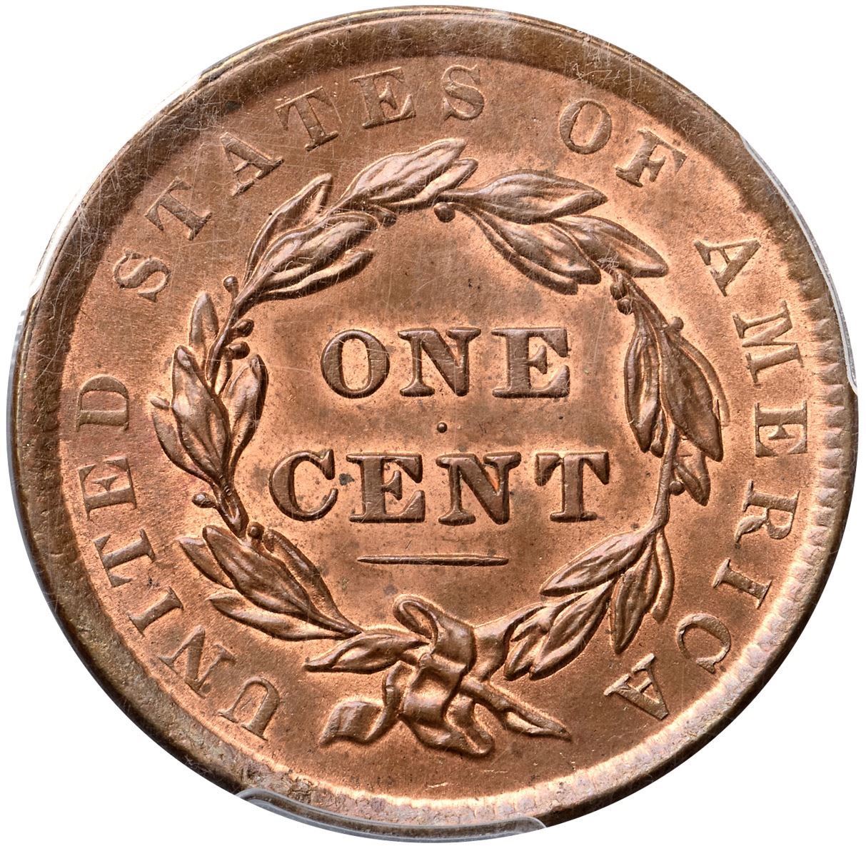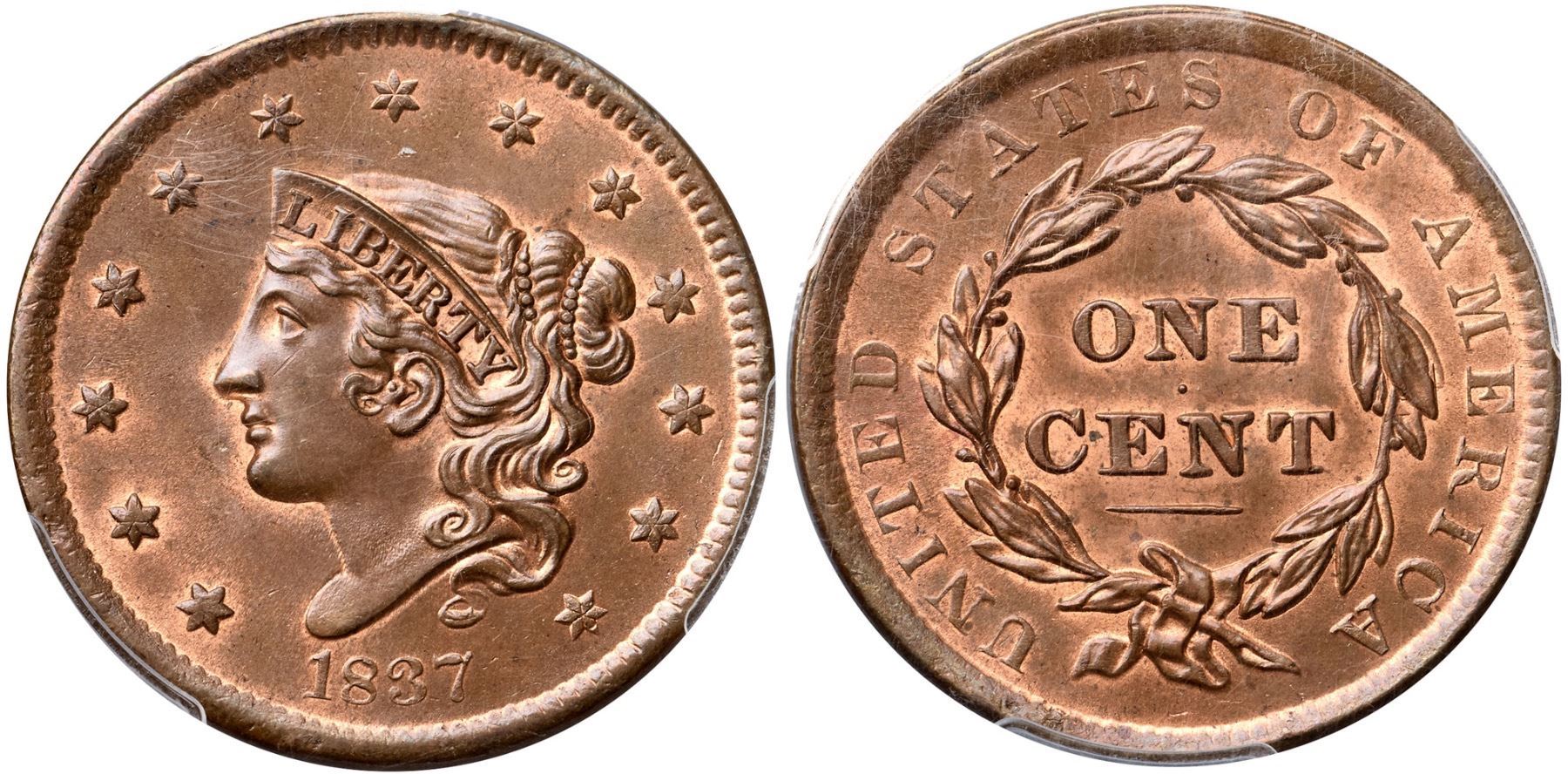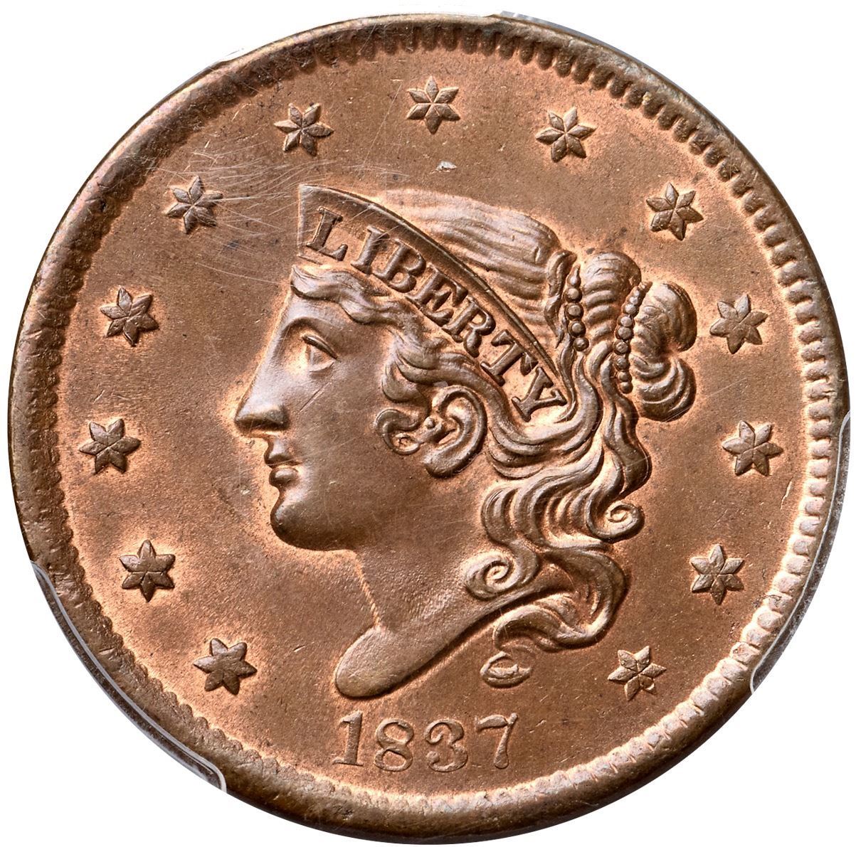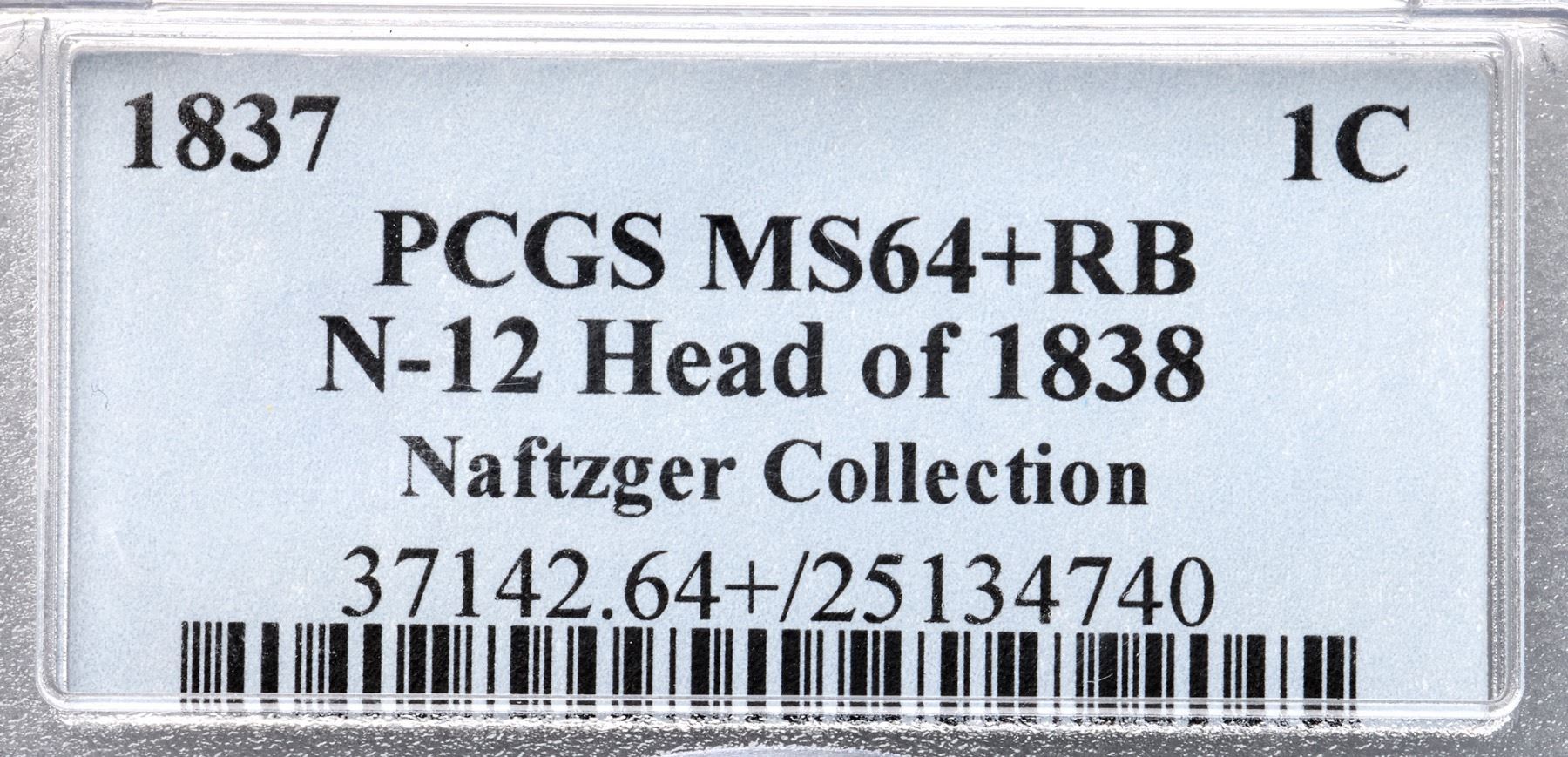 1837 N-12 R3 Beaded Hair Cord, PCGS graded MS64+ Red & BrownChoice lustrous medium brown and light chocolate with at least 15% of the original mint color remaining, mostly on the reverse. The fields are satiny and the eye appeal is very nice. The notable marks are a tiny planchet flake in the field off the lower lip and a speck of dark toning between the C & E in CENT. LDS. Die wear and lapping have weakened the peripheral details so they are in lower relief and the curl over the 7 in the date is severed. The stray E punched into the wreath under the E in AMERICA, the so-called "Accessory E," is clear. Called MS63 and tied for CC#4 in the Noyes census, his photo #21341. Bland says MS63 and tied for CC#3 in his census. Our grade is MS64. (The holder is scuffed.)Certificate Number: 37142.64+/25134740Pedigree: Ex Gordon J. Wrubel 1978-C. Douglas Smith-Herman Halpern, Stack's 3/16/1988:504-R. E. "Ted" Naftzger, Jr.-Naftzger Estate, McCawley & Grellman Auctions/Goldbergs 2/1/2009:391-Paul Gerrie, McCawley & Grellman Auctions/Goldbergs 5/27/2012:49-Terry S. Denman Collection