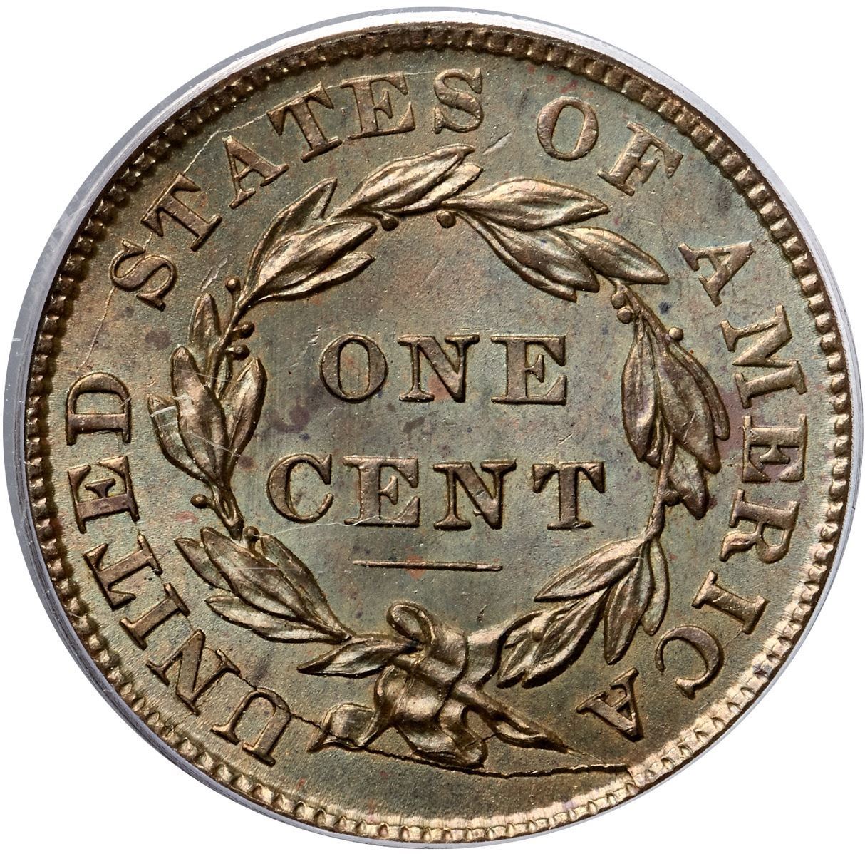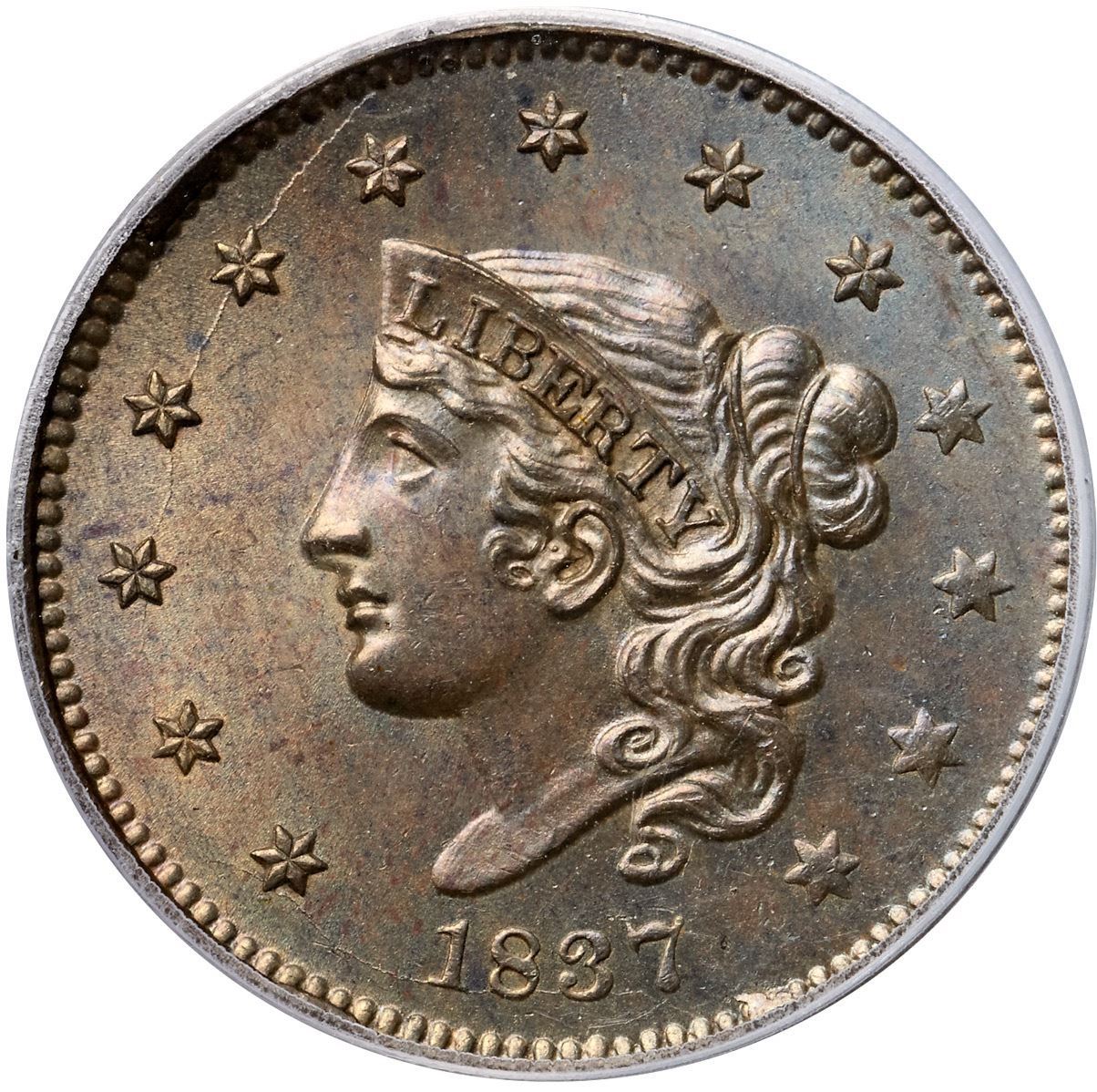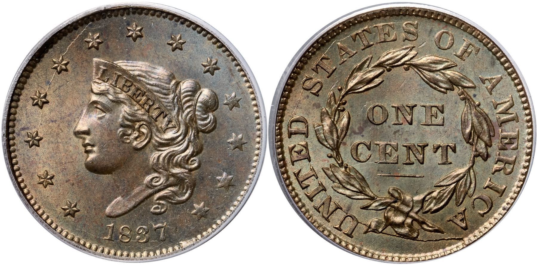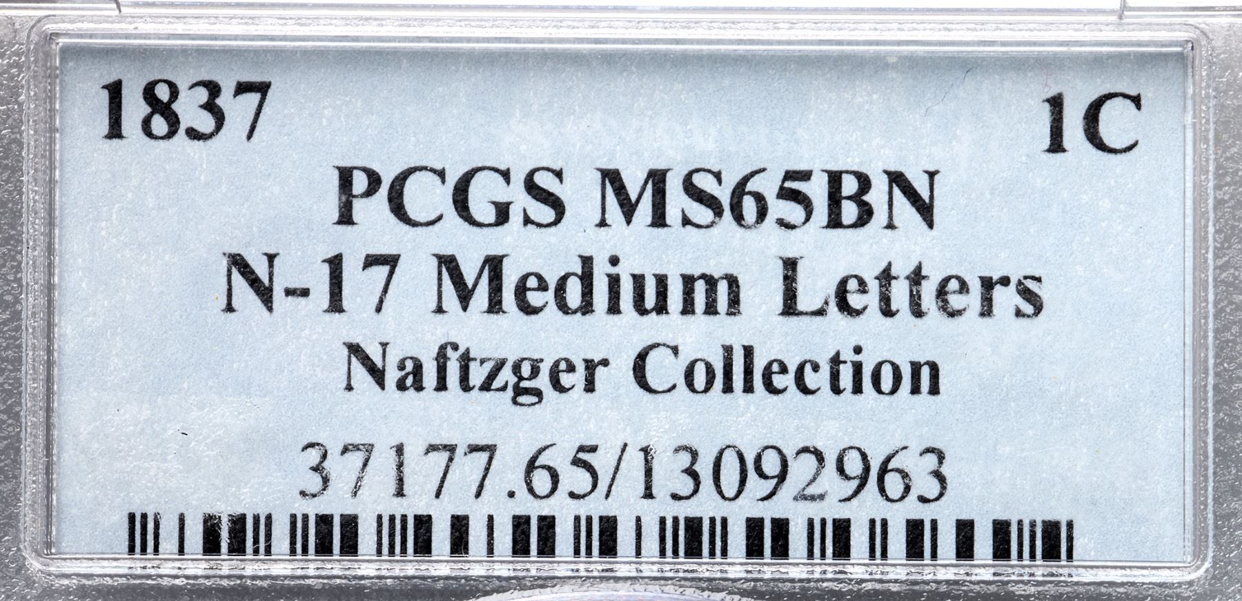 1837 N-17 R4 Plain Hair Cord, Medium Letters, PCGS graded MS65 BrownLustrous very light olive and sea green with subtle overtones of light bluish steel, especially on the right side of the obverse. The fields are covered with satiny mint frost and the eye appeal is really nice. Just a few minor marks including a small diagonal nick off the leaf tip under the second S in STATES, a small splash of reddish steel toning at ME, and another over the C in CENT. M-LDS, die state i early, with a slightly raised retained cud break at the bottom of the wreath, strongest just below the end of the wreath stem. In addition there is a small rim cud break between the date and star 13. (In the late state, this cud right of the date extends to under the 7 and the retained cud on the reverse is raised significantly higher.) In this die state the die faces are more nearly parallel so the strike is relatively even, although not perfectly so as the upper left is still more strongly struck than the lower right. Called MS63 and CC#1 in the Noyes census, his photo #21122. Bland also says MS63 but CC#2 in his list. Our grade is MS63.Certificate Number: 37177.65/13092963Pedigree: Ex Judge Joseph Sawicki, Stack's 2/27/1954:678-Emanual Taylor 10/1960-R. E. "Ted" Naftzger, Jr.-Naftzger Estate, McCawley & Grellman Auctions/Goldbergs 2/1/2009:401-Chris McCawley-Terry S. Denman Collection