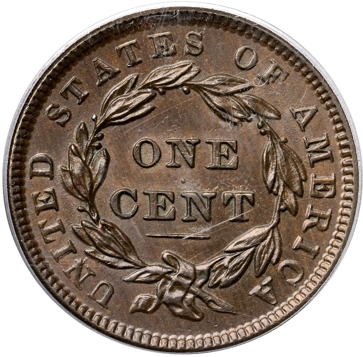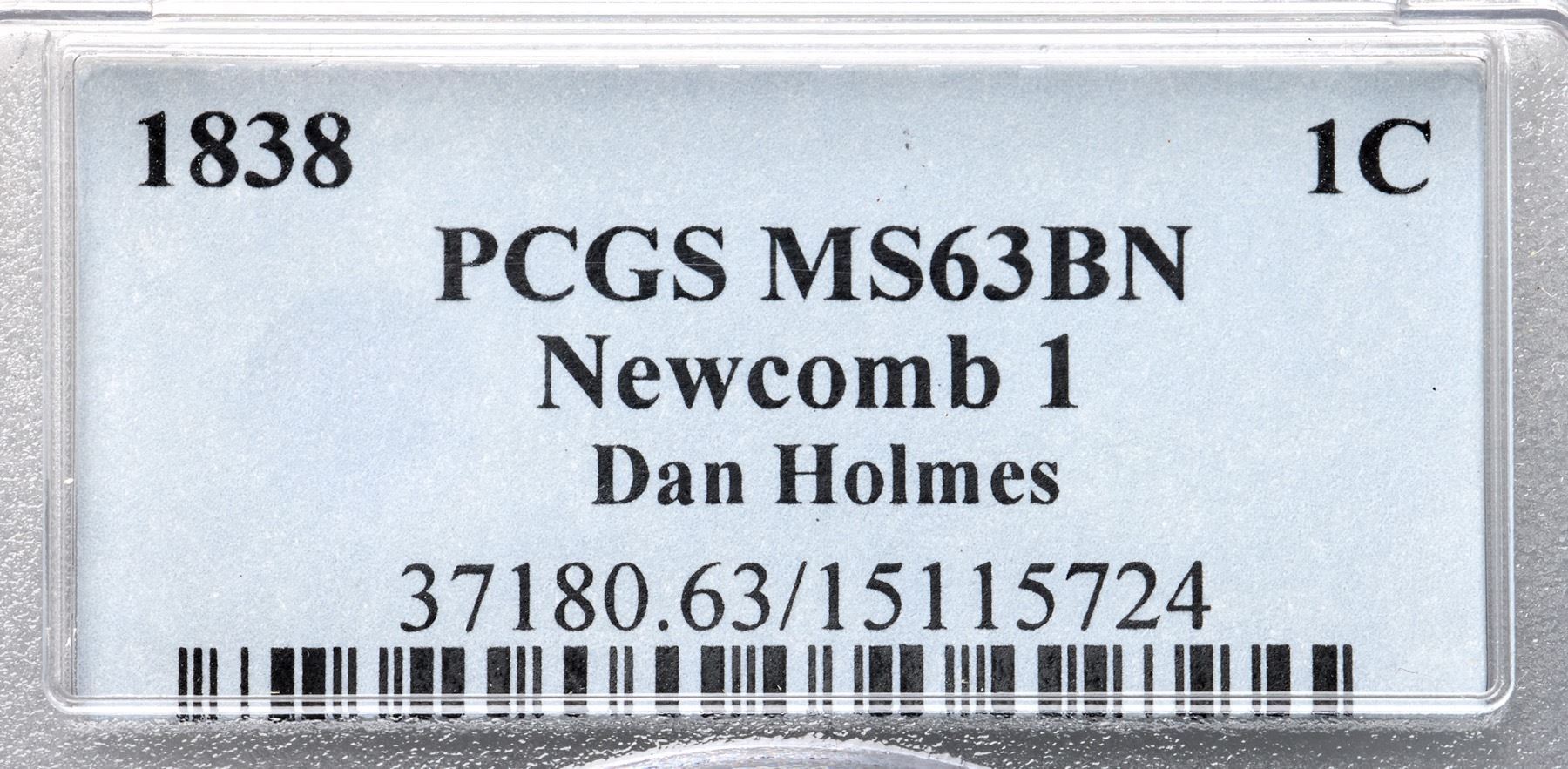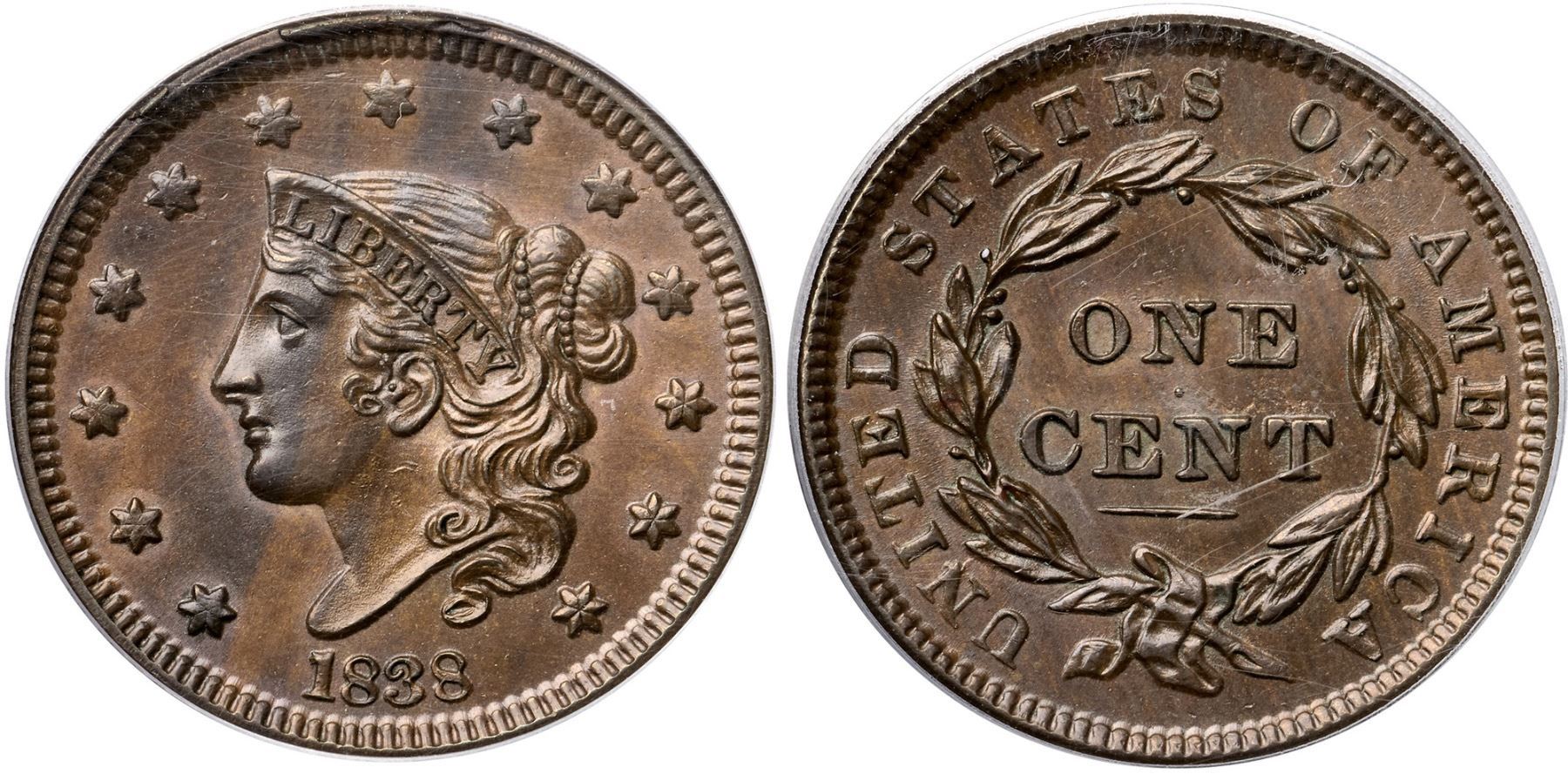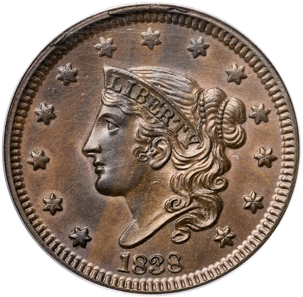 1838 N-1 R1 PCGS graded MS63 BrownLustrous light brown woodgrained with darker steel brown tones on the left half of the obverse. No spots or contact marks. A group of very tiny low spots caused by debris on the die shows over NT in CENT. M-LDS, die state e, with a small rim cud over star 5 and a larger one from above star 6 to right of star 7. The repunching on the left side of the I in UNITED is strong. Called MS61 in the Noyes census, his photo #37109. Our grade is MS60+.Certificate Number: 37180.63/15115724Pedigree: Ex 1983 EAC Sale, lot 445-Daniel W. Holmes, Jr., McCawley & Grellman Auctions/Goldbergs 5/30/2010:505-Terry S. Denman Collection
