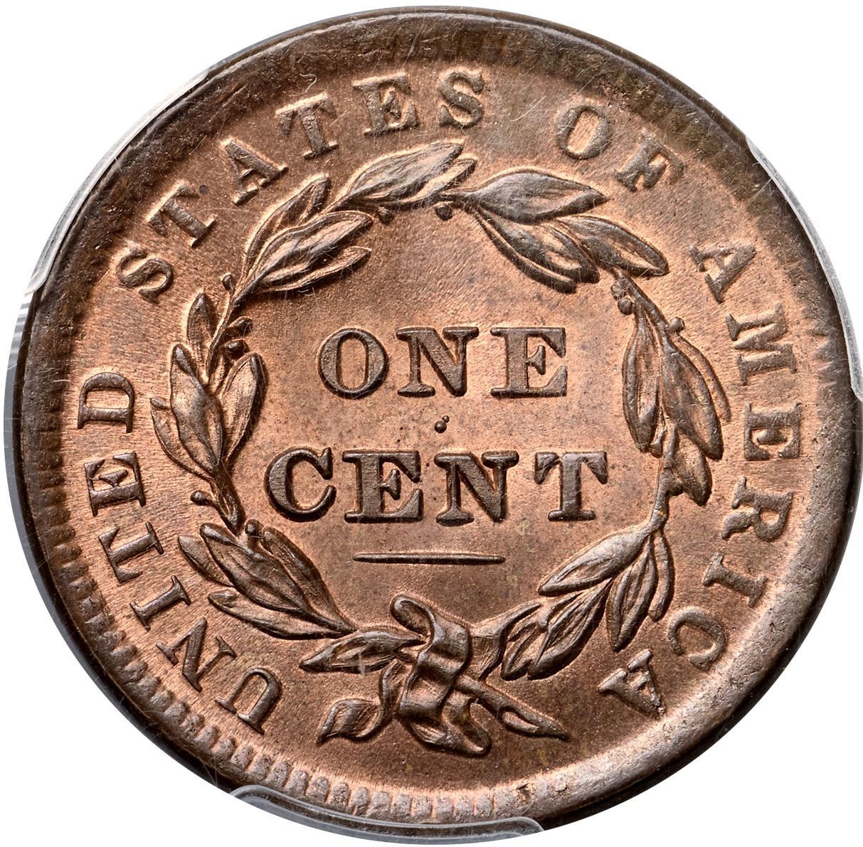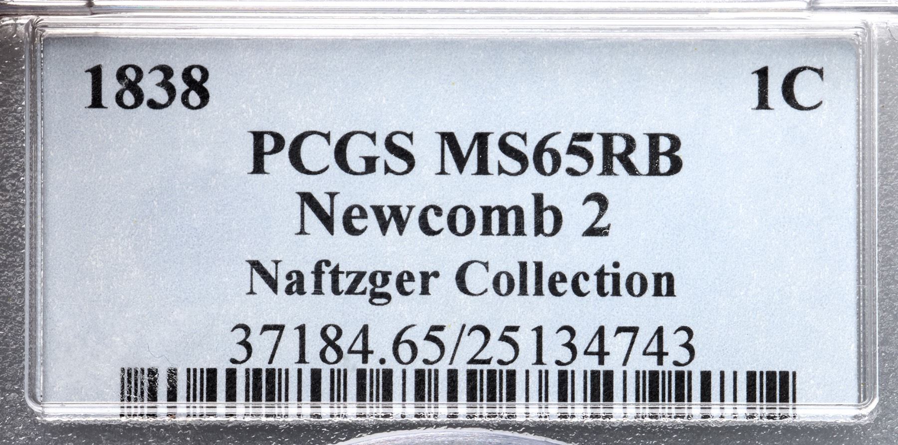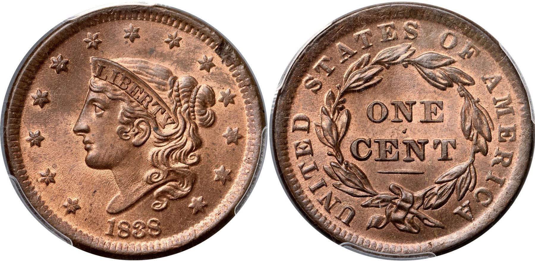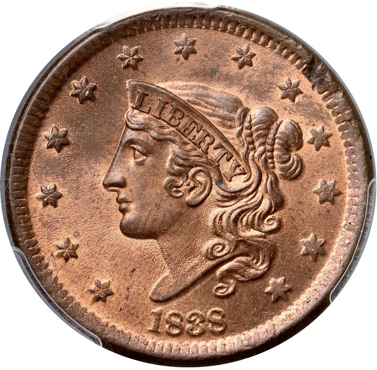 1838 N-2 R1 PCGS graded MS65 Red & BrownLustrous bright mint red fading to light steel brown on the highpoints, at least two-thirds of the mint color remaining. A monster gem cent except for a shallow planchet void from impurity in the planchet metal on the edge at star 9 (as struck). Otherwise the only marks are faint traces of an old fingerprint around star 5 and a speck of dark toning in the hair under the Y in LIBERTY. This cent has great eye appeal, essentially flawless except for the small planchet defect. Fortunately that mint flaw does not affect any of the devices. M-LDS, die state b late, with traces of the inner circle still visible at the top of the obverse. Called MS65 and tied for CC#1 in the Bland census list. Noyes says either MS65 (one list), MS63 (another list), or MS60 net AU50 (different photos of the same coin under a different photo number, which shows why grading from photos can be troublesome), his photo #20995. Our grade is MS65.Certificate Number: 37184.65/25134743Pedigree: Ex Milton A. Holmes, Stack's 10/5/1960:1584-Louis Helfenstein, Lester Merkin 8/14/1964:174-A. Lovi-Robert Batchelder-Jerry A. Bobbe-Myles Z. Gerson-Denis W. Loring-Stanley Kesselman-R. E. "Ted" Naftzger, Jr.-Naftzger Estate, McCawley & Grellman Auctions/Goldbergs 2/1/2009:405-Paul Gerrie, McCawley & Grellman Auctions/Goldbergs 5/27/2012:51-Terry S. Denman Collection