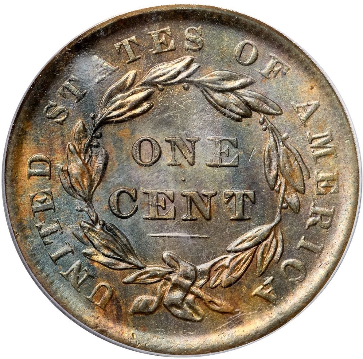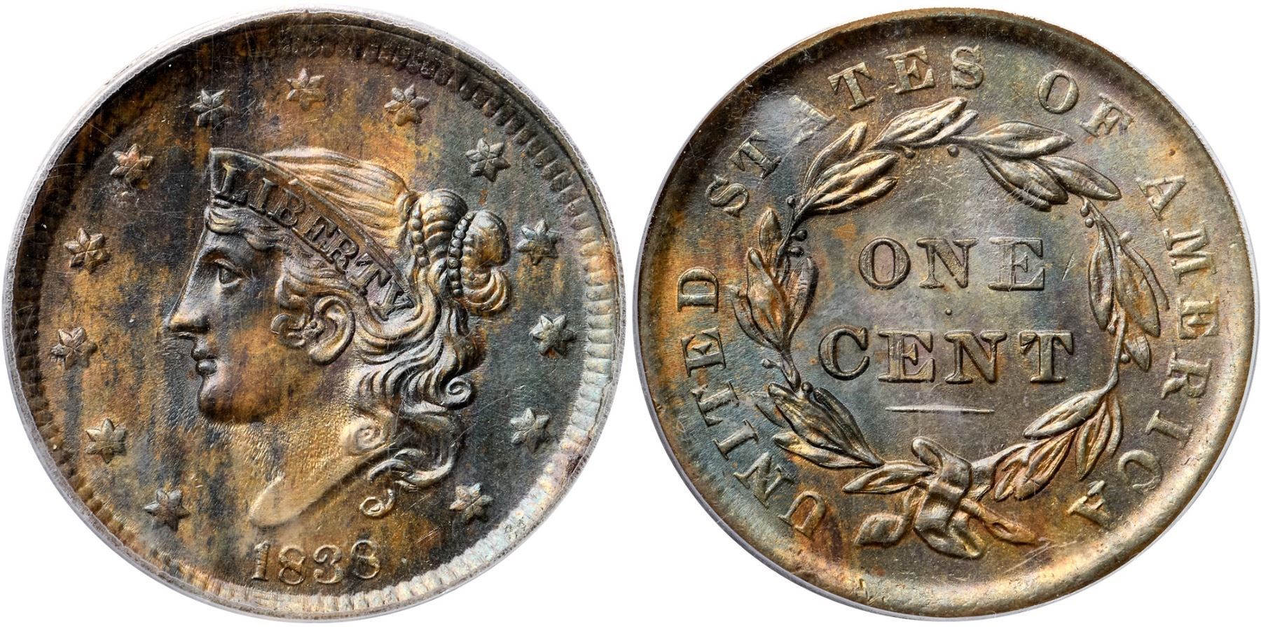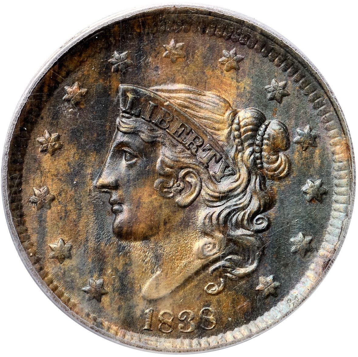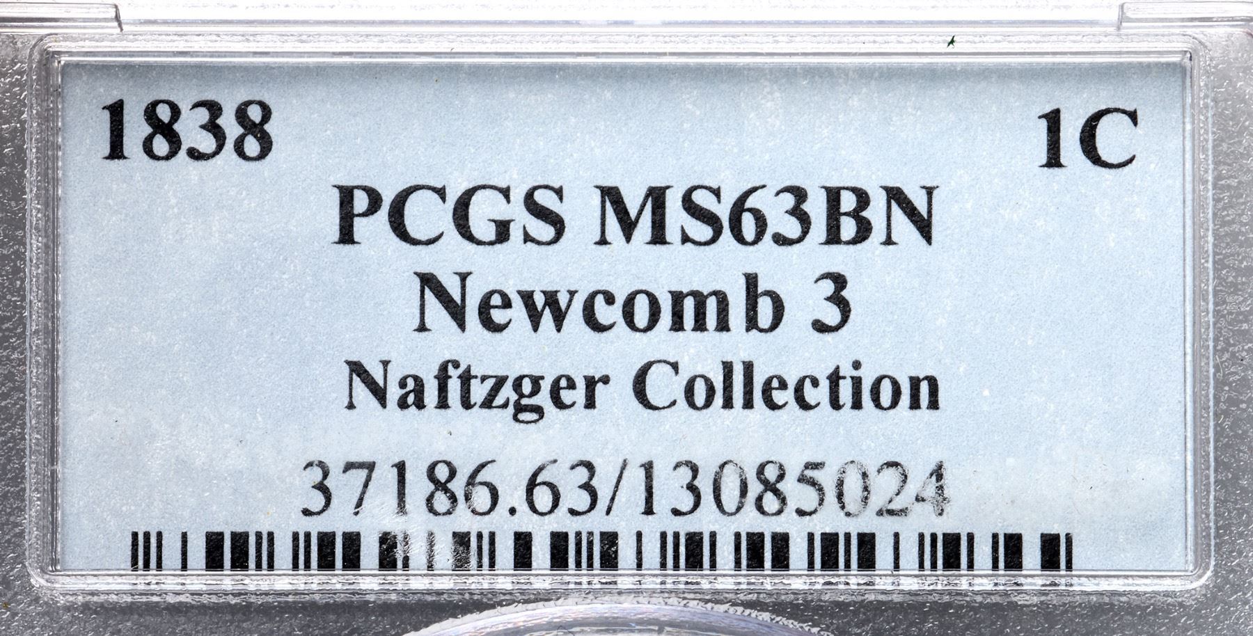 1838 N-3 R1 PCGS graded MS63 BrownLustrous woodgrained mix of light golden brown and tan mixed with dark bluish steel and olive. The contrast is rather dramatic between the light and dark tones, and the abrupt color changes hurt the eye appeal. The only mark is a planchet flake on the rim just below star 12. M-LDS, die state d late, with the dies well worn and a strong rim cud break at star 12 halfway up to star 11. The upper lump in the so-called colon center dot on the reverse is weak and barely visible. Called MS63 and CC#2 in the Bland census. Noyes says MS60 and tied for CC#7, his photo #20760. Our grade is MS60.Certificate Number: 37186.63/13085024Pedigree: Ex Denis W. Loring-R. S. "Robbie" Brown, Jr., Superior 9/30/1986:854-R. E. "Ted" Naftzger, Jr.-Naftzger Estate, McCawley & Grellman Auctions/Goldbergs 2/1/2009:407-Chris McCawley-Terry S. Denman Collection